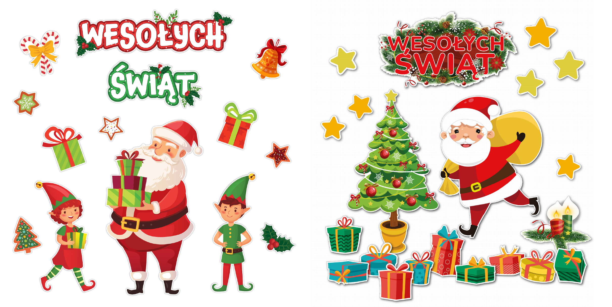 4. Dekoracje świąteczne z Mikołajami i napisem „Wesołych Świąt” – dostępne w dwóch wersjach, idealne do tworzenia świątecznych kącików, scenek i radosnych aranżacji związanych z przygotowaniami do Bożego Narodzenia. Dodają przestrzeni ciepła i pomagają budować atmosferę świątecznego oczekiwania.