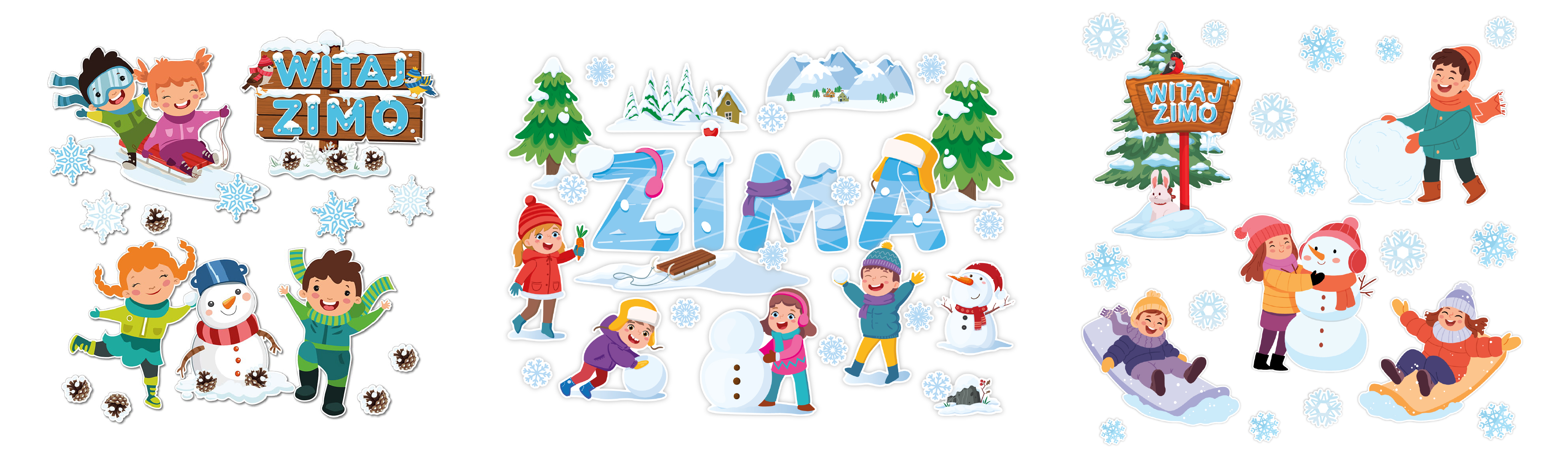 5. Zimowe krajobrazy, zabawy na śniegu i „Witaj Zimo” – to gotowe zestawy, które pozwalają w łatwy sposób stworzyć duże, efektowne dekoracje. Idealne na korytarze, wejścia, tablice tematyczne czy większe powierzchnie okienne. Dzięki nim można szybko wyczarować zimową scenerię zachęcającą dzieci do zabawy i rozmów o zimowych aktywnościach.