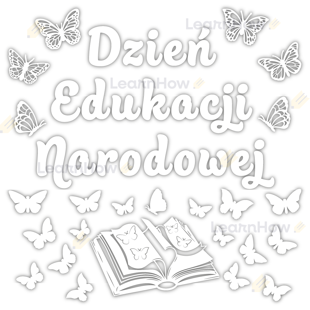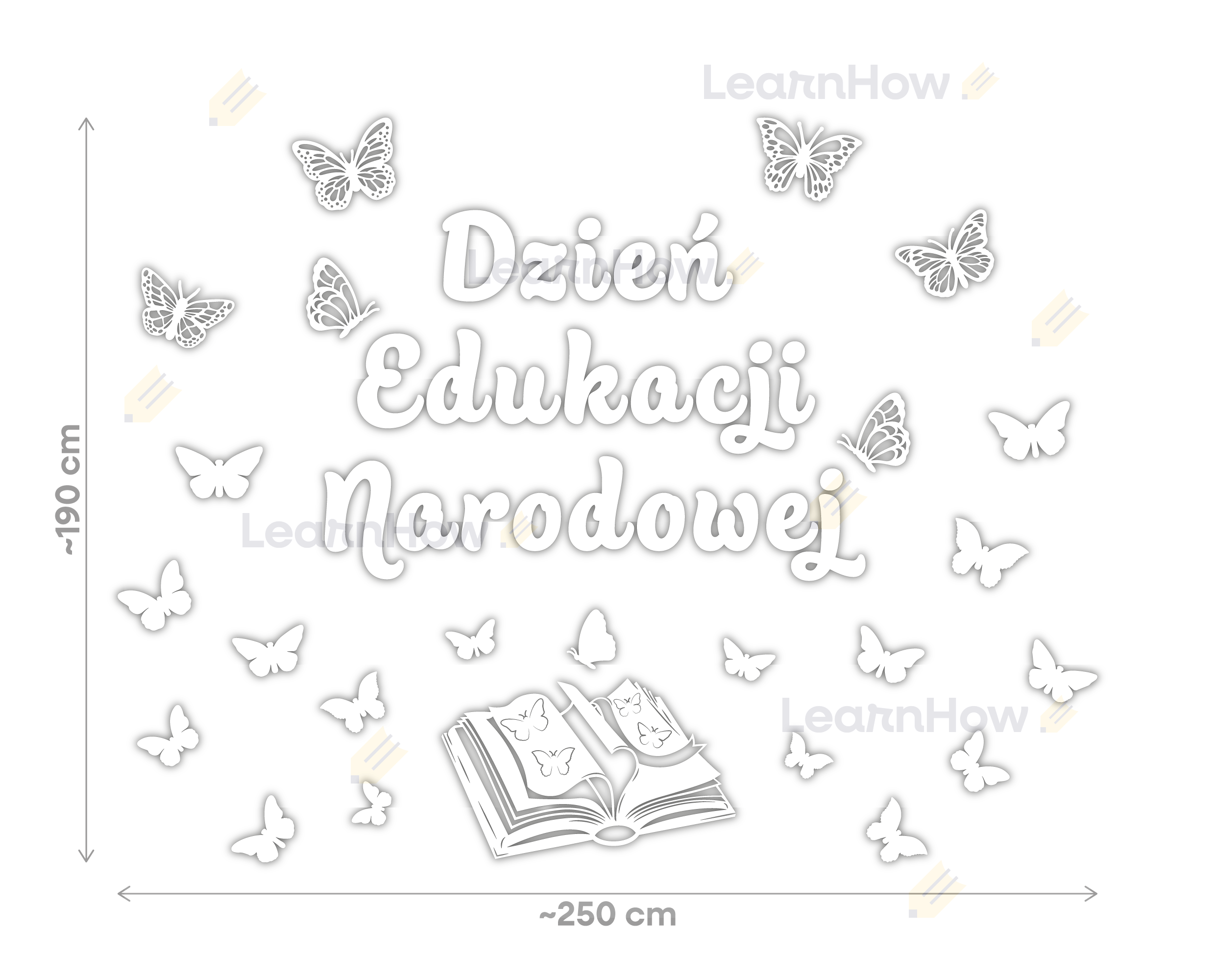 Zestaw składa się z 27 znaków tworzących napis "Dzień Edukacji Narodowej", 1 otwarta książka oraz 23 motyle.