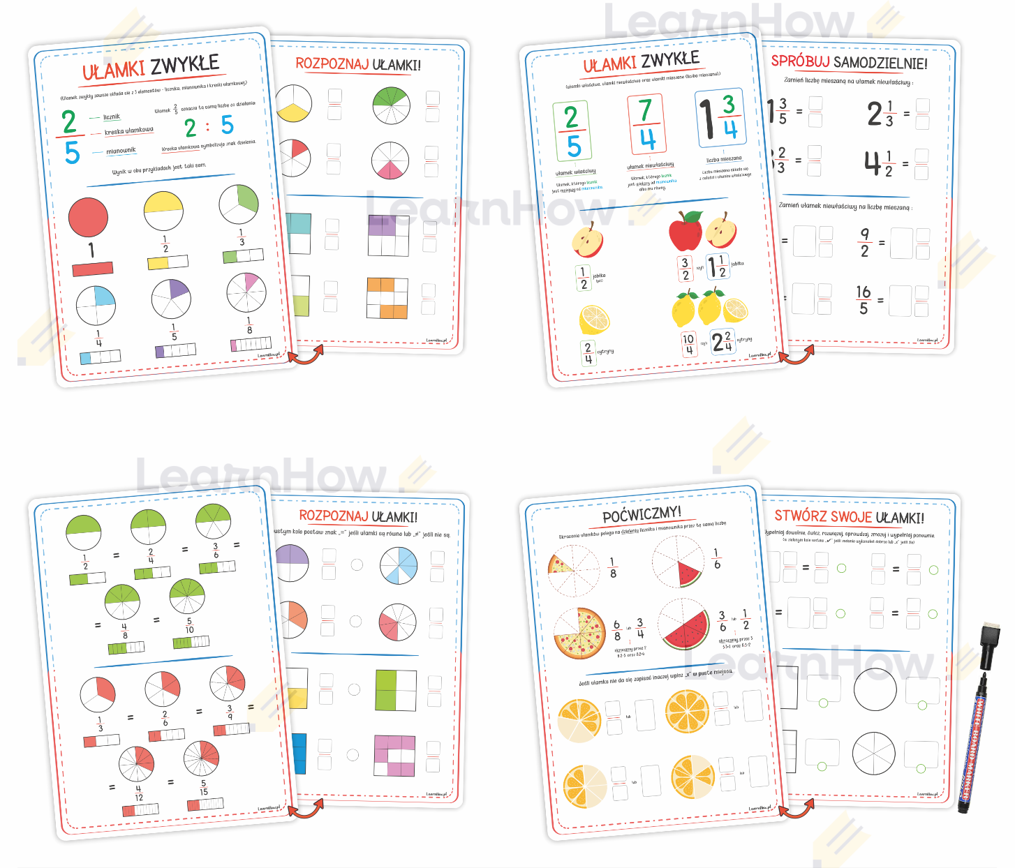 KARTY PRACY - UŁAMKI ZWYKŁE (zestaw 8 stron + pisak)