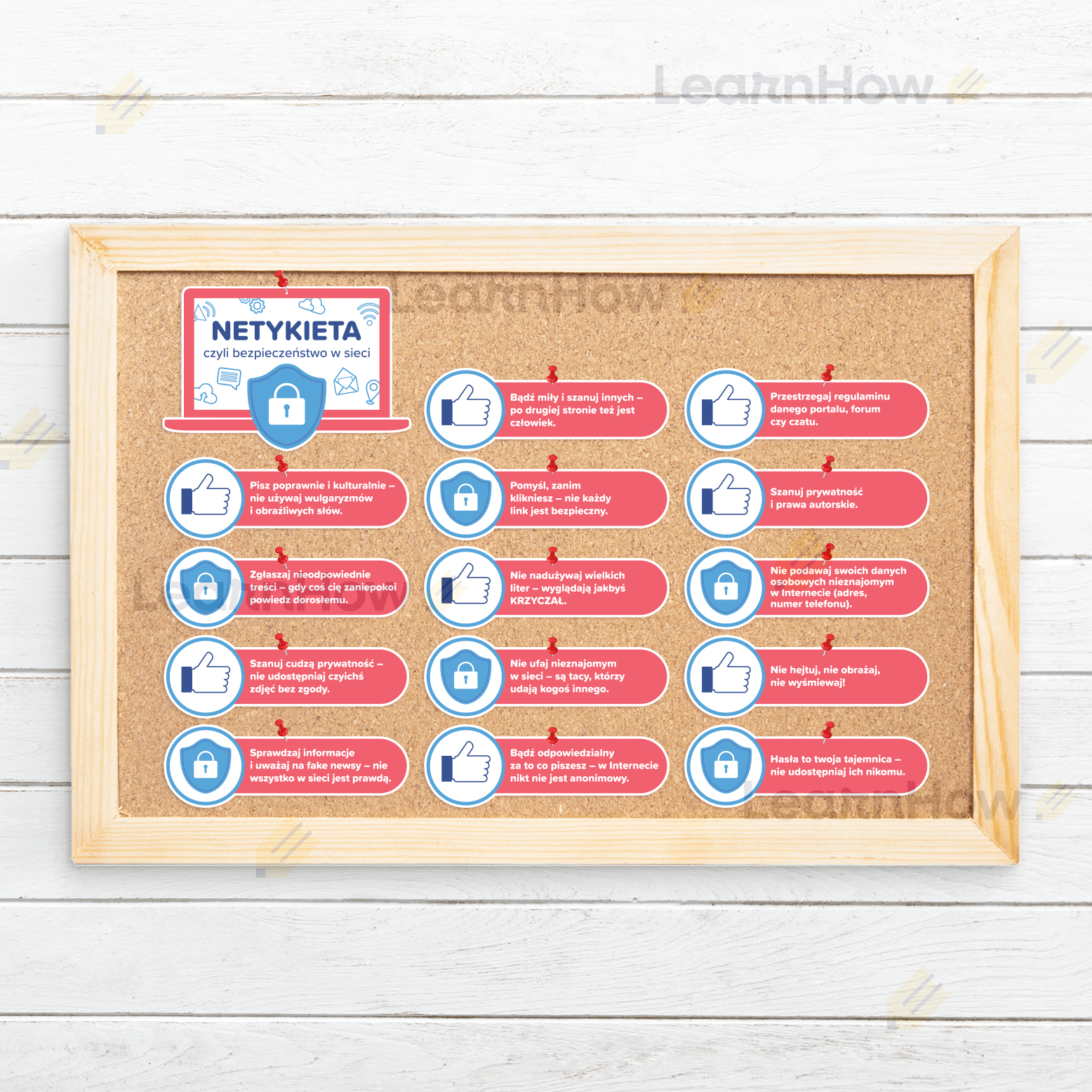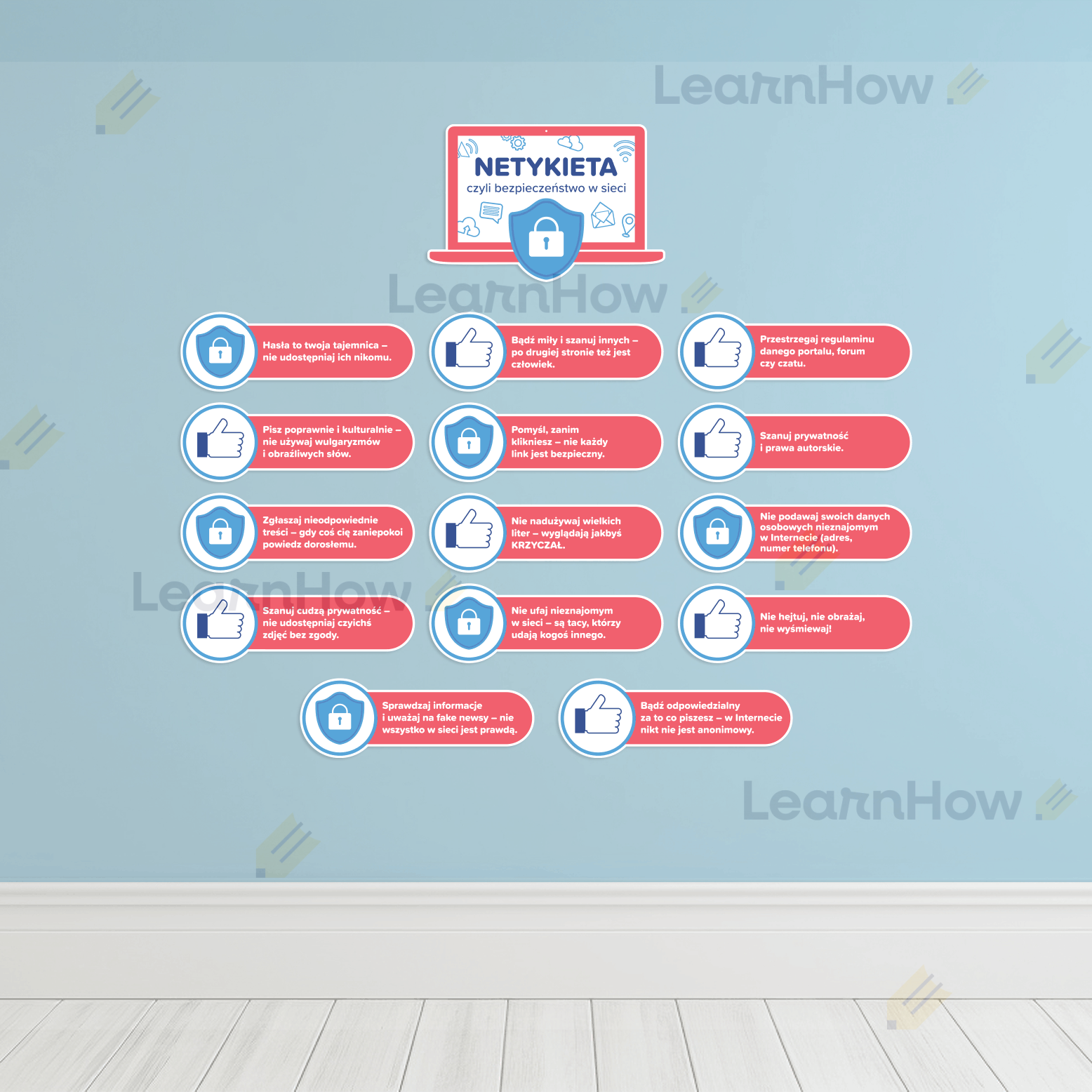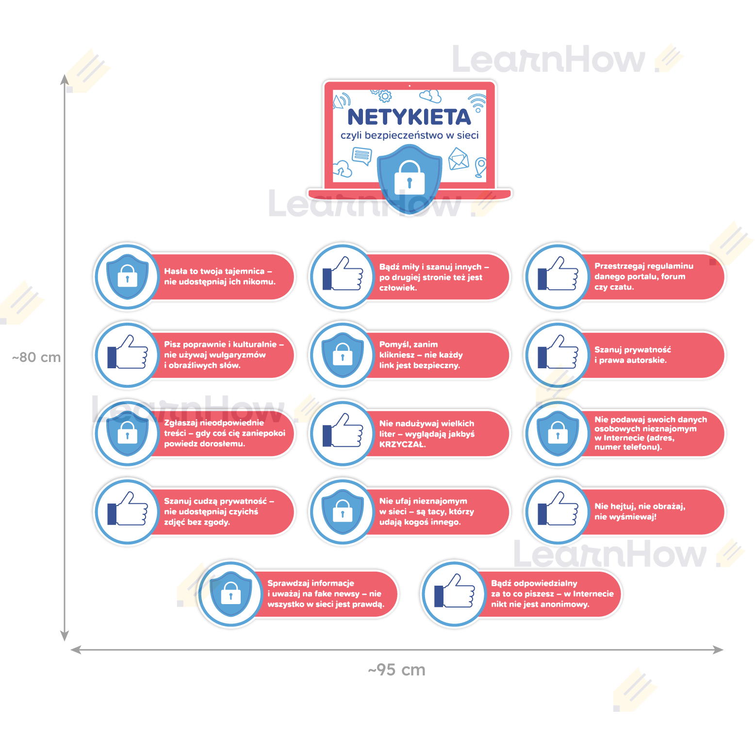 Zestaw składa się z 1 głównej tabliczki oraz 14 tabliczek z zasadami kulturalnego i bezpiecznego korzystania z Internetu.