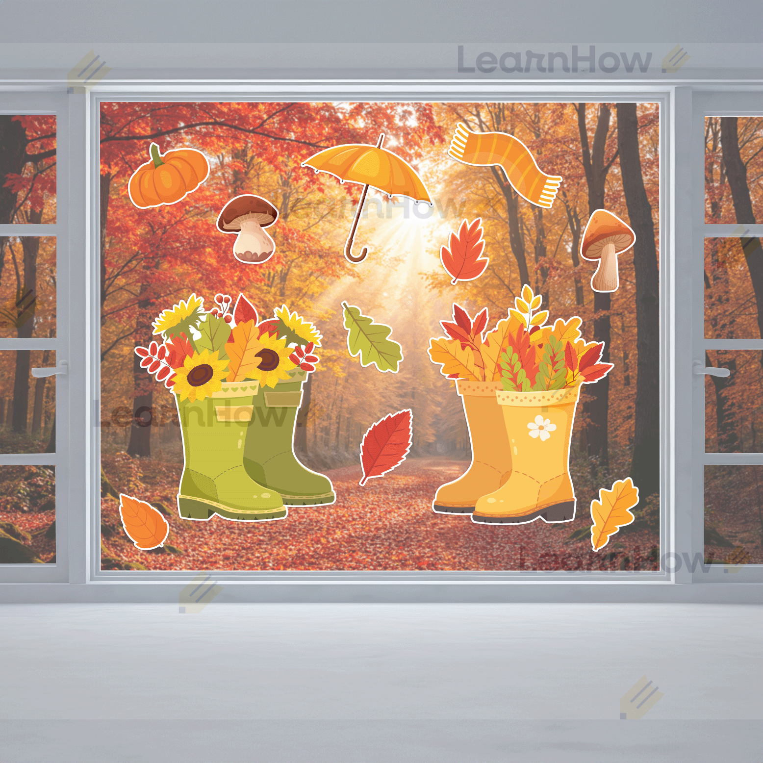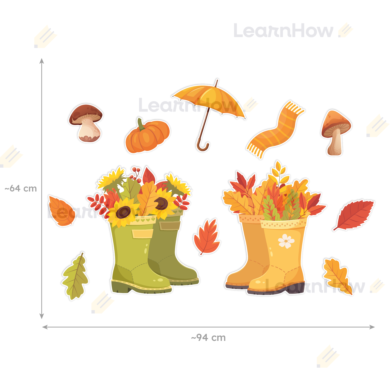 Zestaw składa się z 2 pary kaloszy wypełnionych jesiennymi liśćmi i 10 jesiennych dodatków - idealne do jesiennej dekoracji szkoły i przedszkola.
