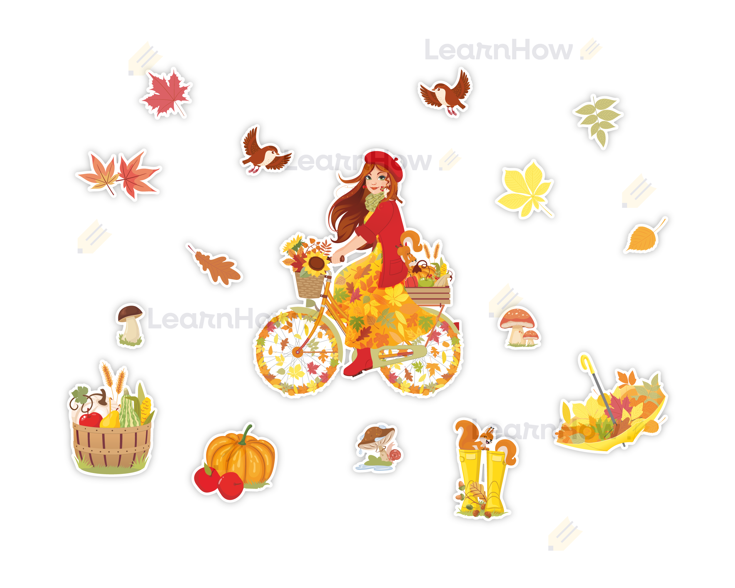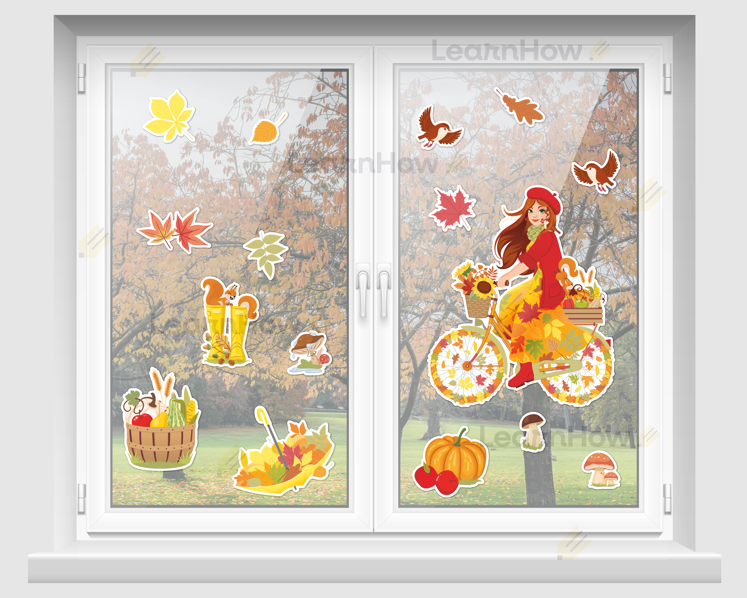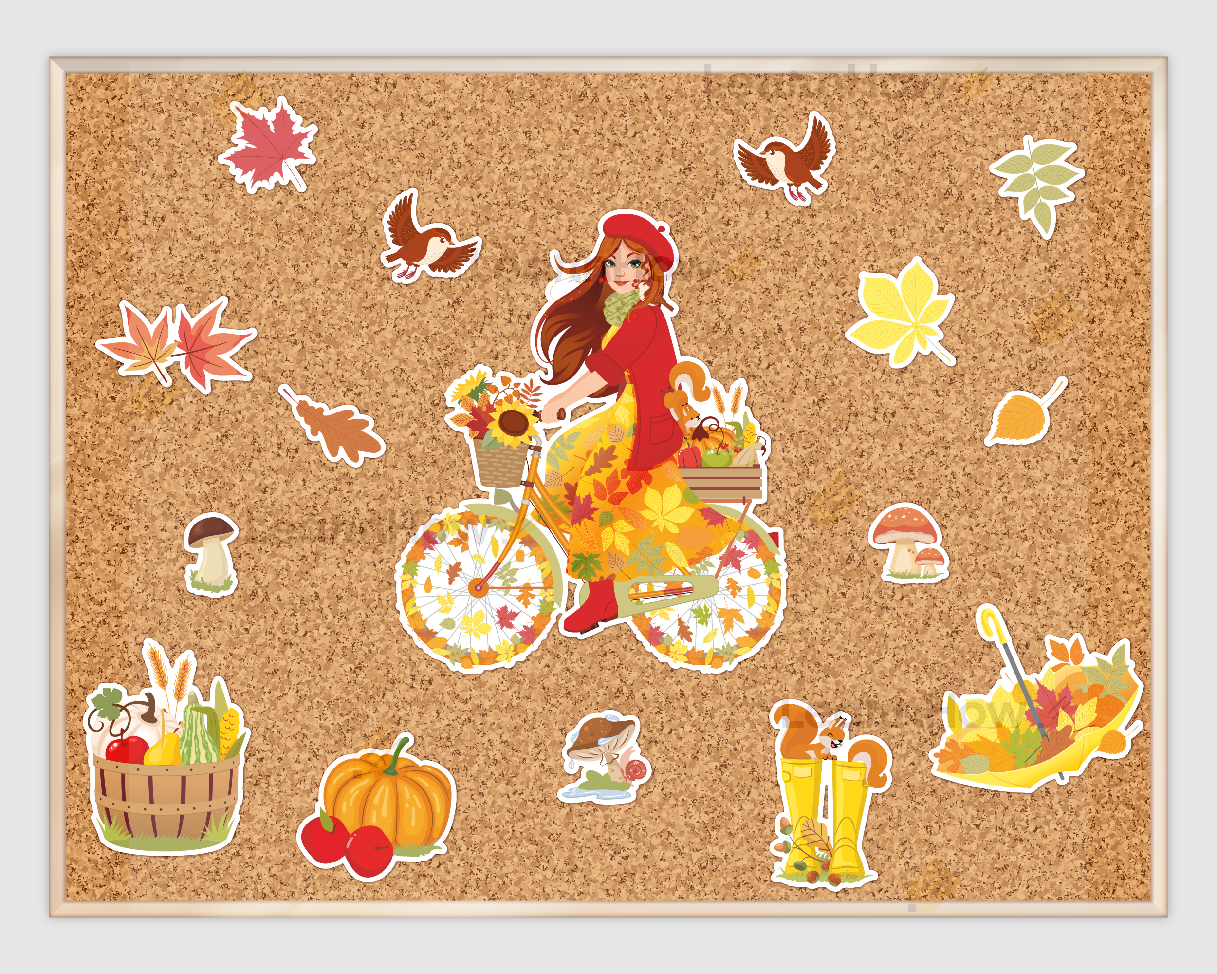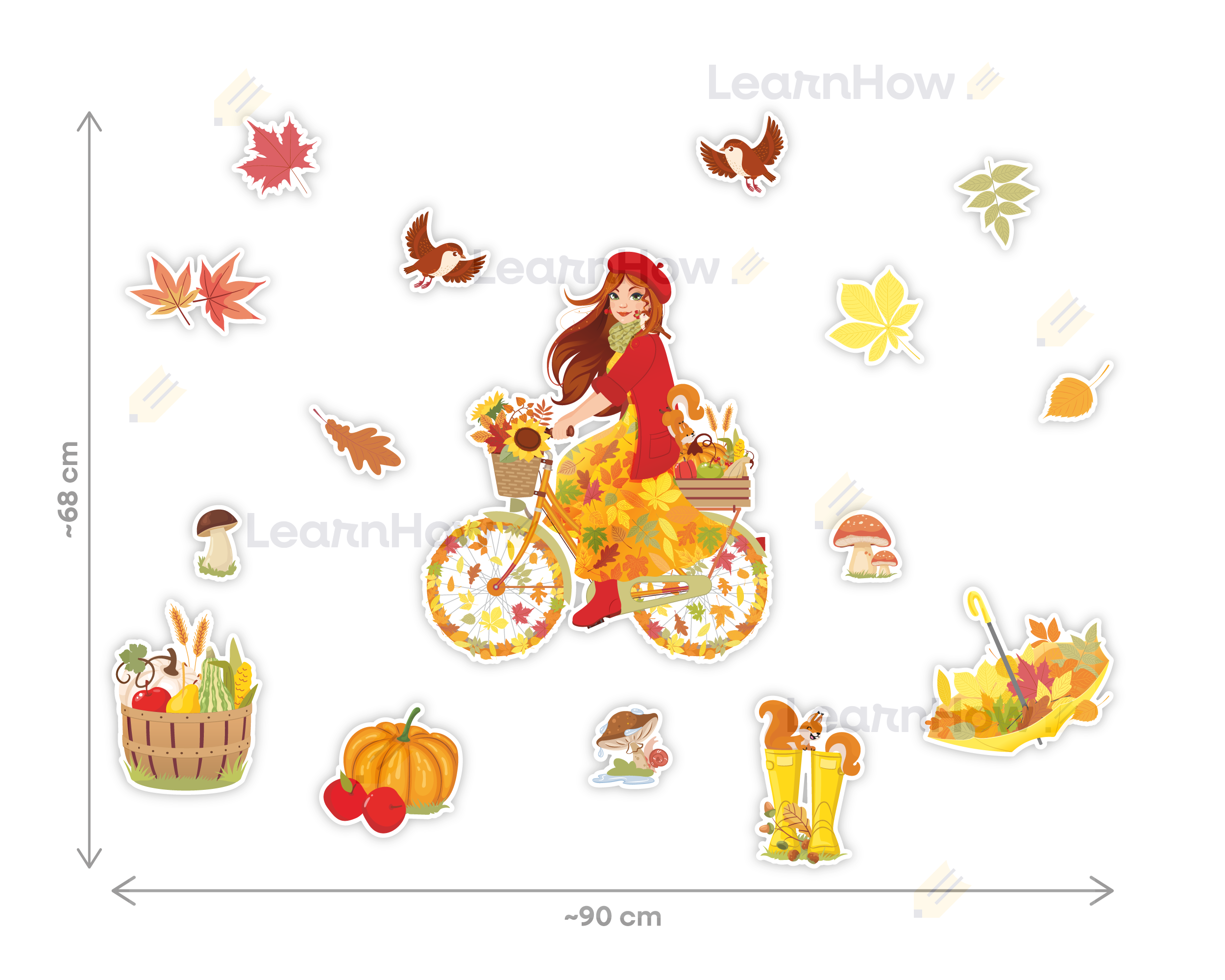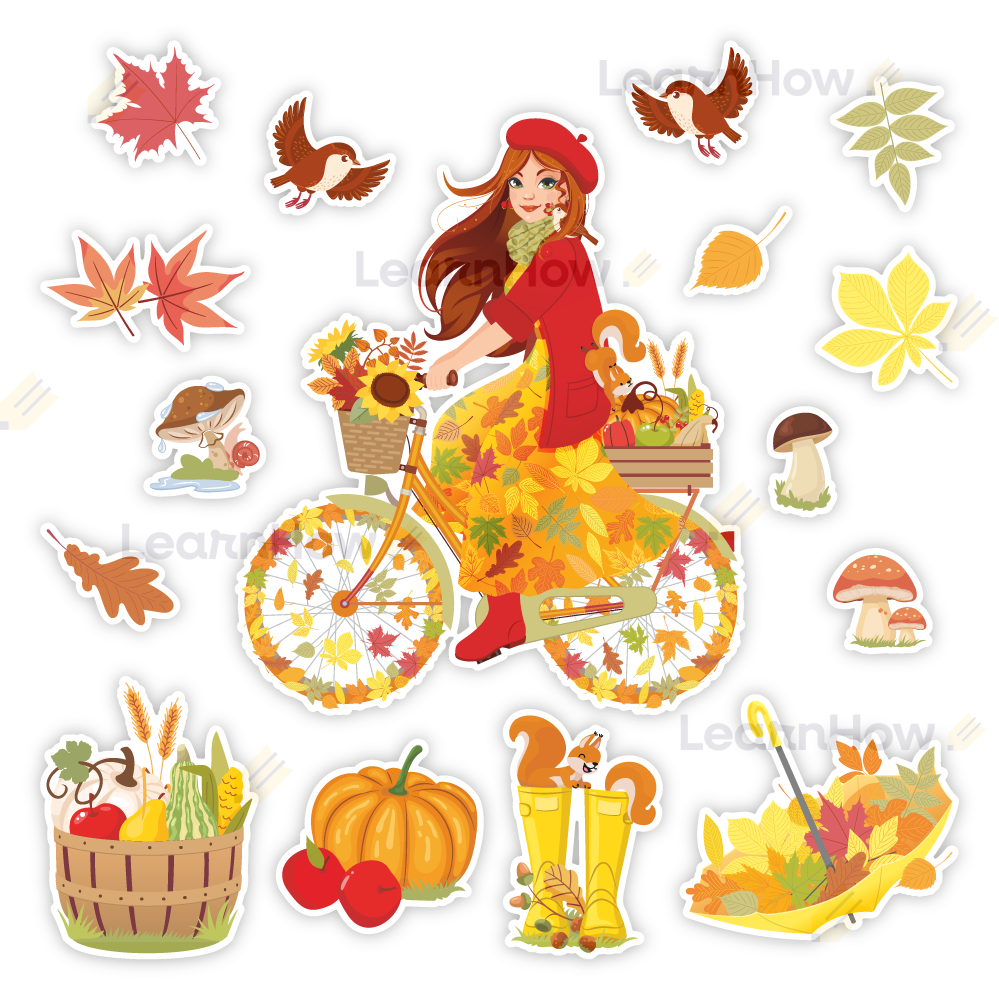 Zestaw składa się z Pani Jesieni na rowerze, 4 elementów związanych z jesienią (kosz z darami jesieni, dynia, kalosze z wiewiórką, parasol z liśćmi), 3 grzybów, 6 kolorowych jesiennych liści oraz 2 ptaszków.