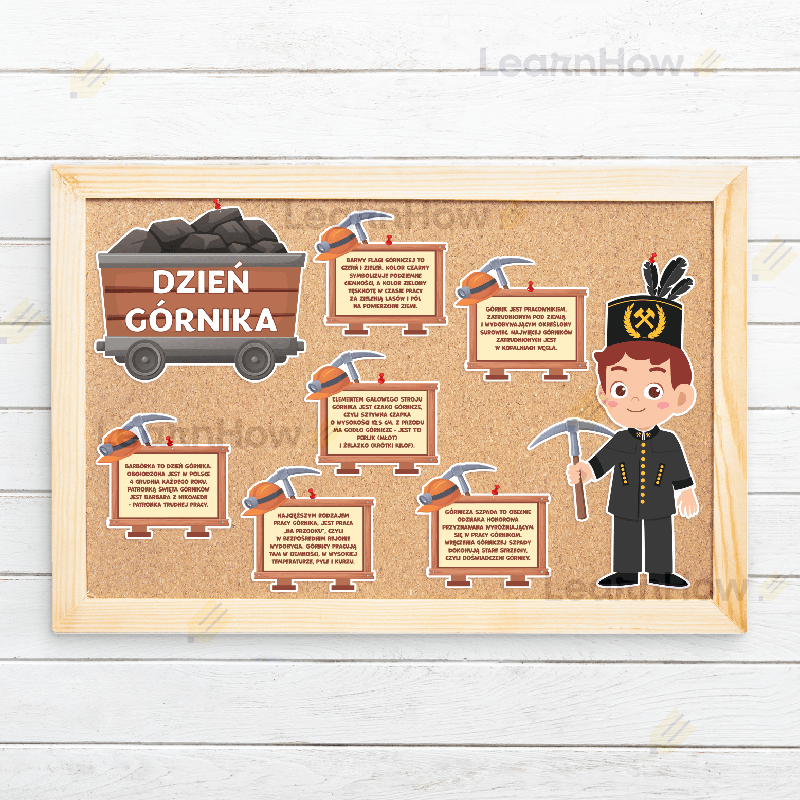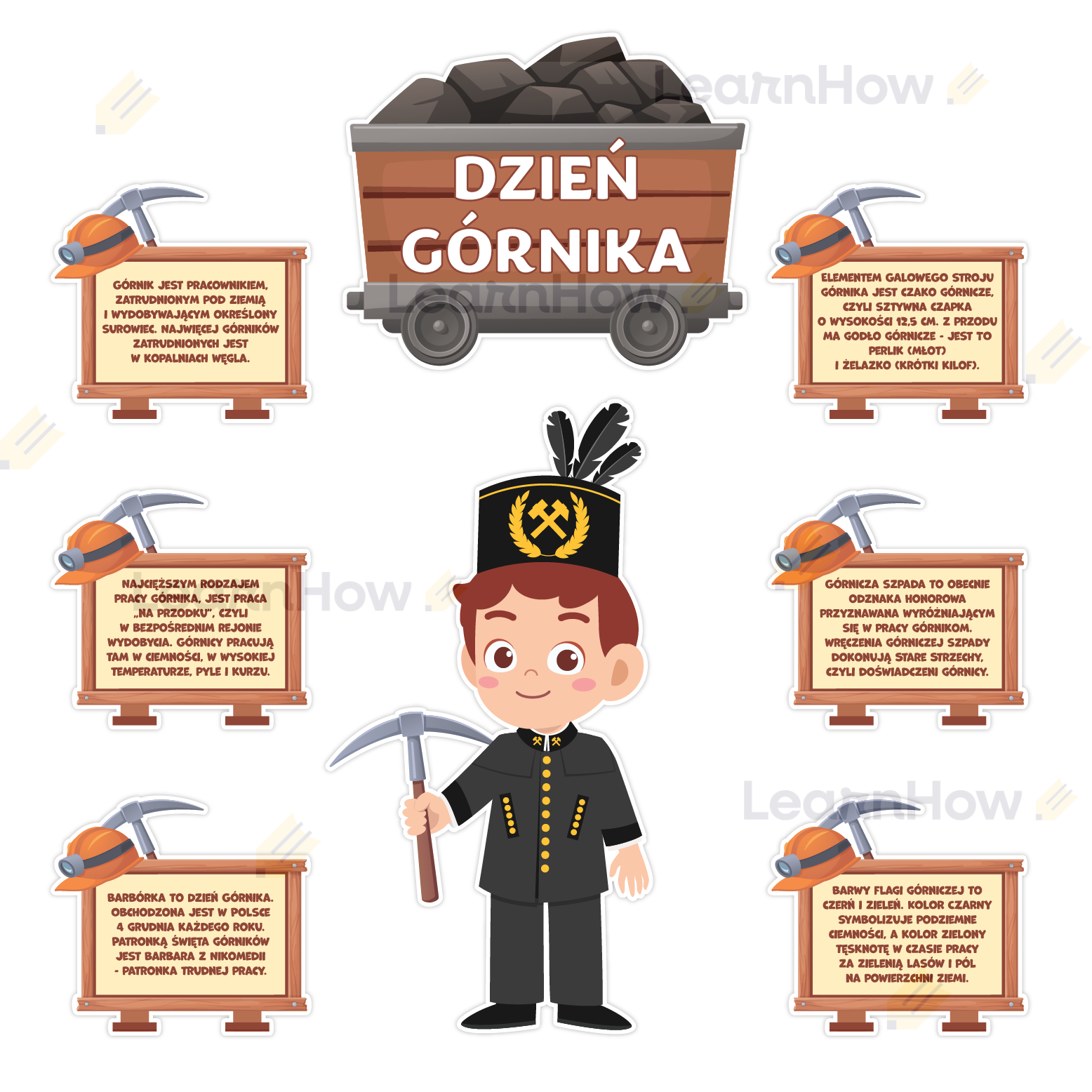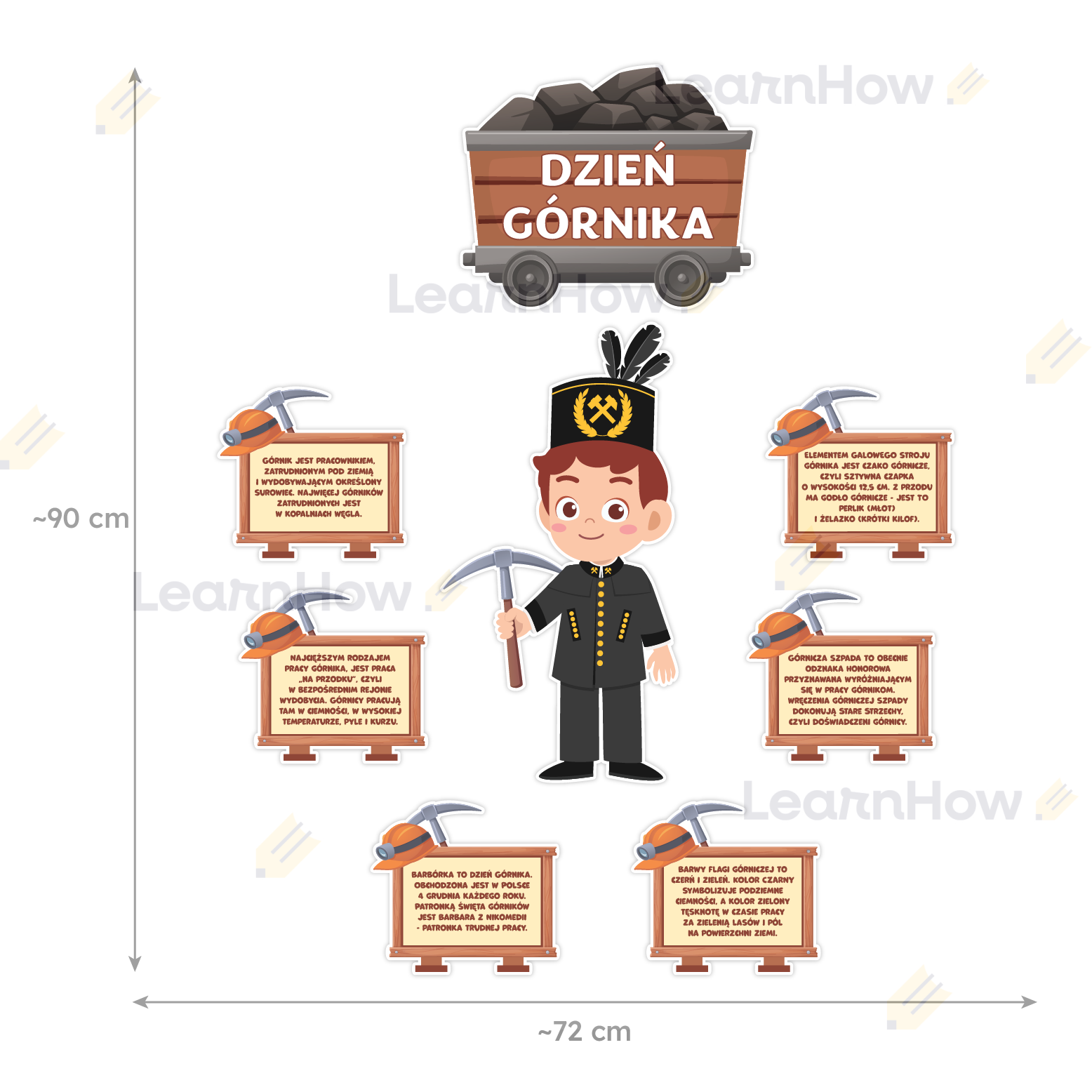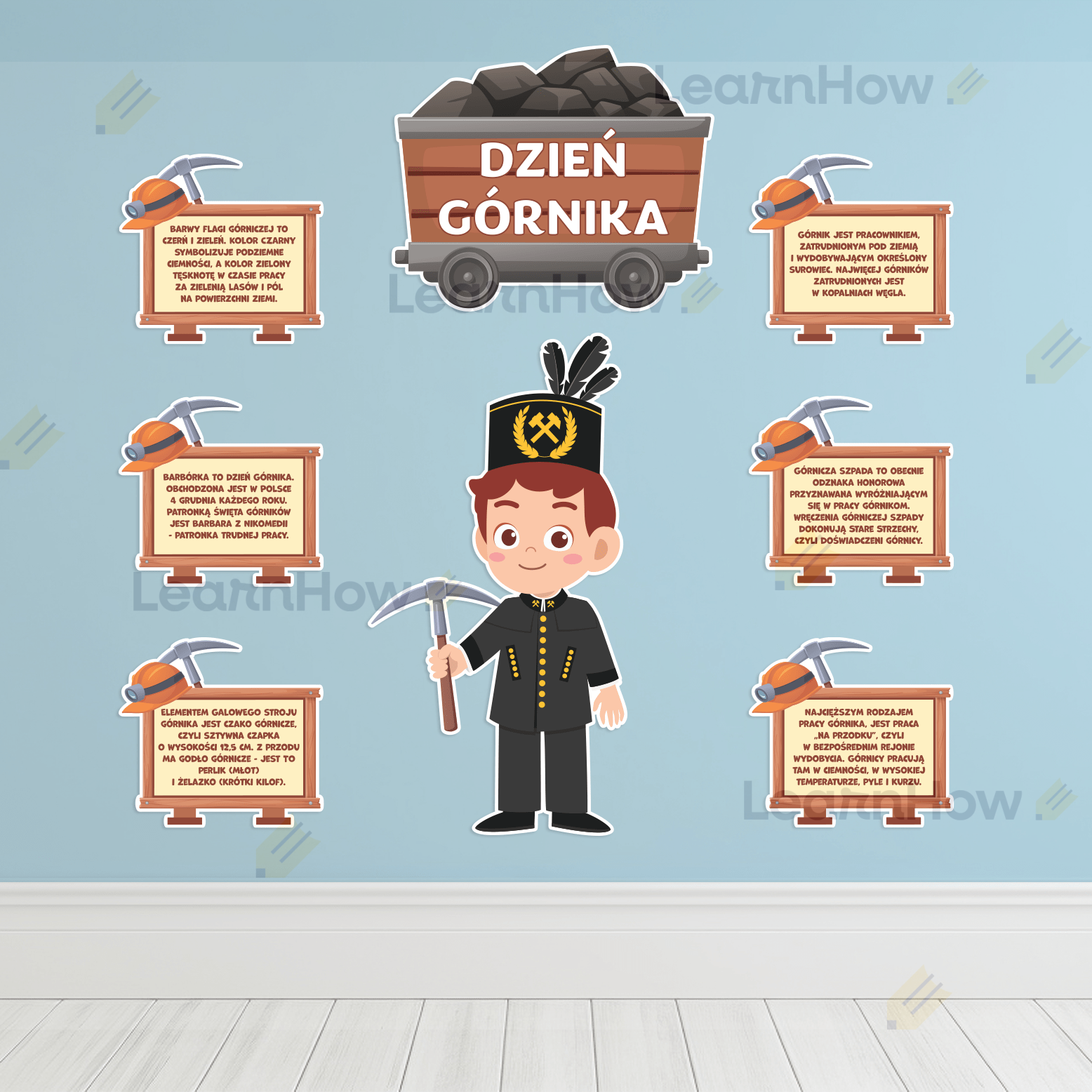 Zestaw składa się z: postaci górnika, 6 tabliczek z informacjami/ciekawostkami o zawodzie górnika oraz dużego napisu DZIEŃ GÓRNIKA.