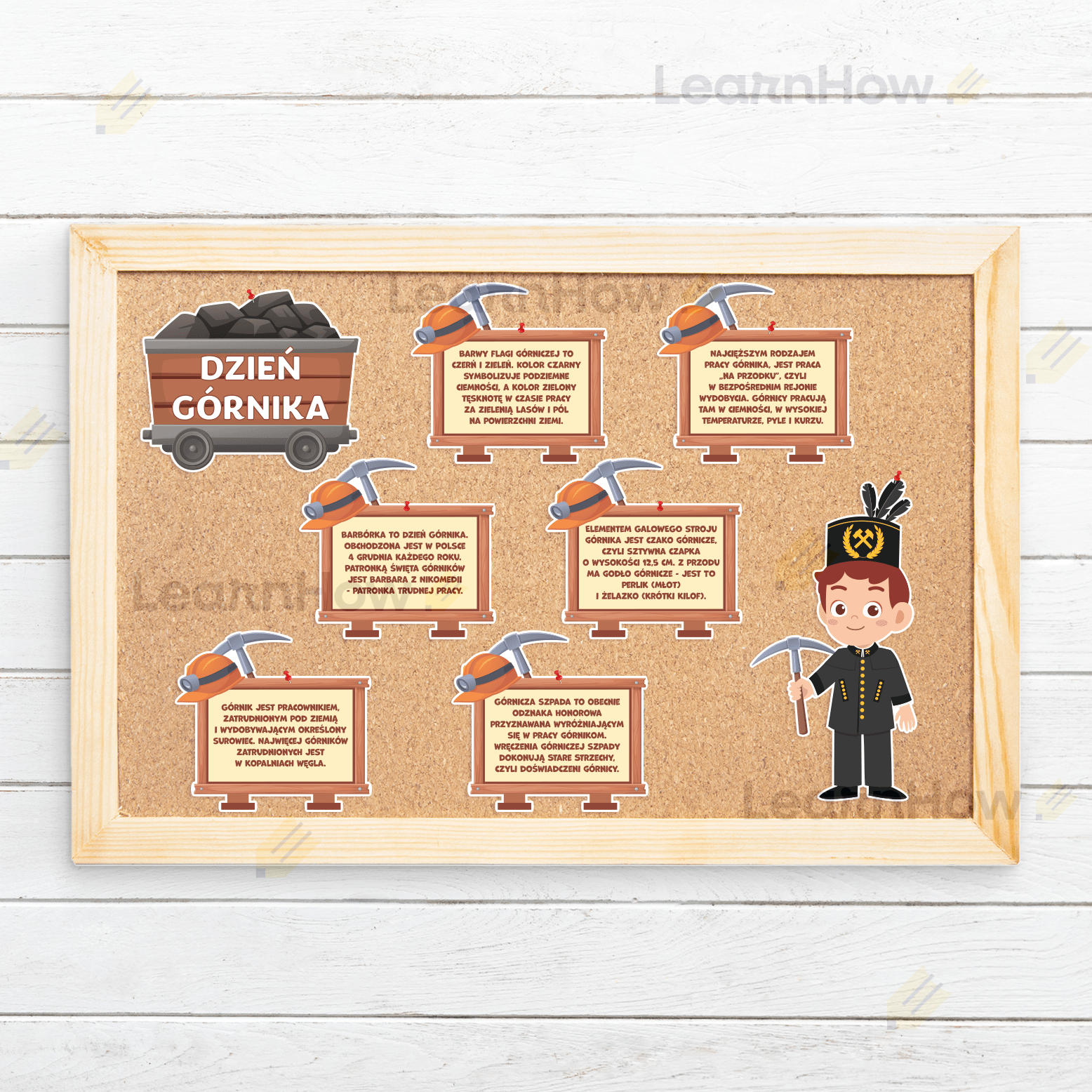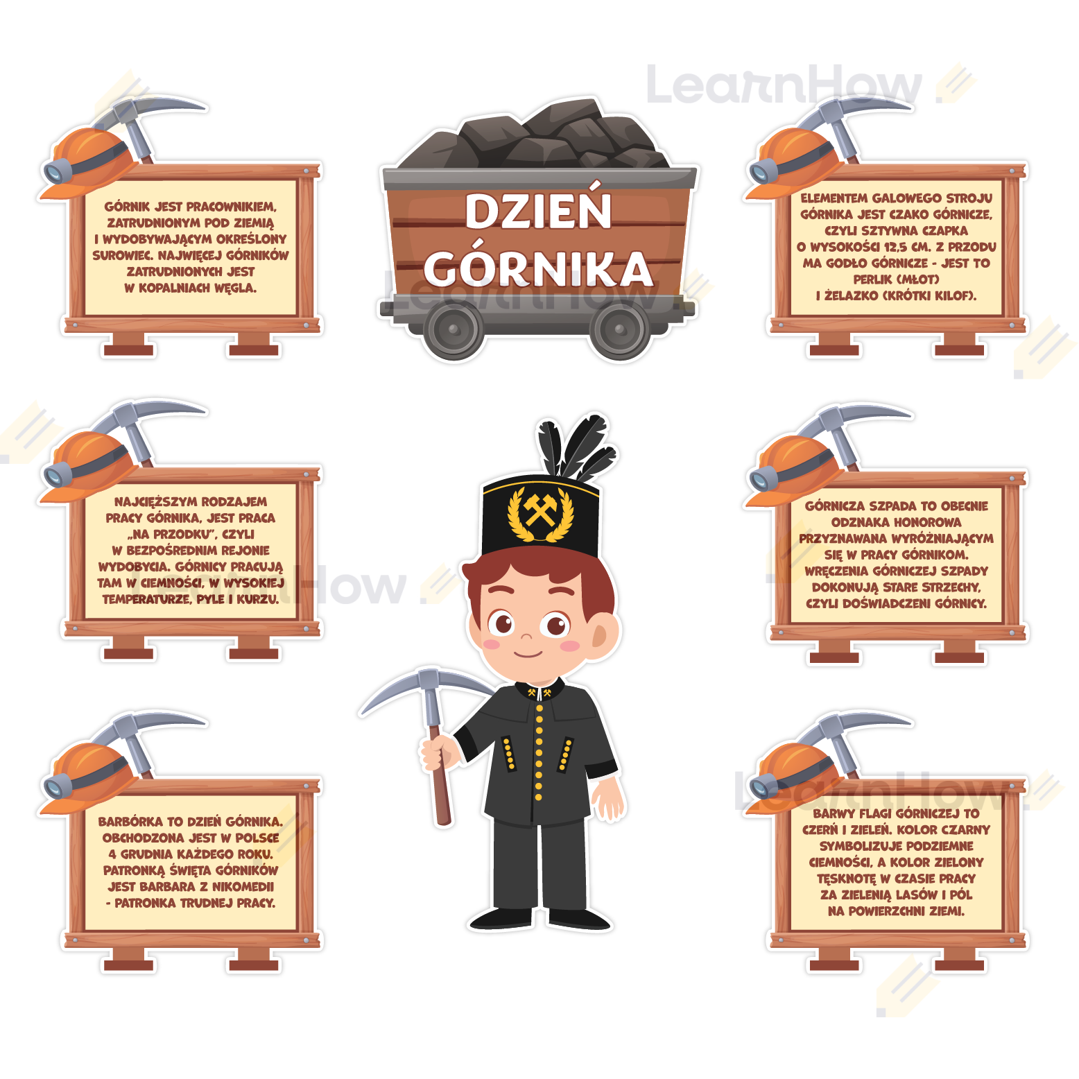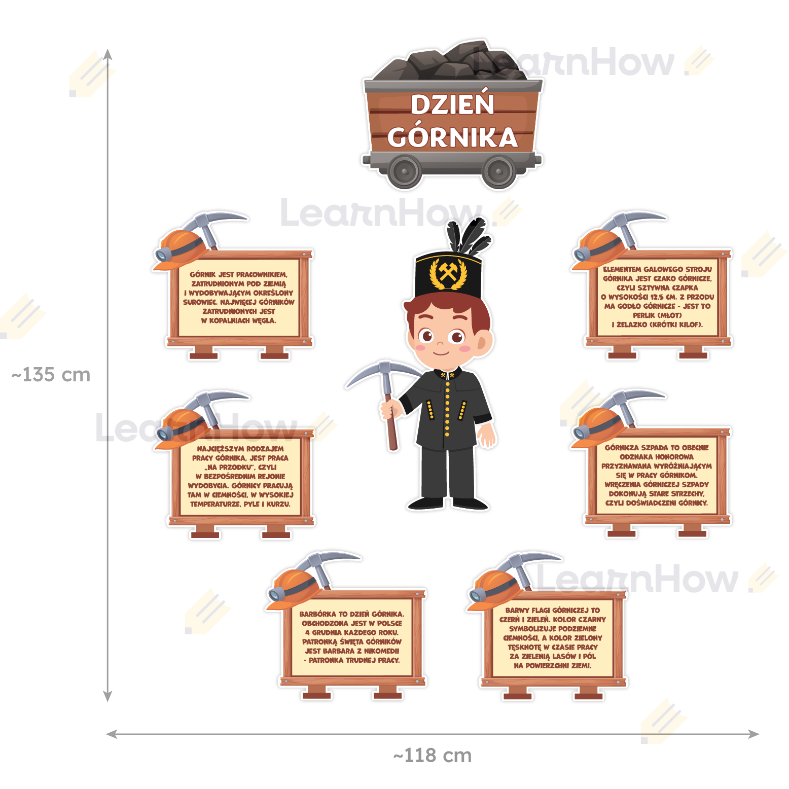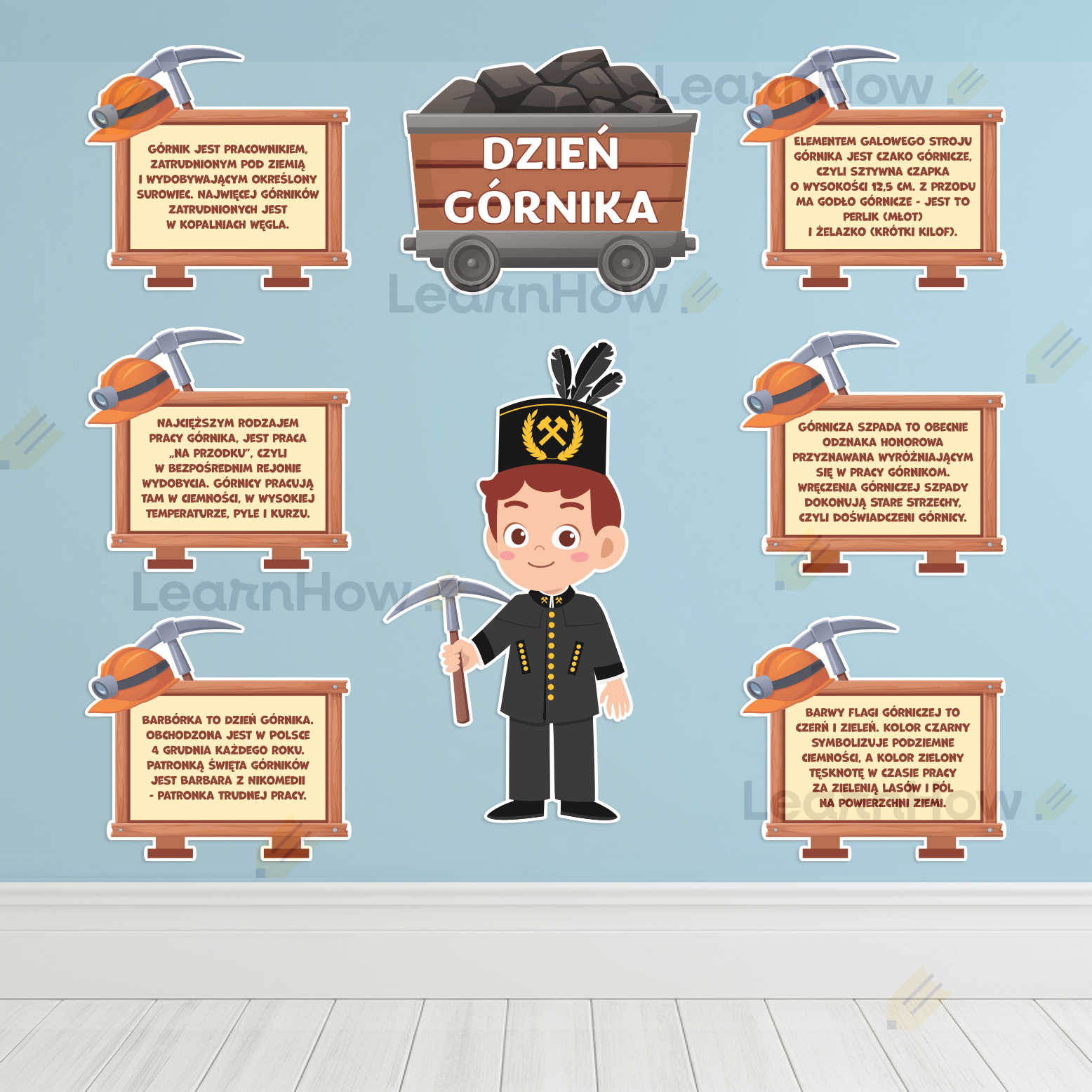 Zestaw składa się z: postaci górnika, 6 tabliczek z informacjami/ciekawostkami o zawodzie górnika oraz dużego napisu DZIEŃ GÓRNIKA.
