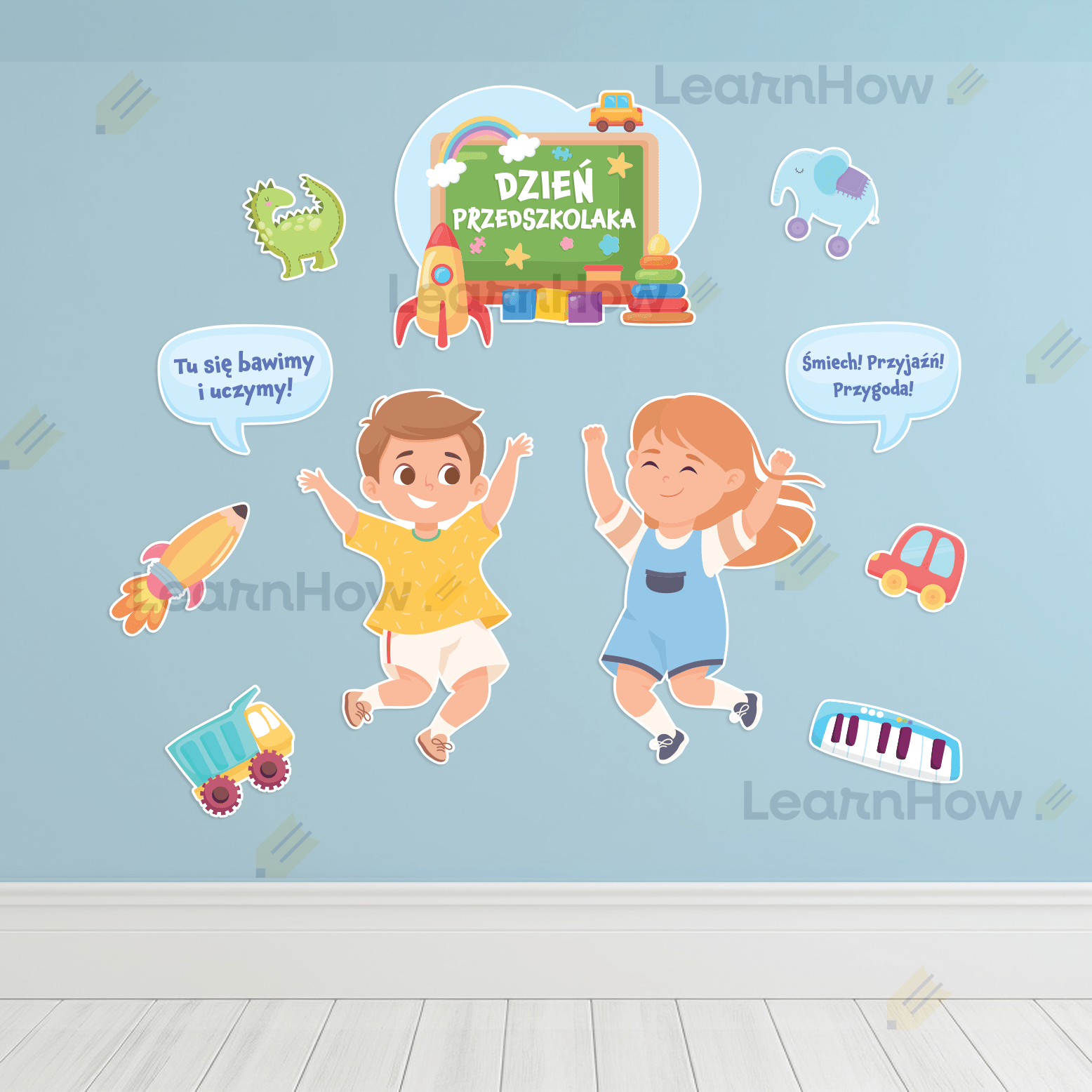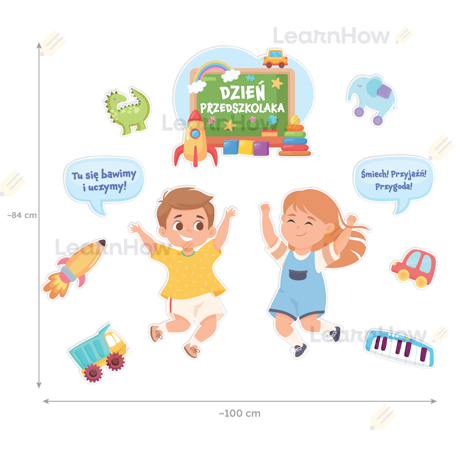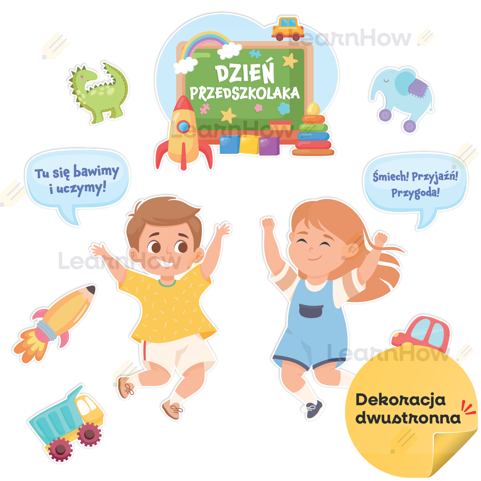 Zestaw składa się z: 2 postaci dzieci, 2 dymków z hasłami, 6 zabawek oraz dużej kompozycji z napisem DZIEŃ PRZEDSZKOLAKA.