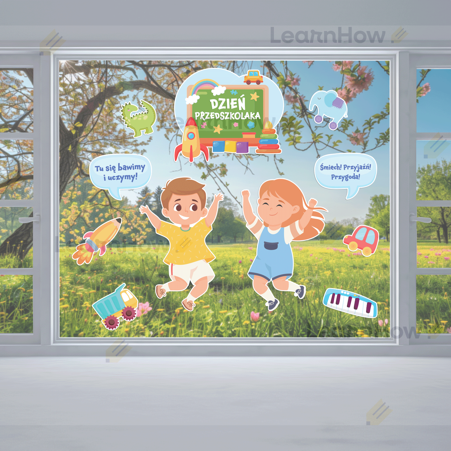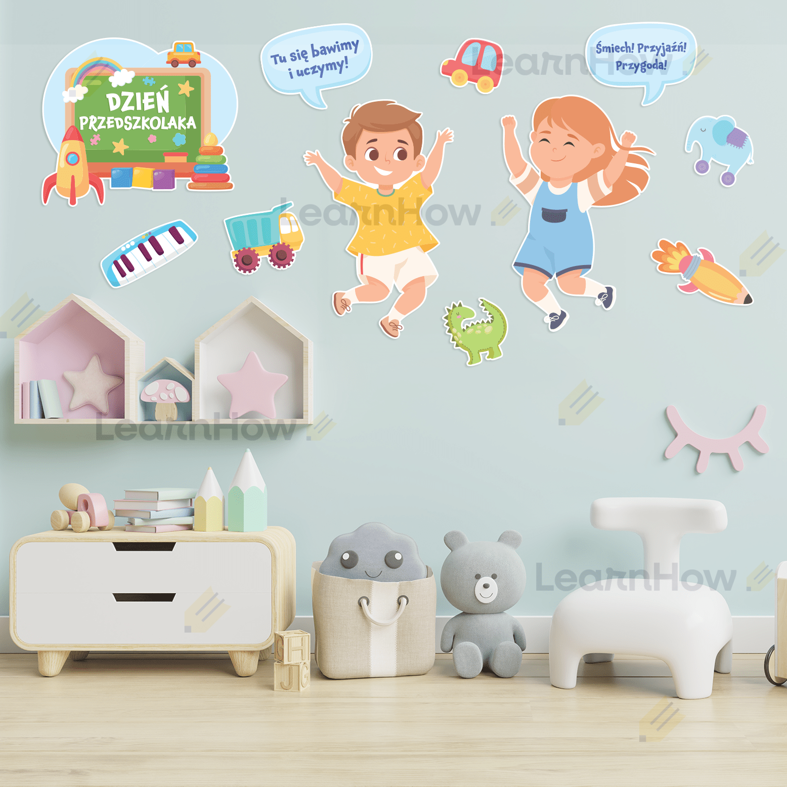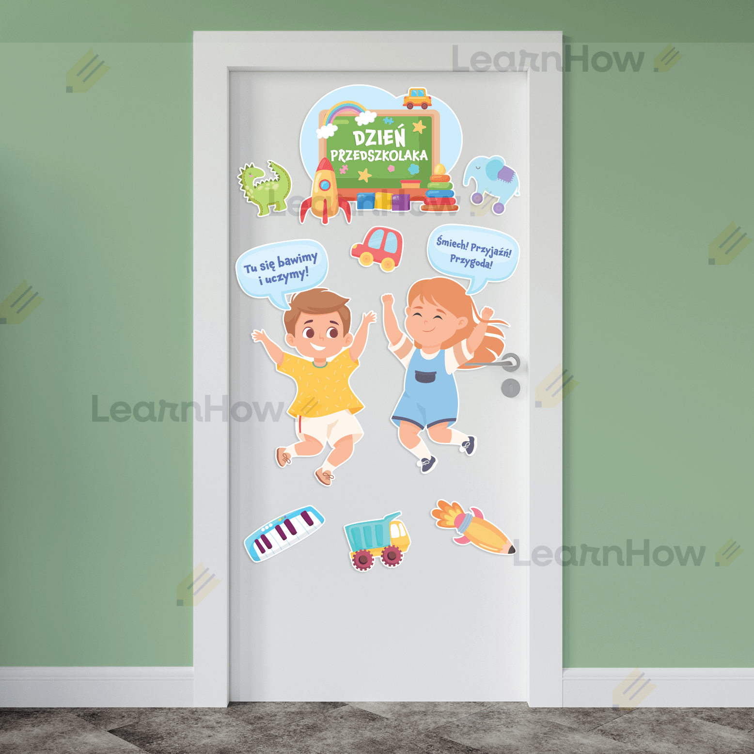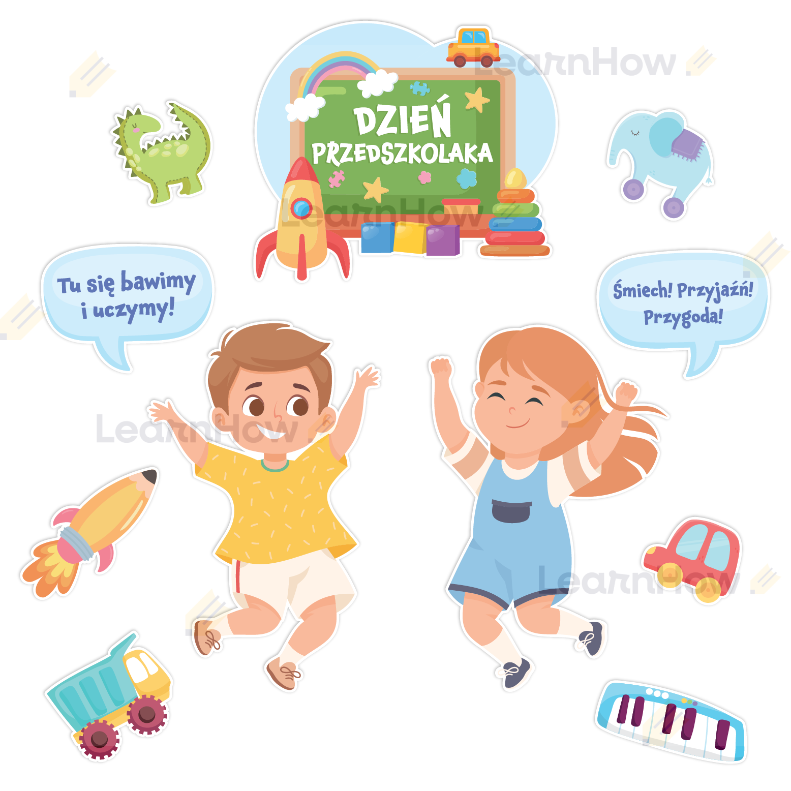 Zestaw składa się z: 2 postaci dzieci, 2 dymków z hasłami, 6 zabawek oraz dużej kompozycji z napisem DZIEŃ PRZEDSZKOLAKA.
