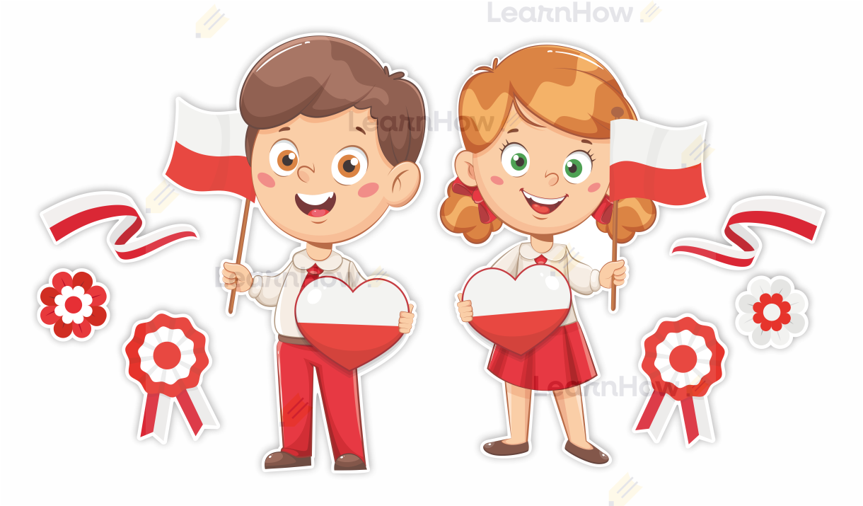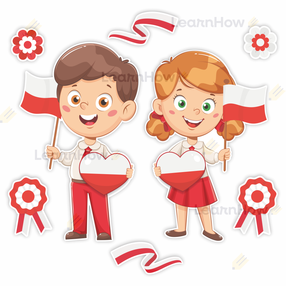 Zestaw składa się z 2 dużych postaci dzieci, 2 wstążek, 2 kwiatków i 2 kotylionów - wszystko w motywie patriotycznym.