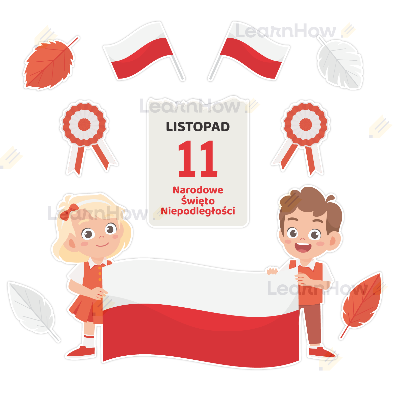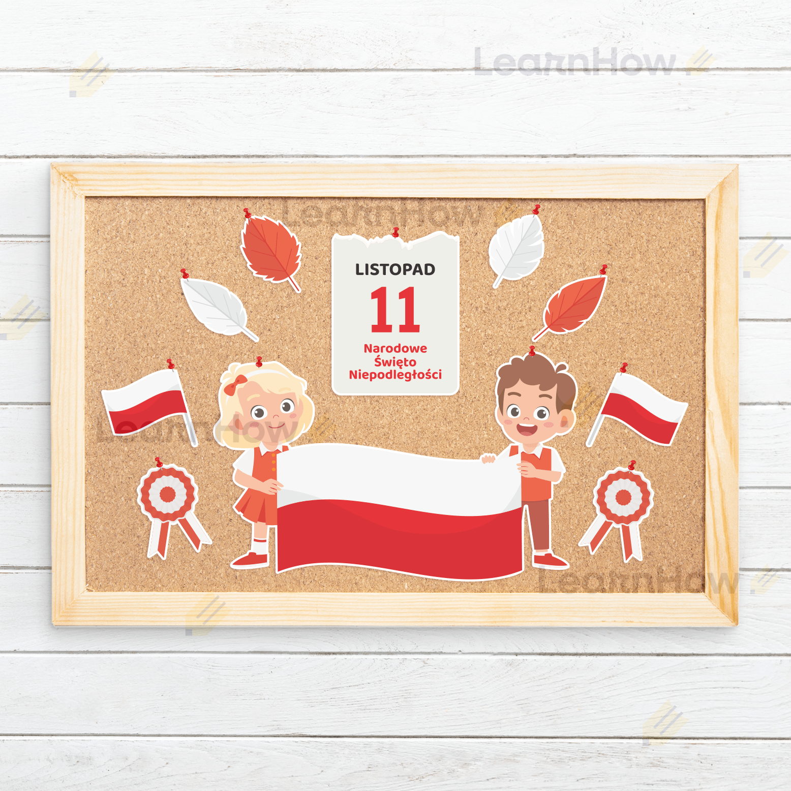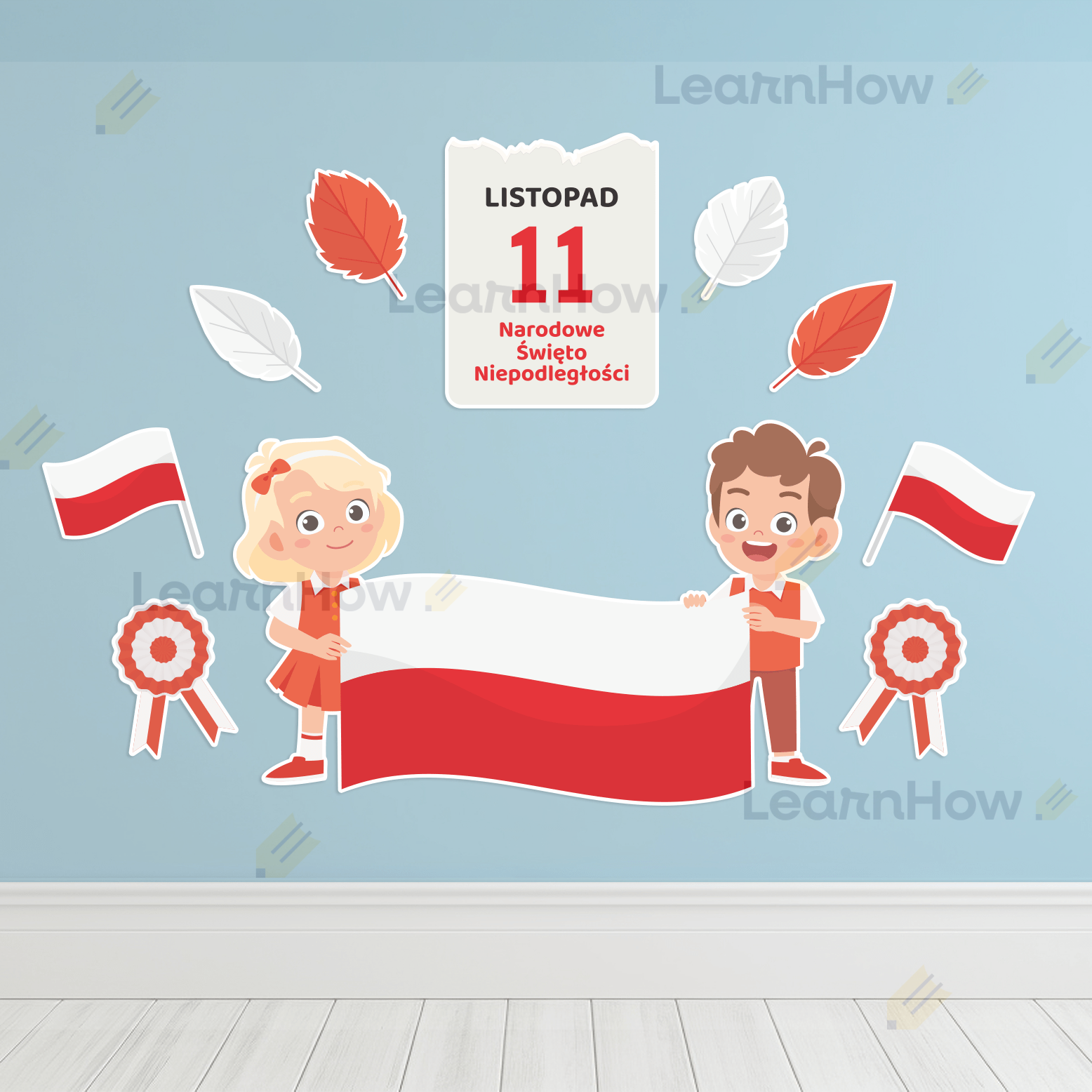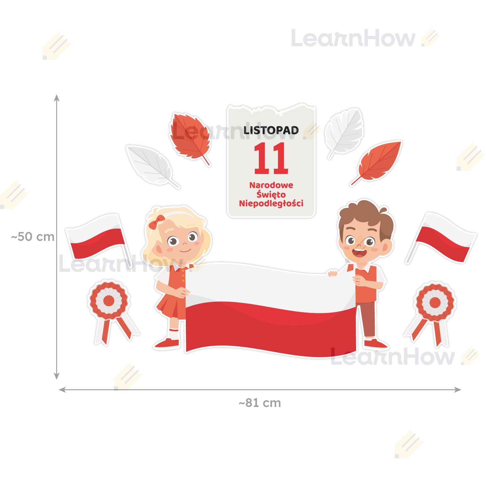 Zestaw składa się z dużych dzieci trzymających flagę oraz kartki z kalendarza - idealne szczególnie do szkoły i przedszkola.