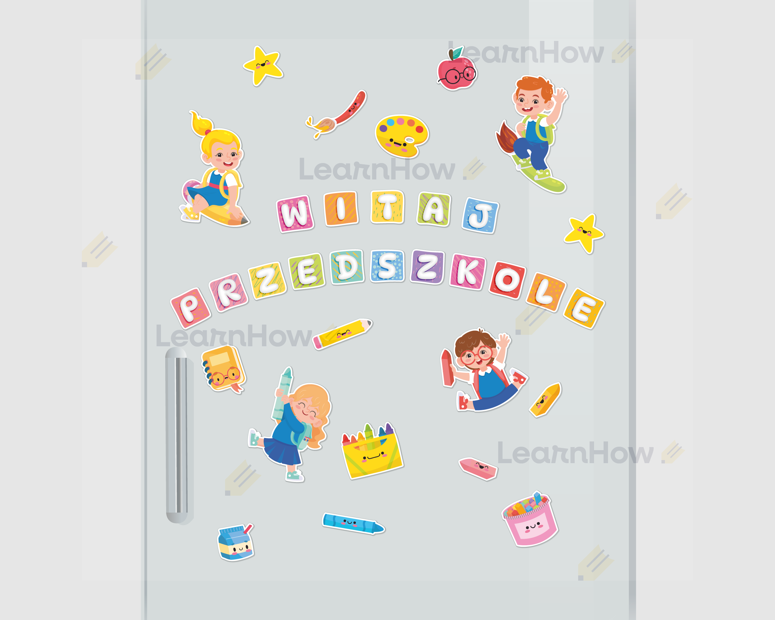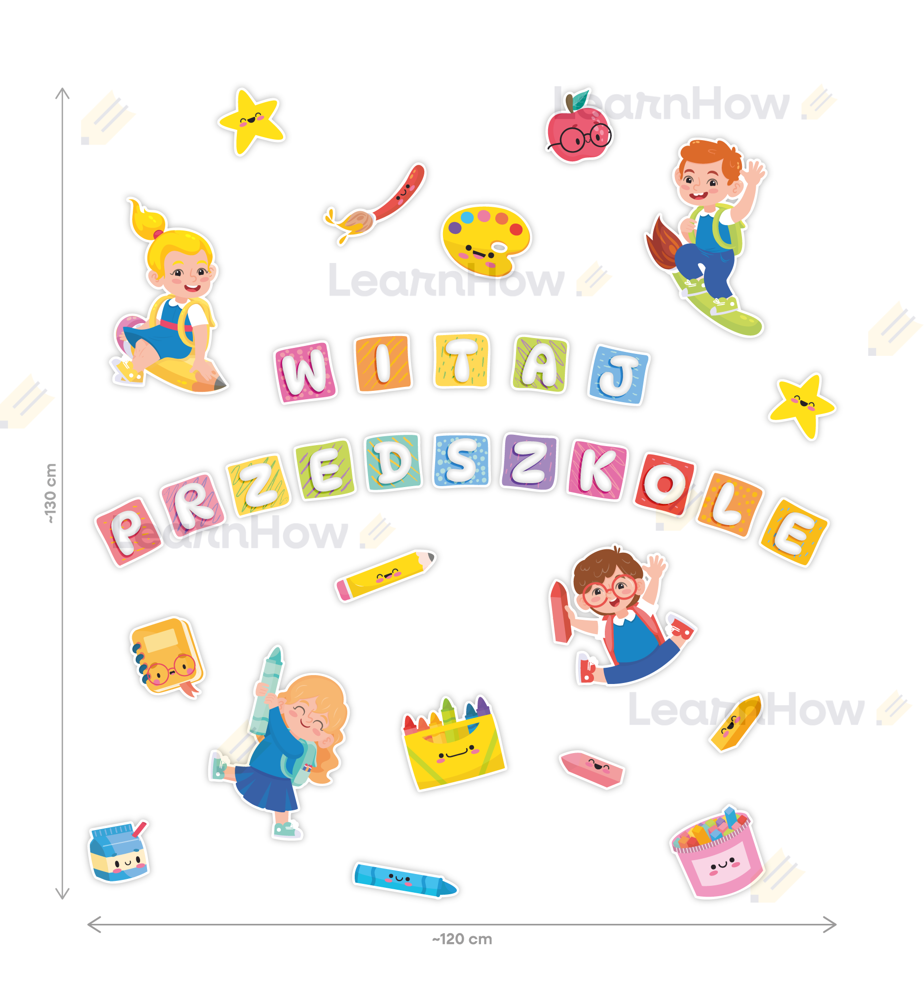 Zestaw zawiera: 16 kolorowych pól z literami układającymi się w napis "WITAJ PRZEDSZKOLE", 4 postaci dzieci oraz 13 uśmiechniętych kolorowych elementów (m.in.: kredki, kreda, pędzel, paleta, notes, jabłko).