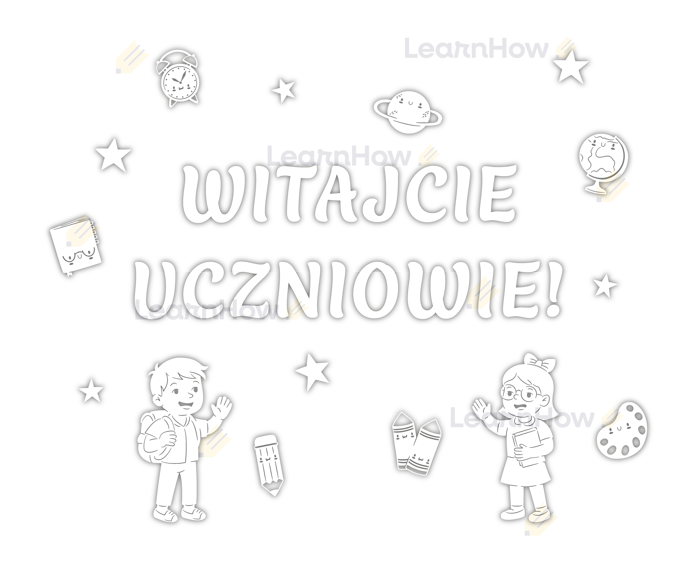 Zestaw składa się z 19 znaków tworzących napis "WITAJCIE UCZNIOWIE!", 7 elementów dodatkowych (zeszyt, budzik, planeta, kredki, globus, ołówek, paleta) oraz 6 gwiazdek.