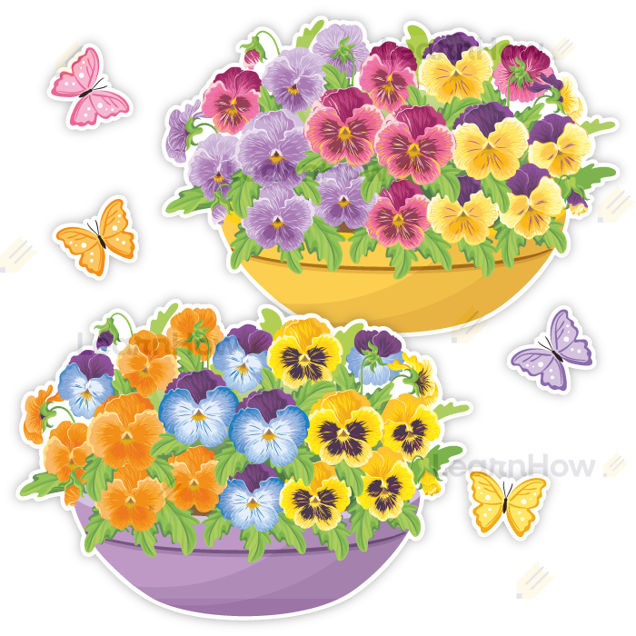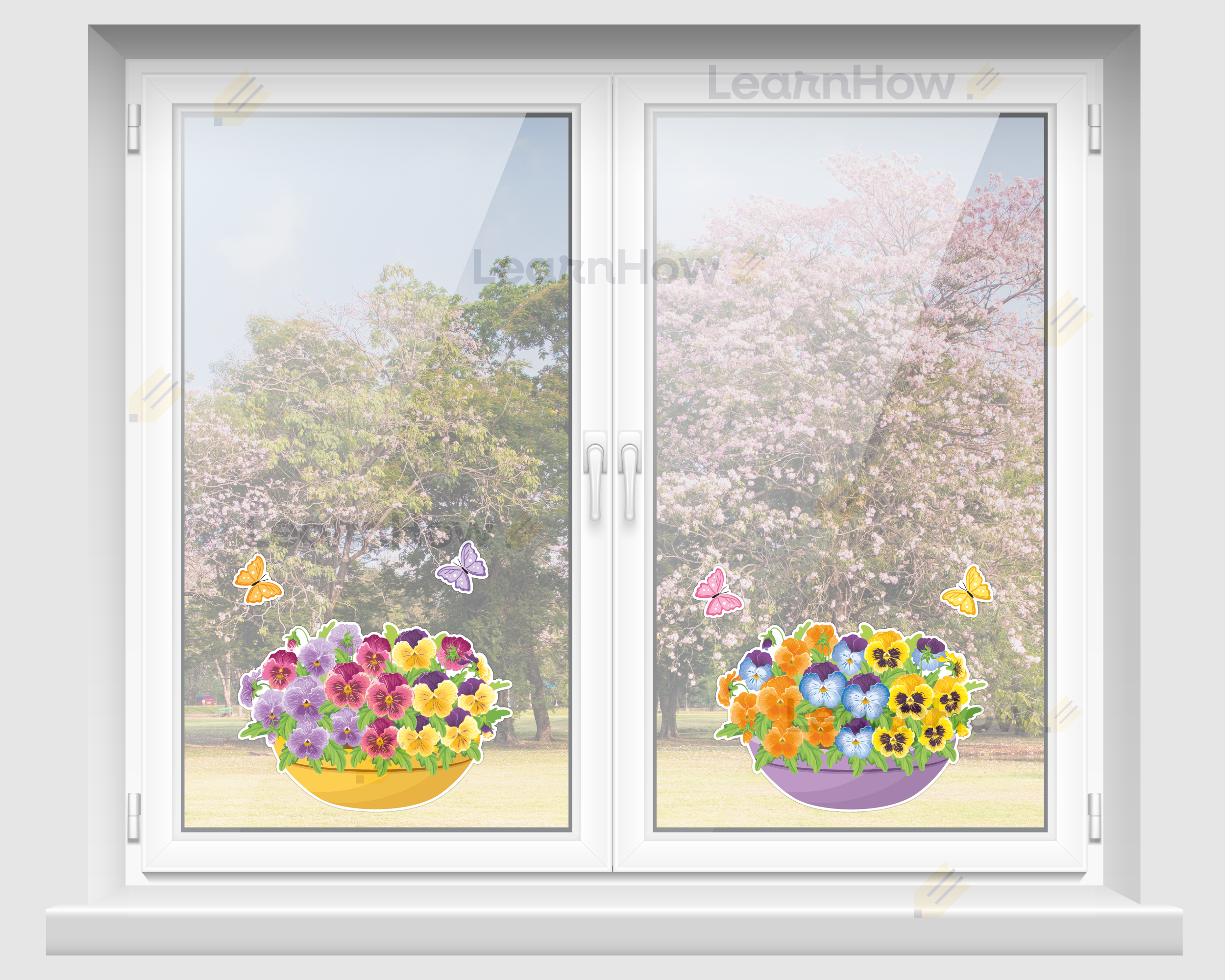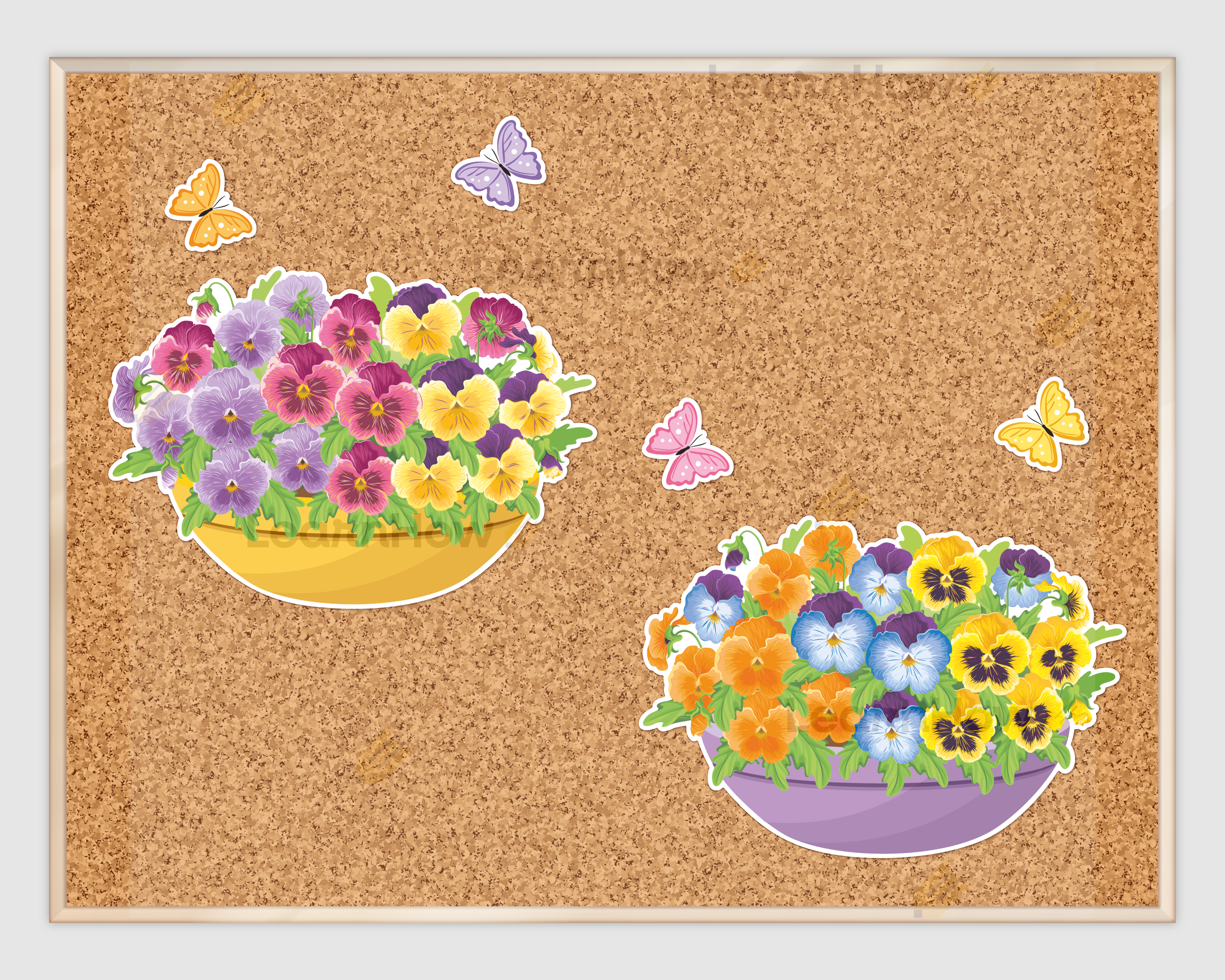 Zestaw składa się z 2 dużych doniczek z kolorowymi bratkami oraz 4 motylki. Idealny do wiosennej dekoracji szkoły czy przedszkola.