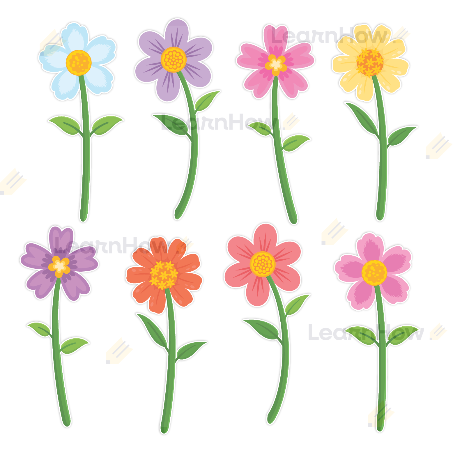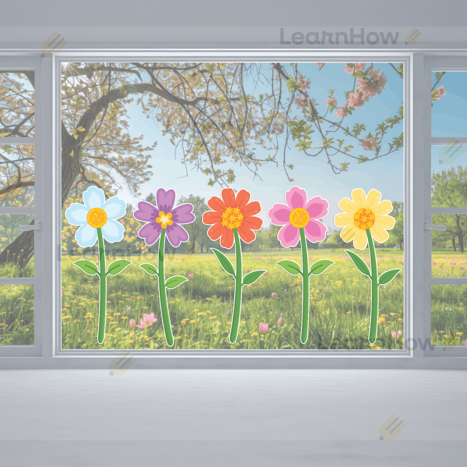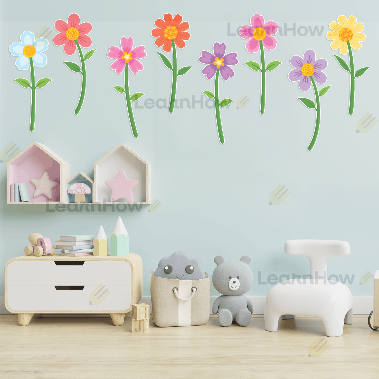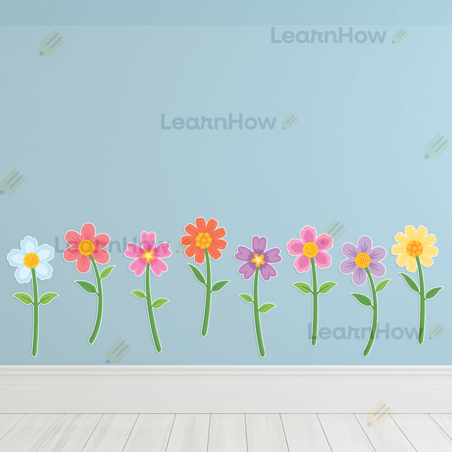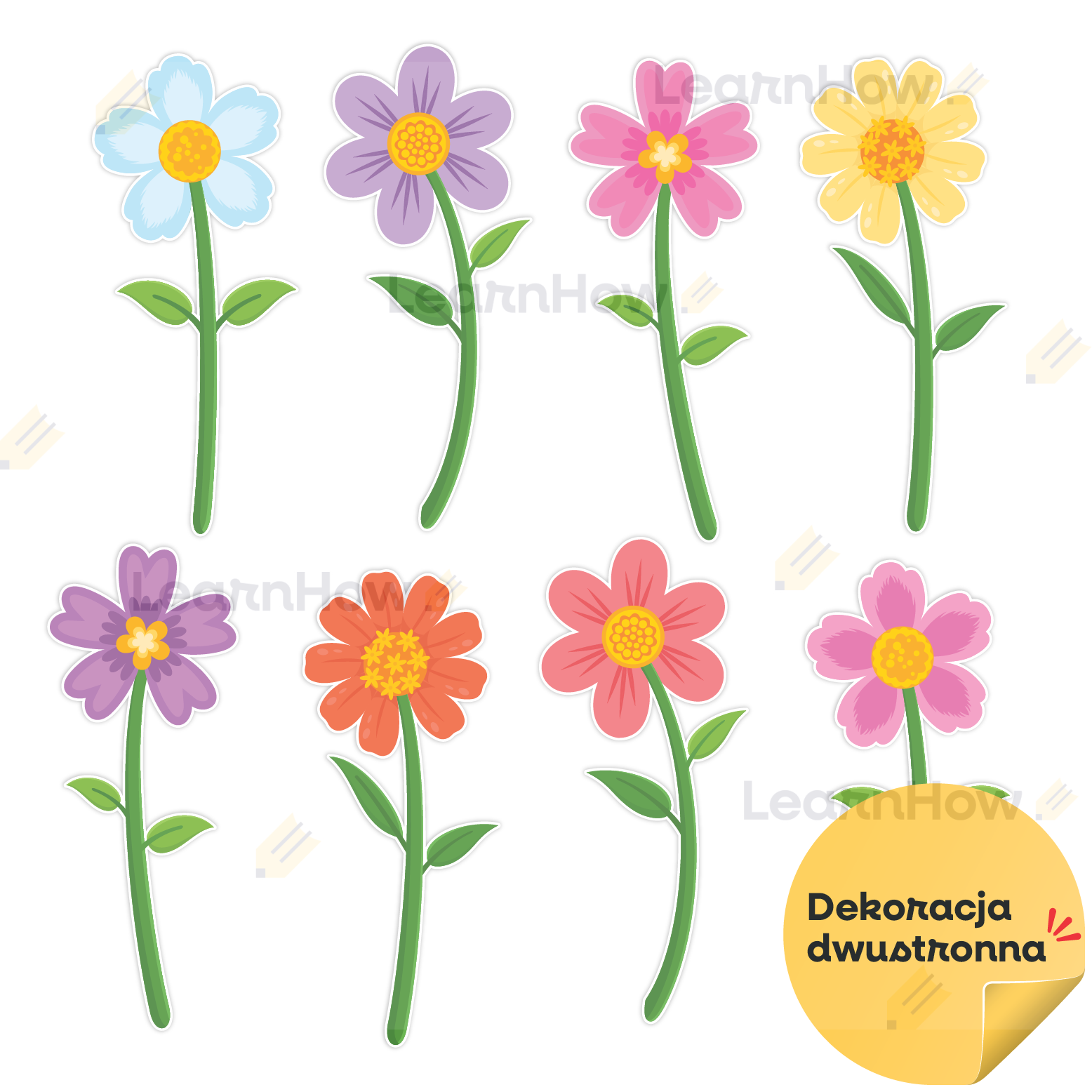 Zestaw składa się z 8 kwiatów na łodygach w różnych kolorach - idealne do wiosennej dekoracji szkoły i przedszkola.
