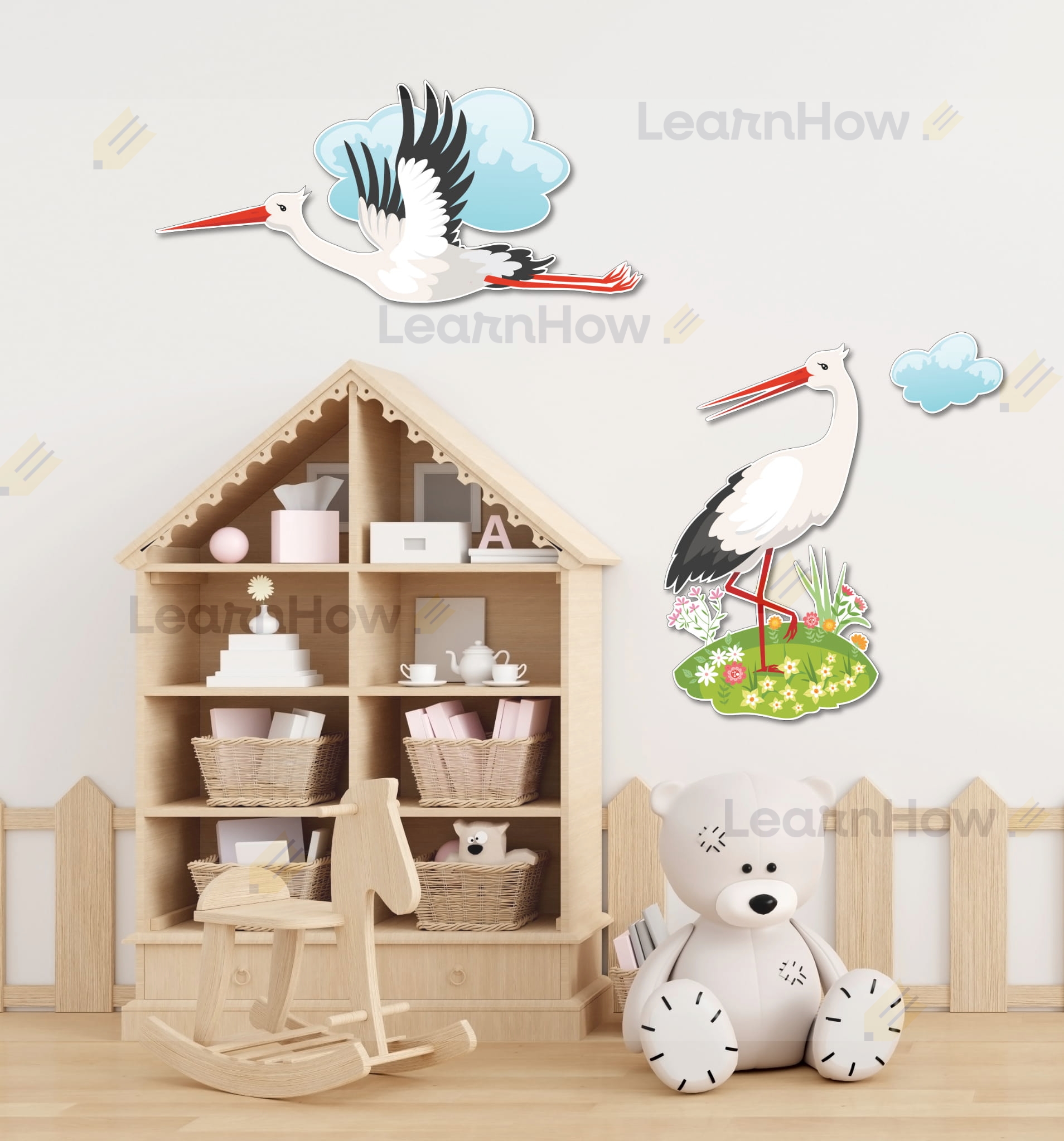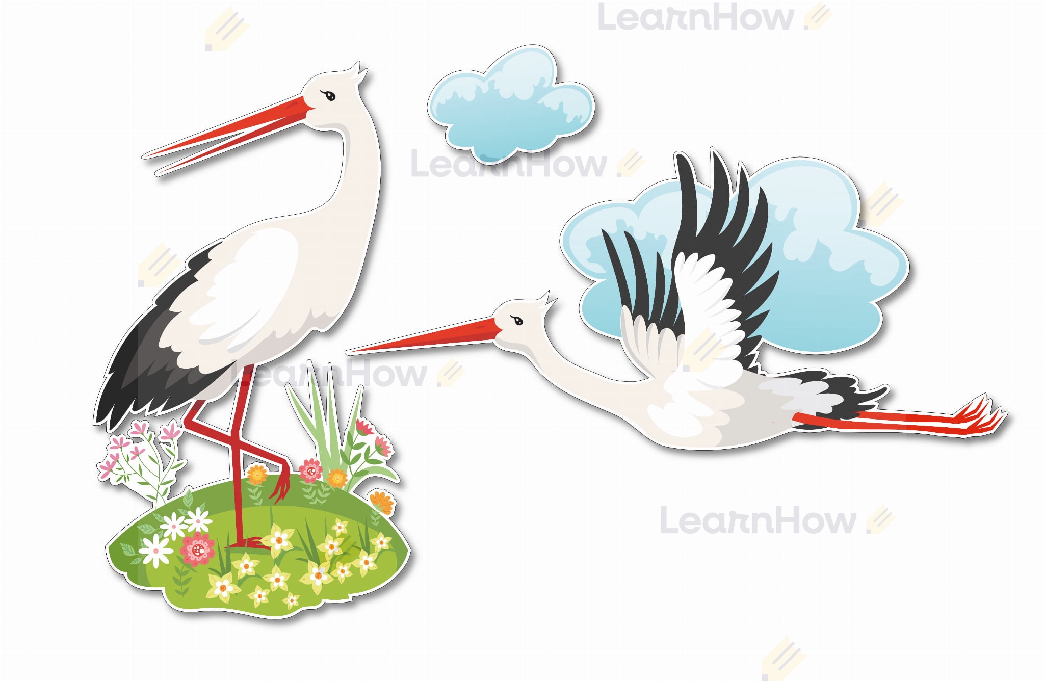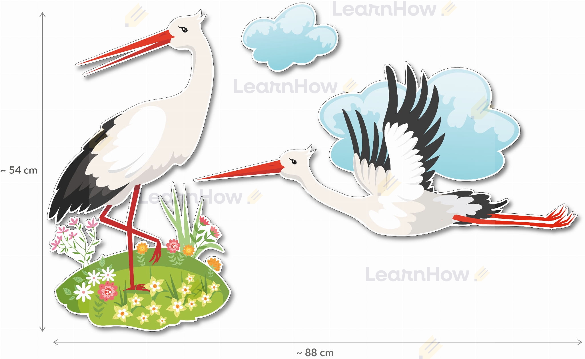 Zestaw składa się z 2 bocianów w różnych pozycjach oraz chmurki - idealne do wiosennej dekoracji szkoły i przedszkola.