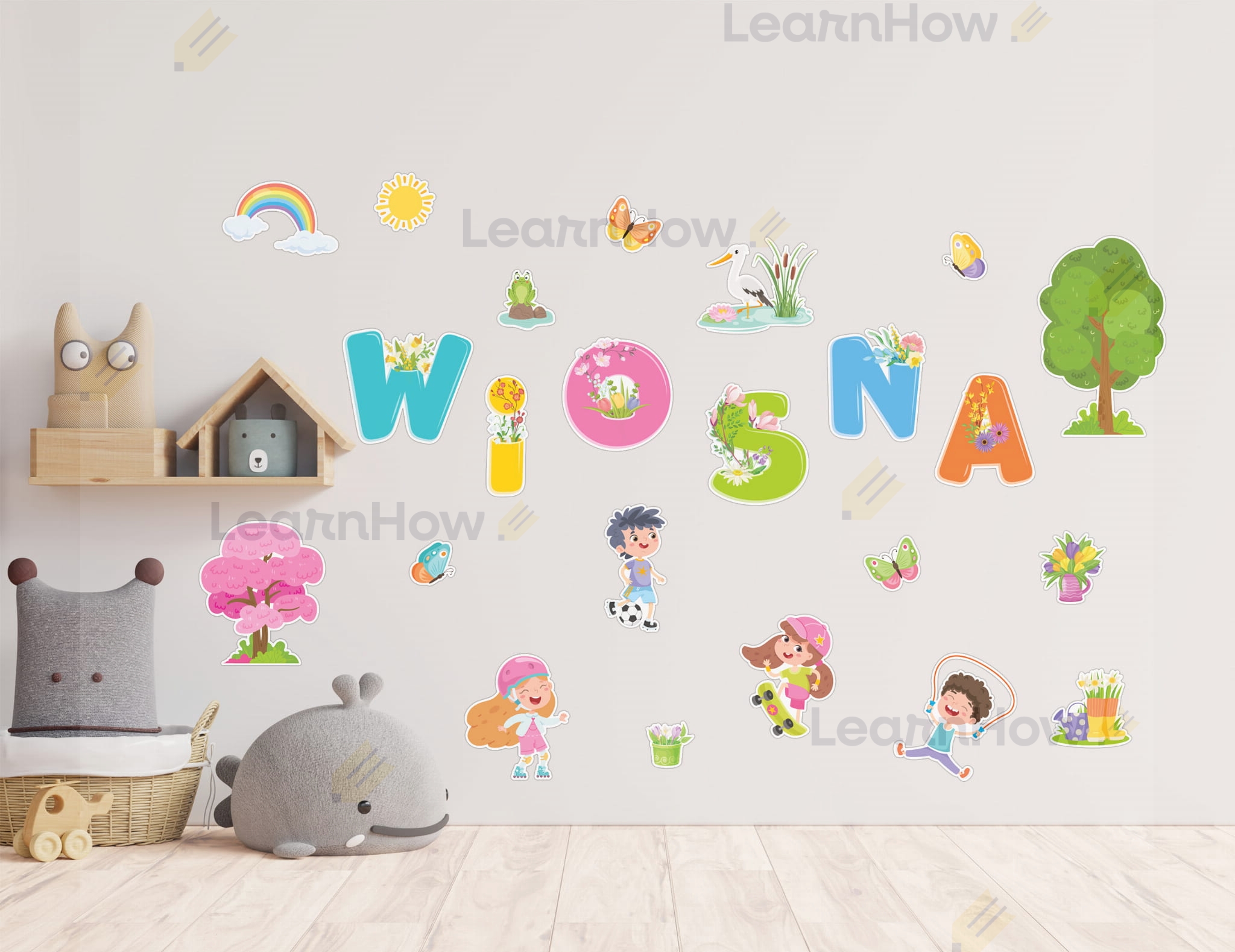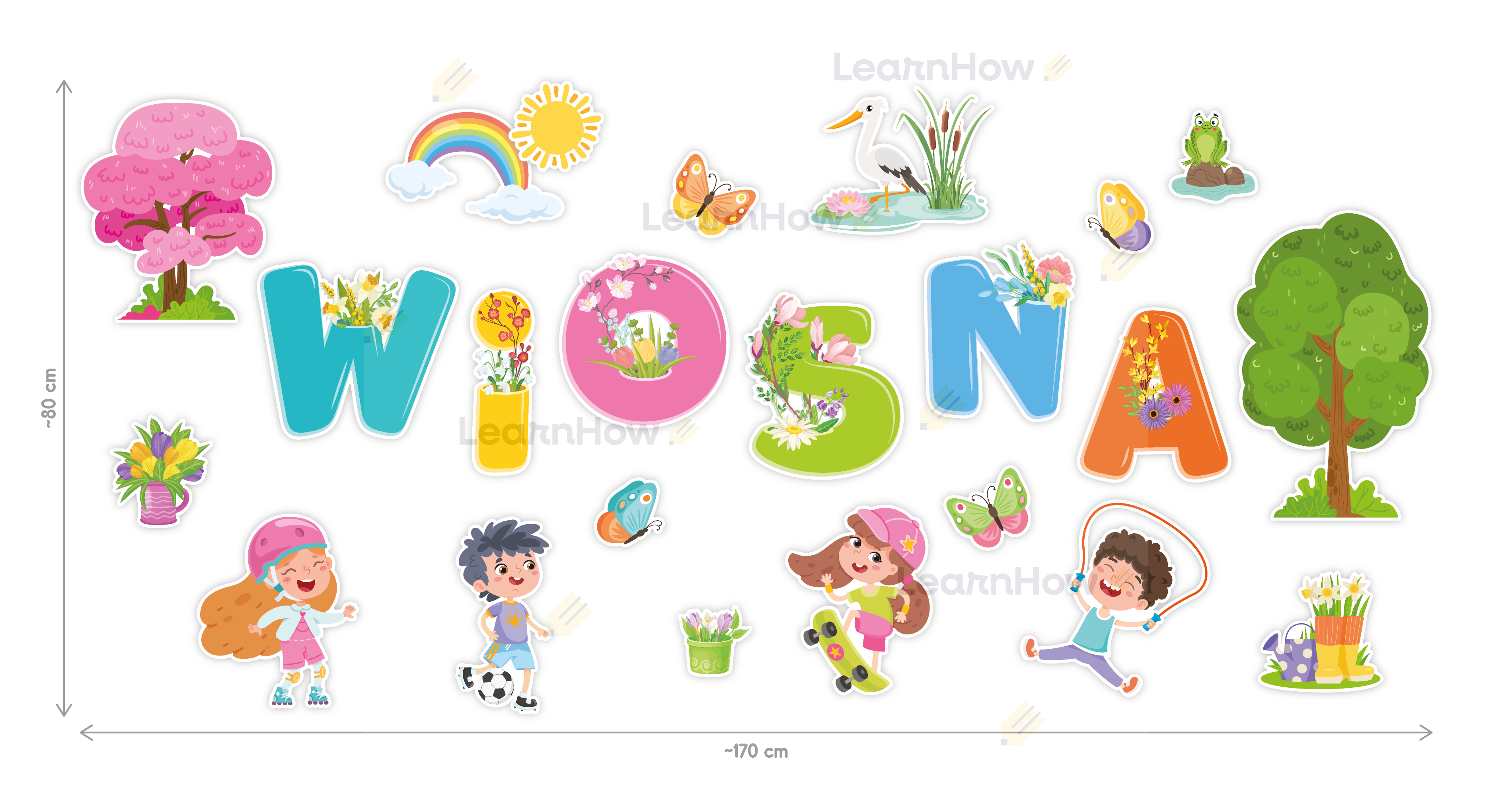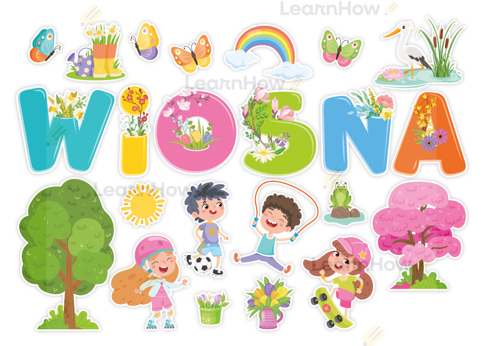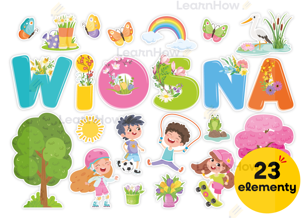 Zestaw składa się z 6 liter układających się w napis "WIOSNA", 4 postaci dzieci, bociana w stawie, żabki na kamieniu, 2 drzew, 4 motyli oraz 5 elementów dekoracyjnych związanych z krajobrazem wiosny.