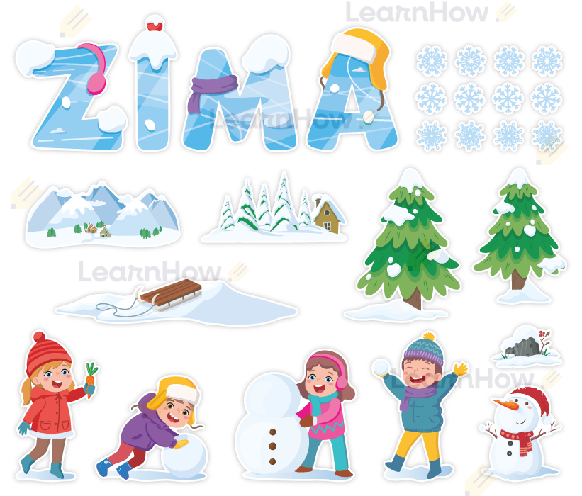 Zestaw składa się z 4 liter układających się w napis "ZIMA", 4 postaci dzieci, 1 bałwanka, 2 choinek, 4 elementów dekoracyjnych związanych z krajobrazem zimy oraz 12 płatków śniegu.