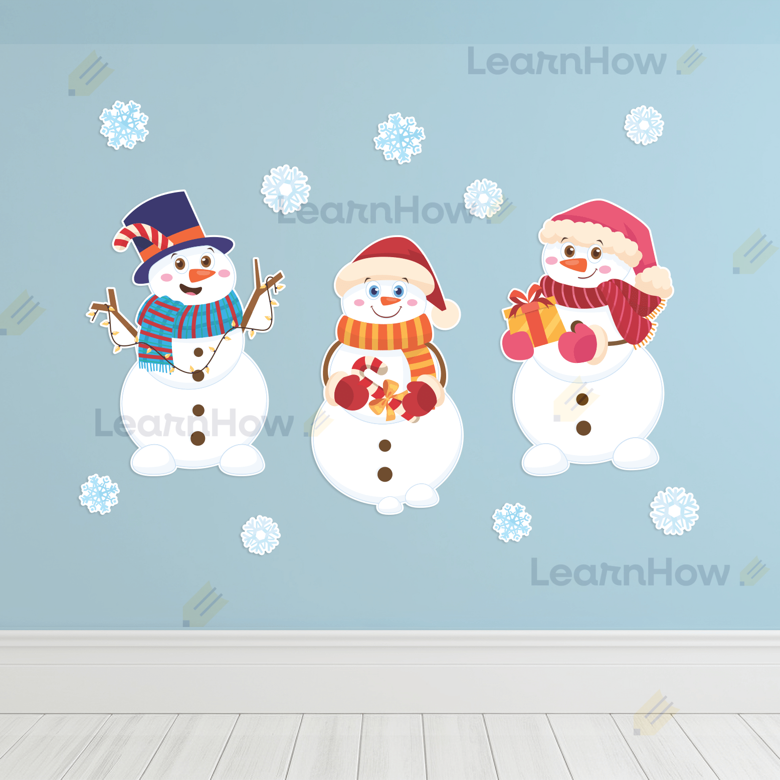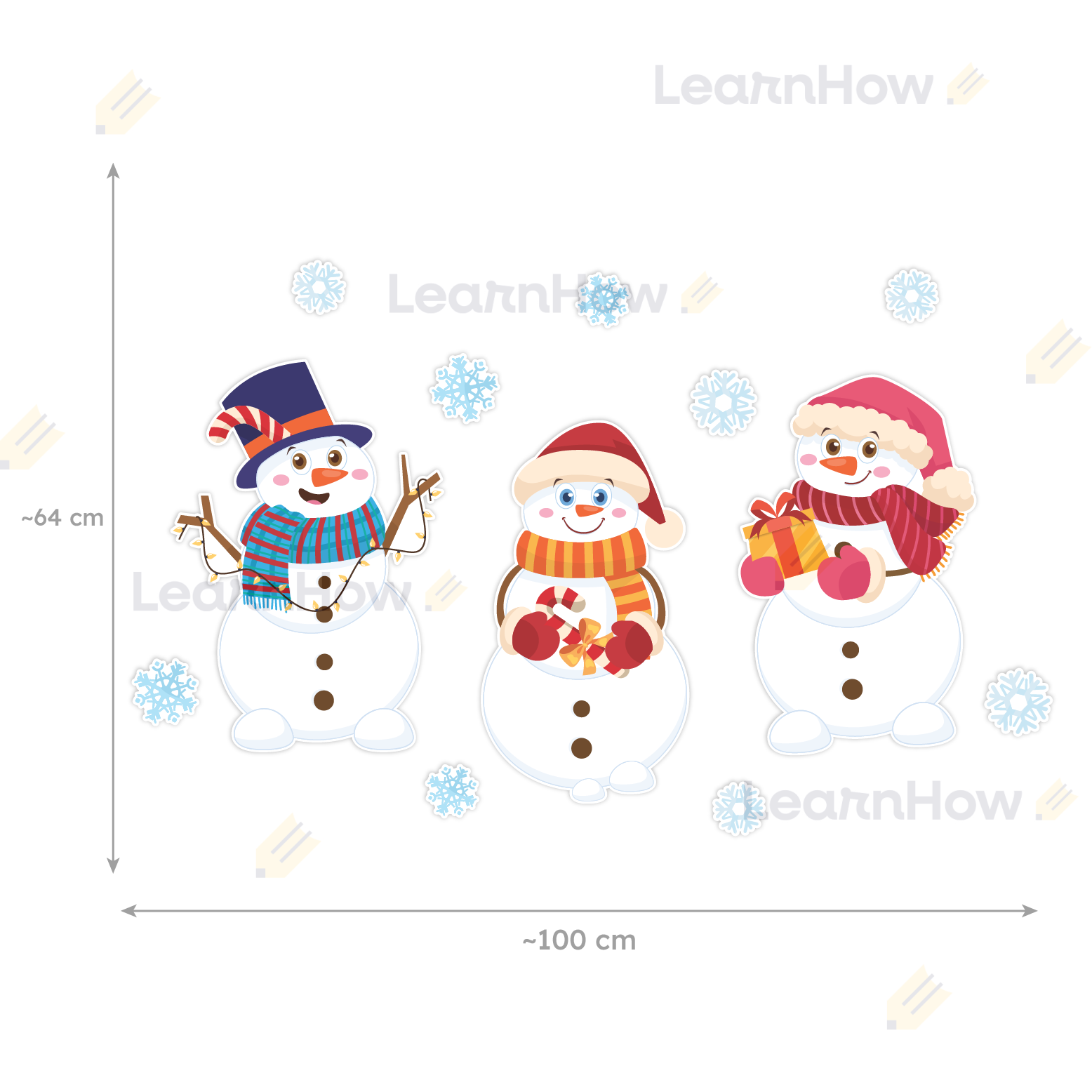 Zestaw dekoracji składa się z 3 dużych wesołych bałwanków oraz 9 płatków śniegu - idealne do zimowej dekoracji szkoły i przedszkola.