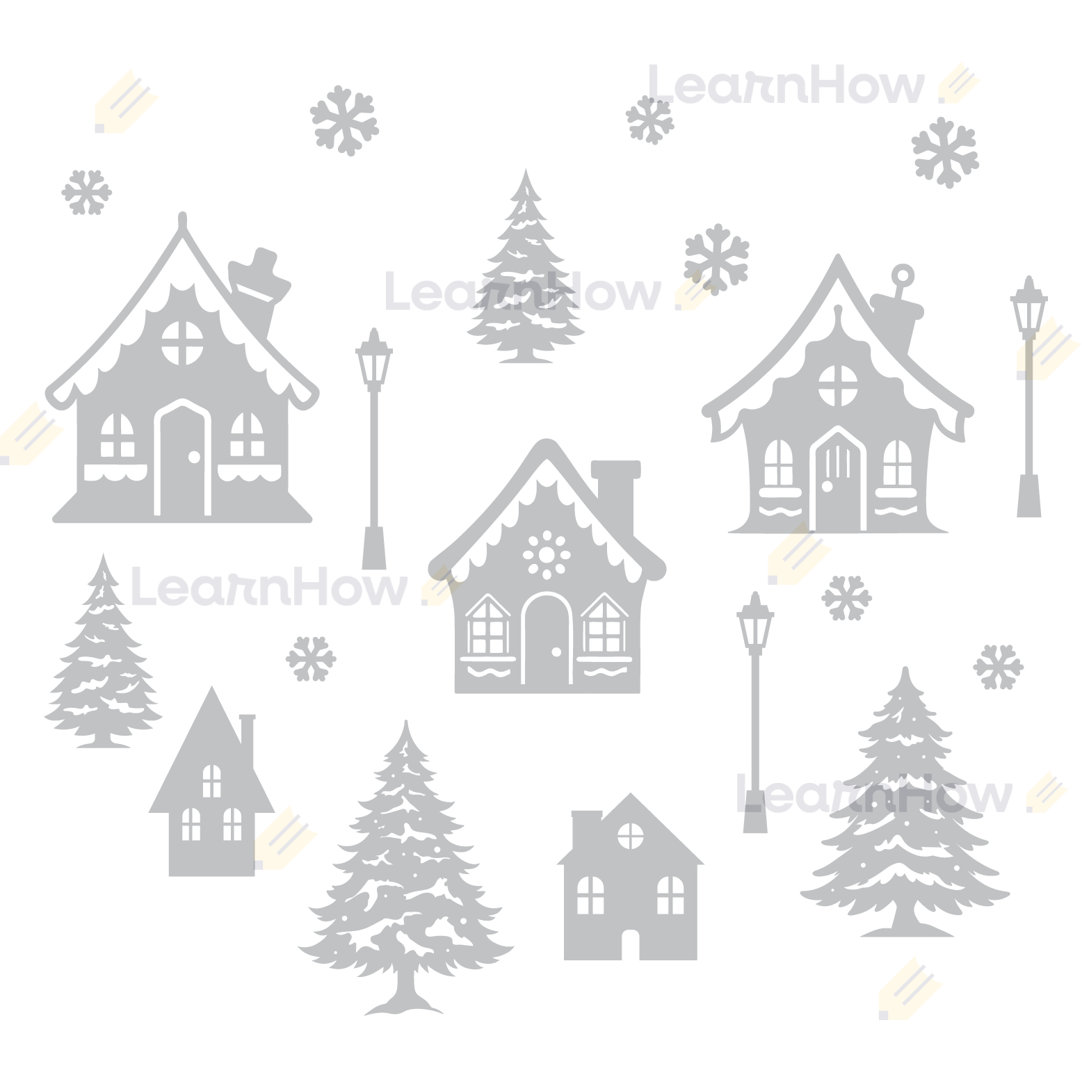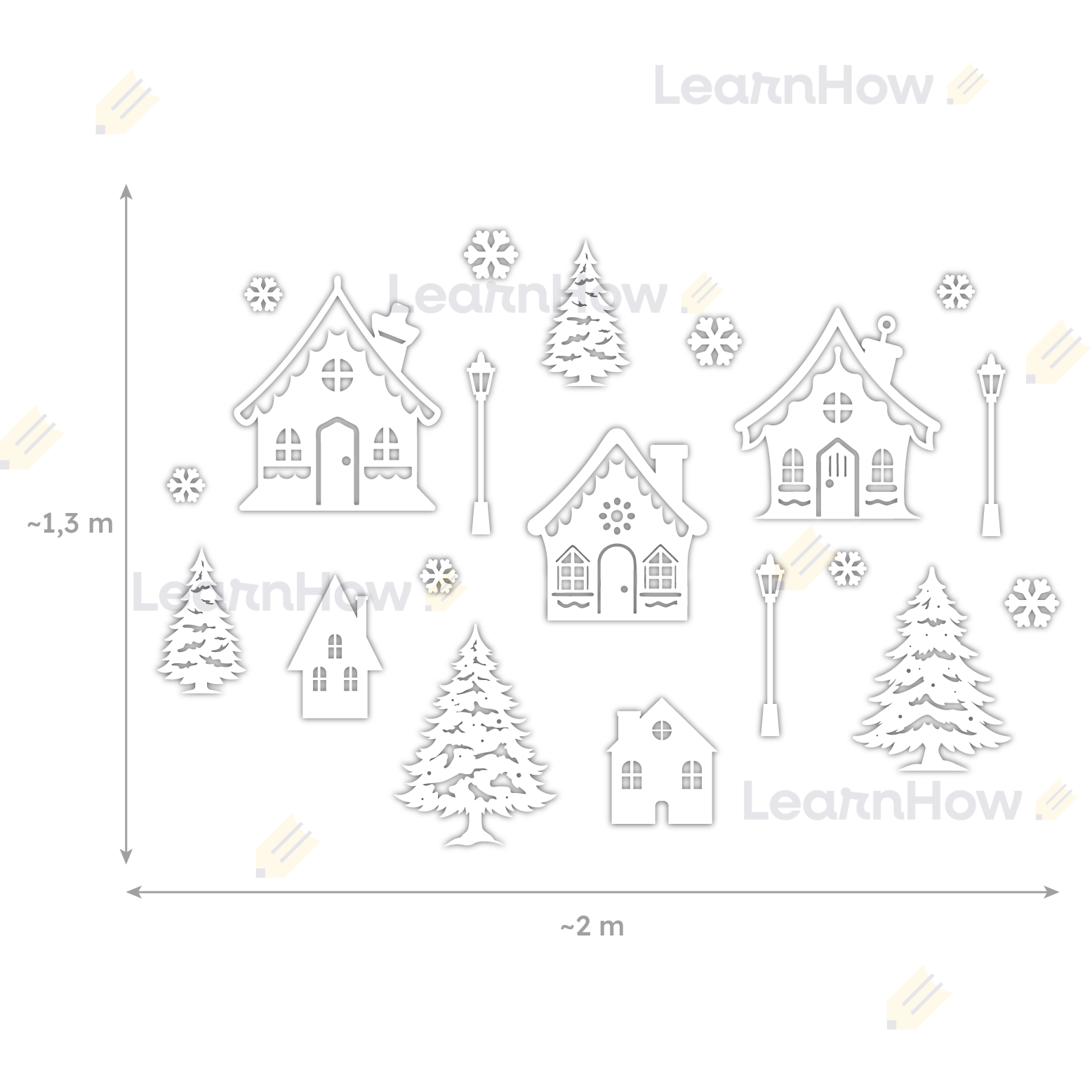 Zestaw składa się z 5 ażurowych domków, 4 choinek, 3 latarnii oraz 8 śnieżynek - idealne szczególnie do szkoły i przedszkola.