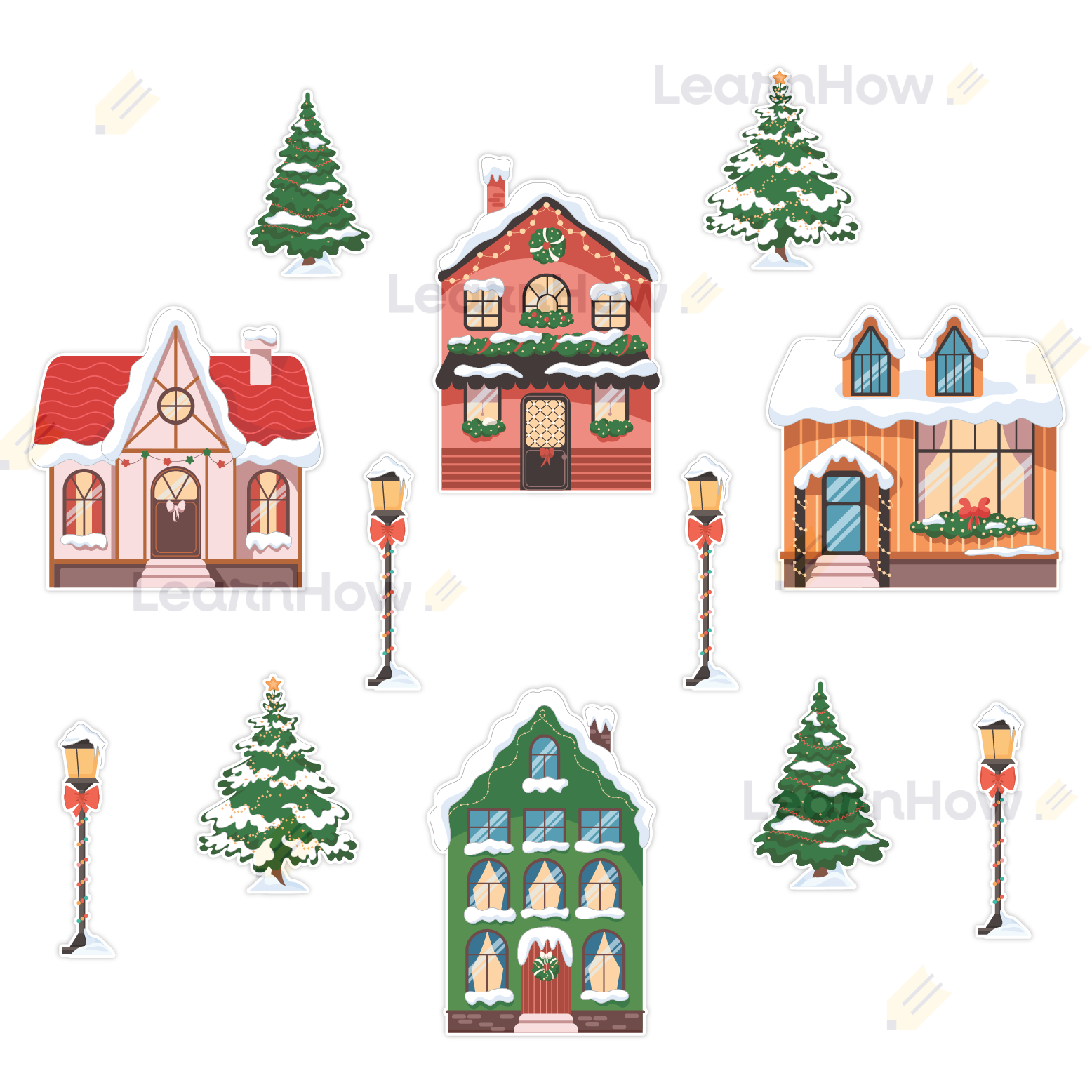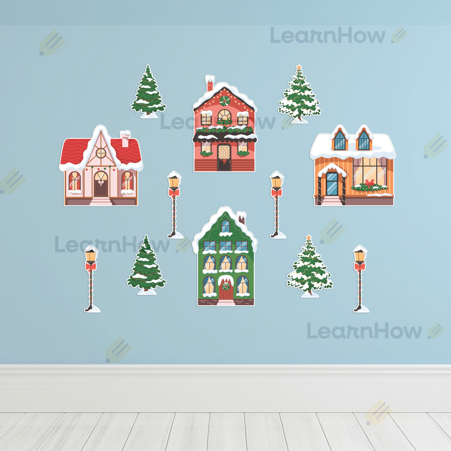 Zestaw dekoracji składa się z 4 dużych zimowych domków, 4 choinek oraz 4 latarni tworzących miasteczko - idealne do zimowej dekoracji szkoły i przedszkola.