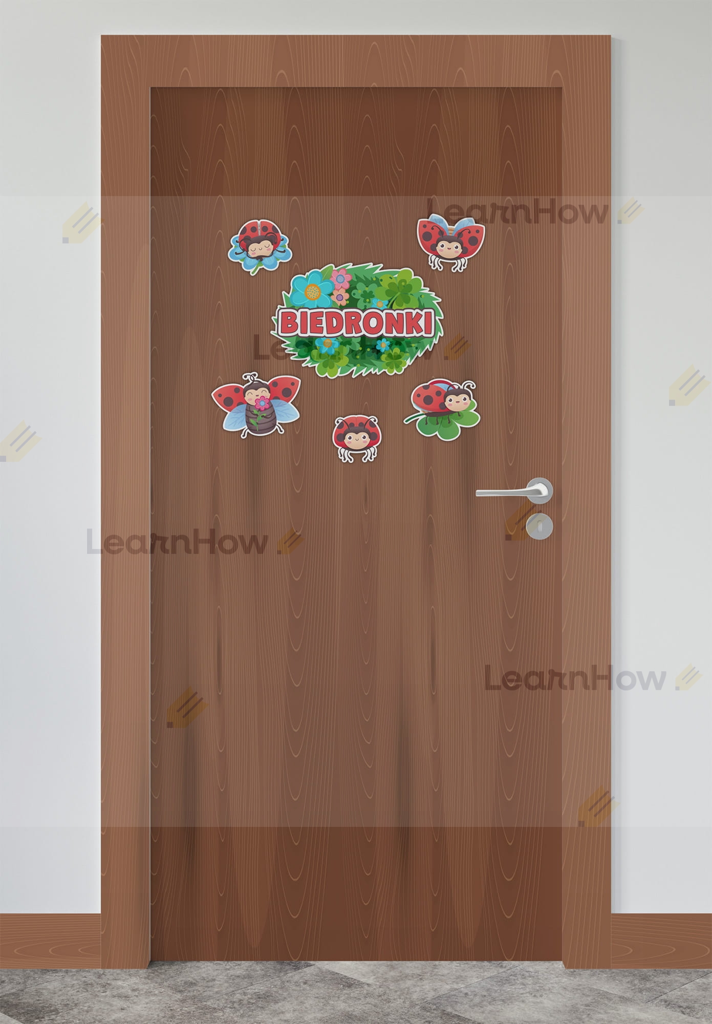 Duża dekoracja na drzwi sali klasowej - doskonała do oznaczania grup w przedszkolu lub na etapie wczesnoszkolnym.