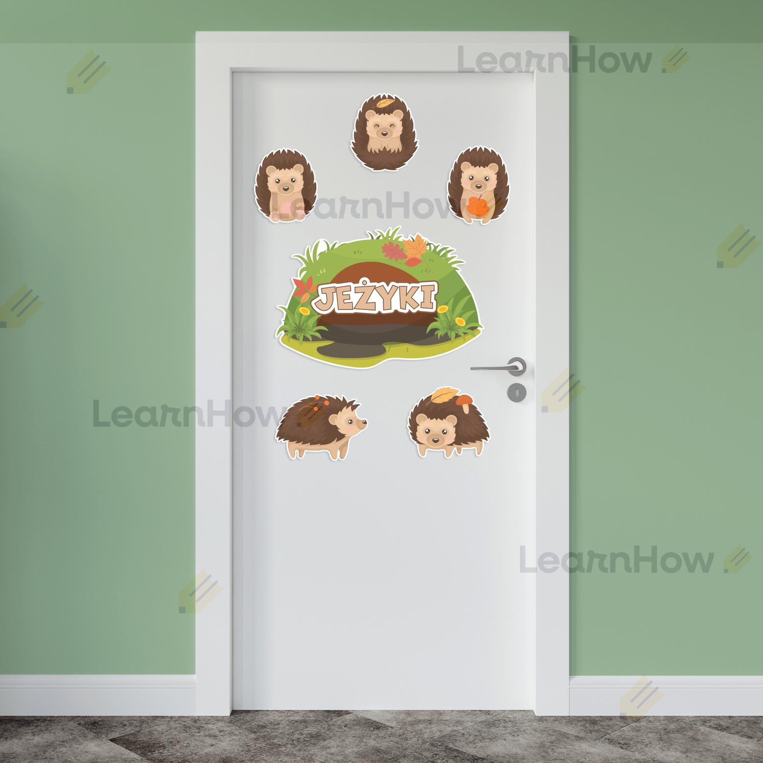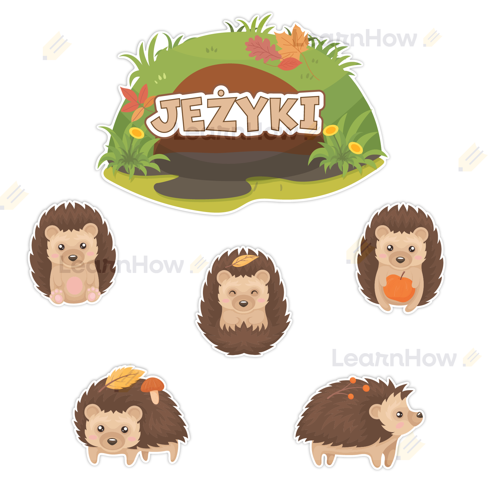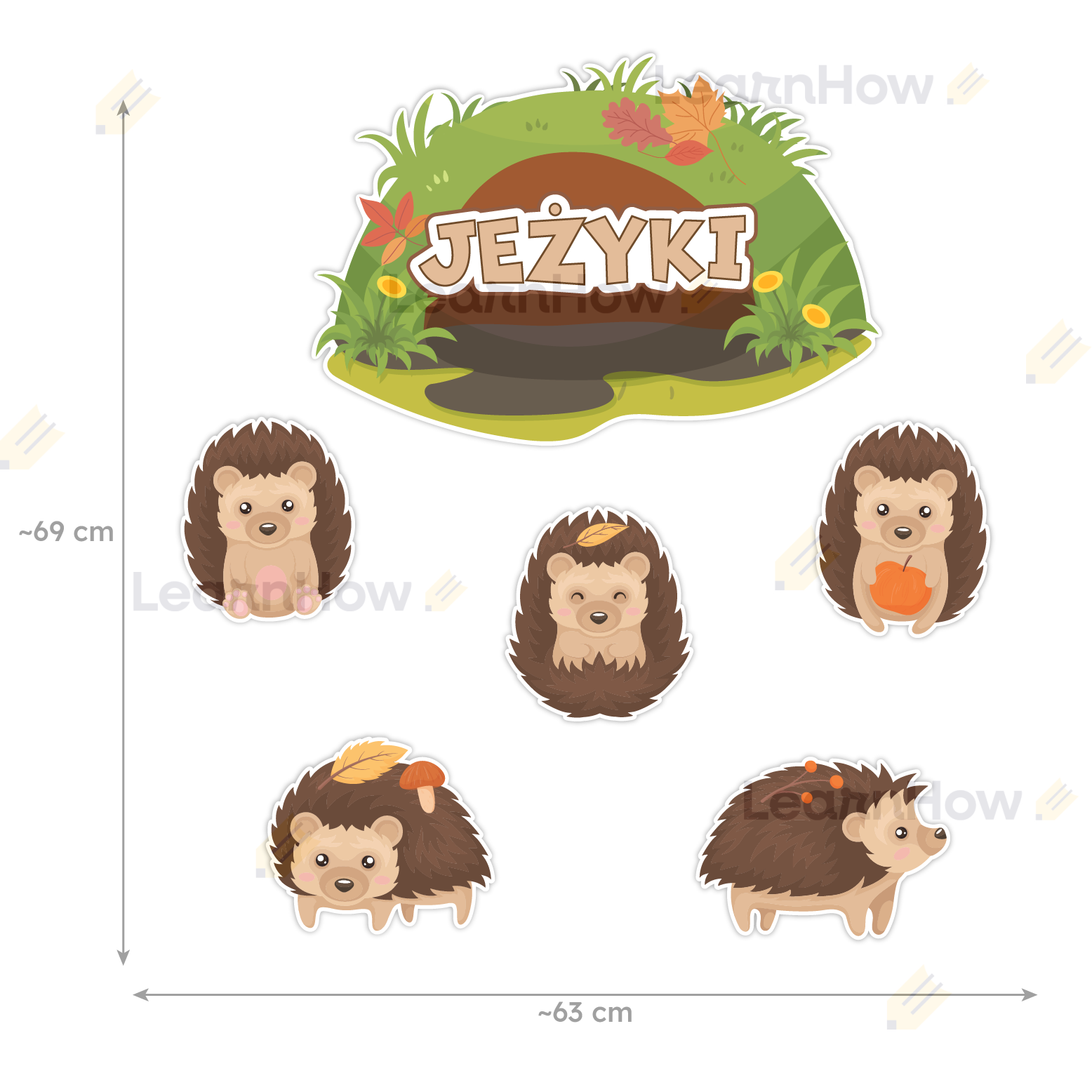 Zestaw zawiera 6 kolorowych elementów - 1 duża tabliczka z napisem "JEŻYKI" i 5 jeżyków.
