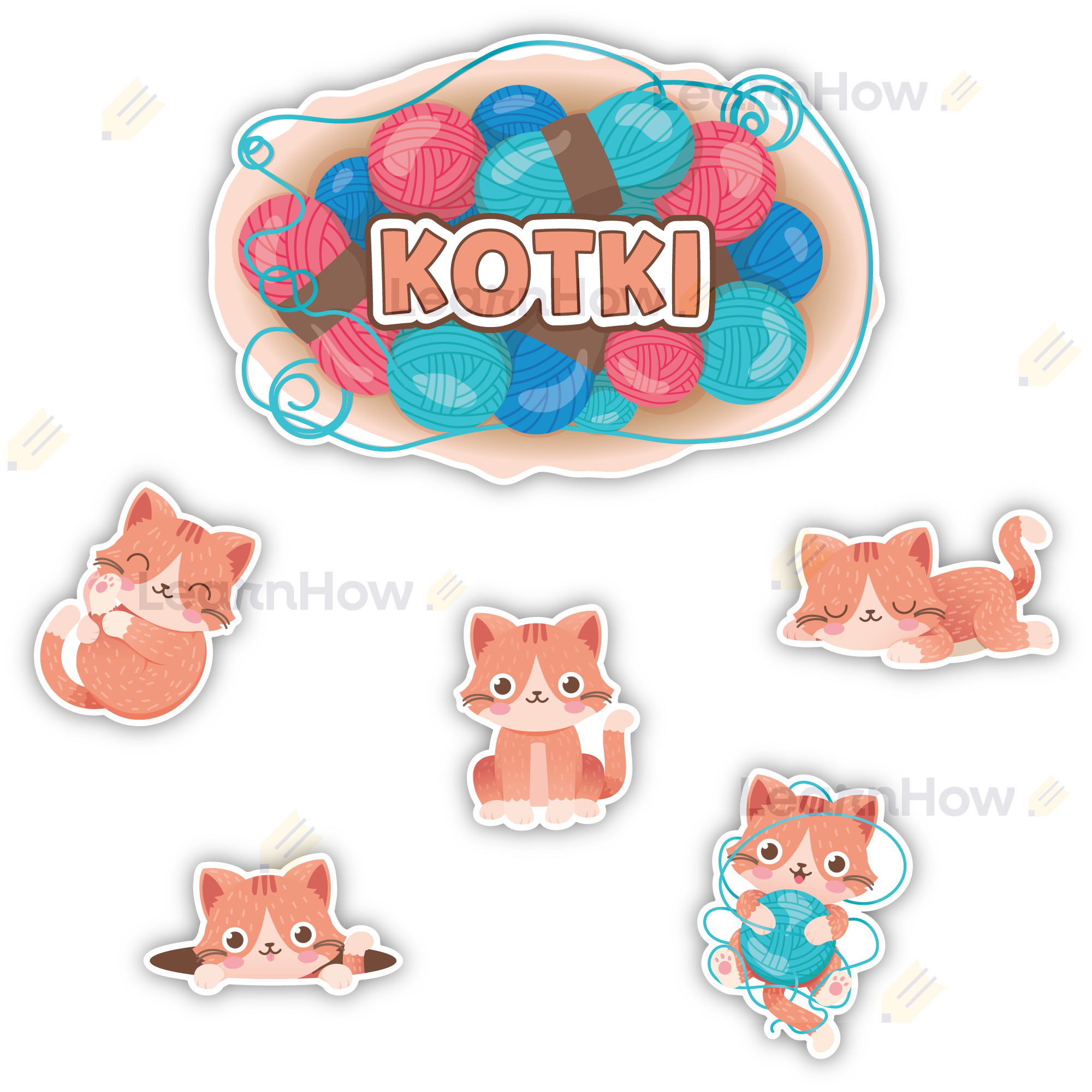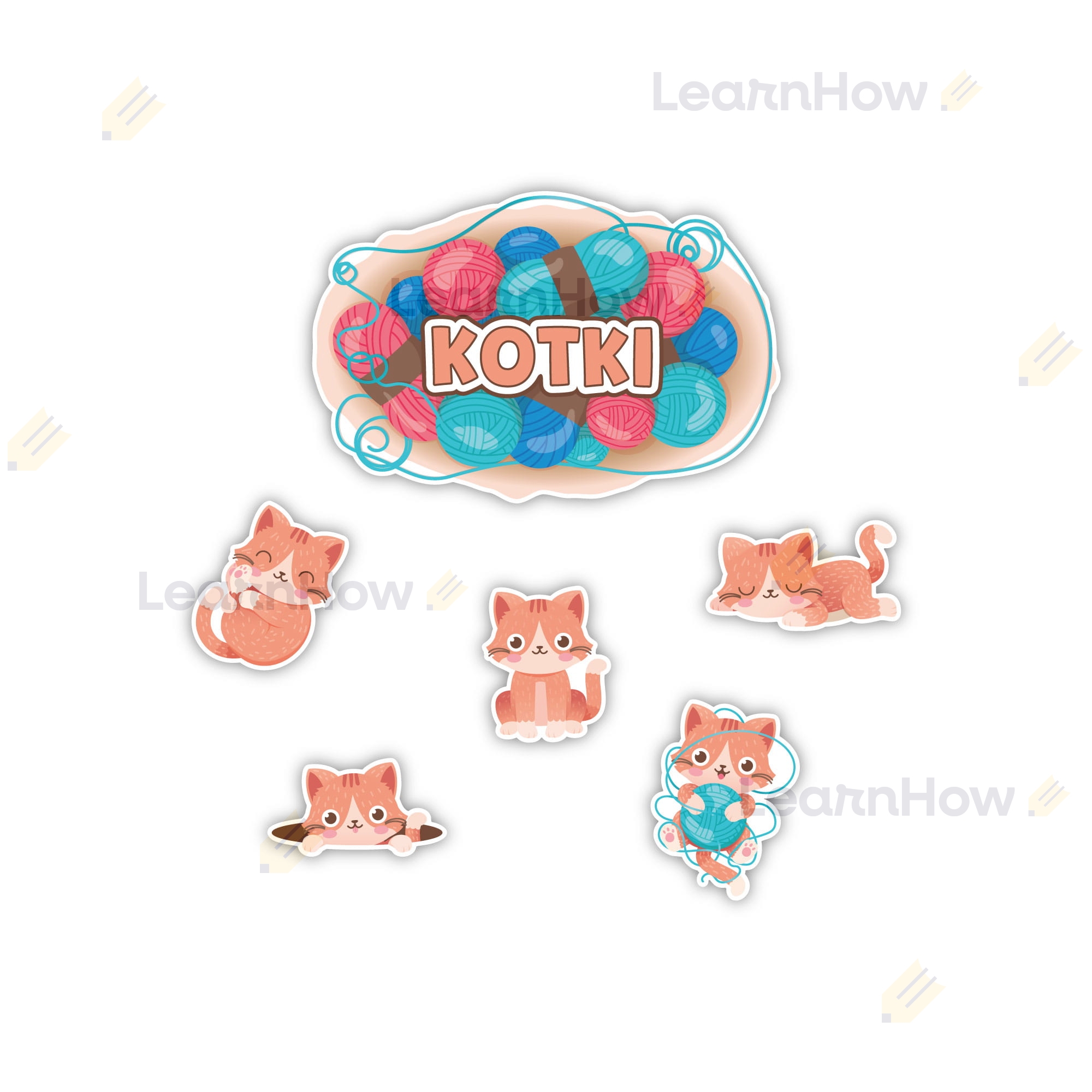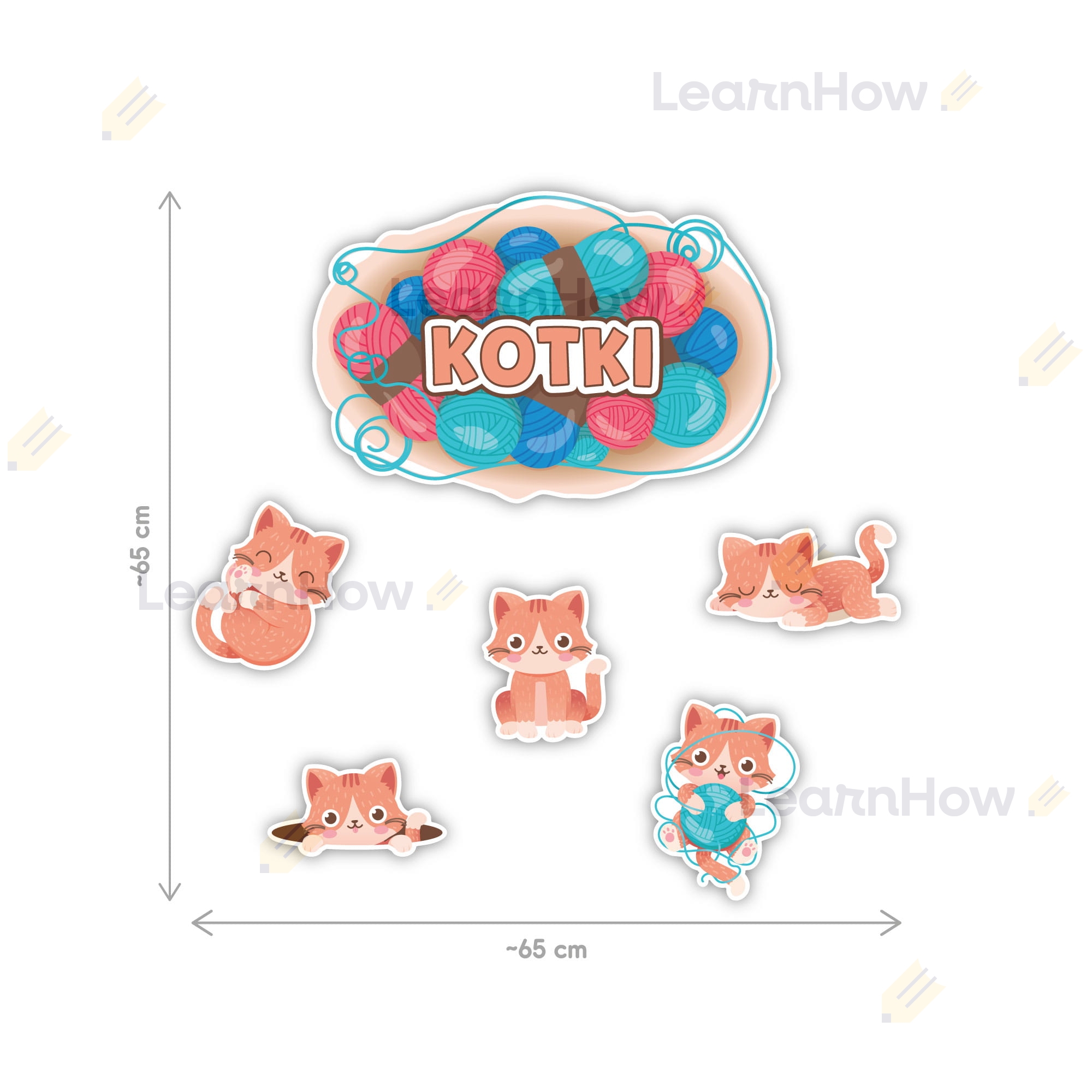 Zestaw zawiera 6 kolorowych elementów - 1 duża tabliczka z napisem "KOTKI" i 5 kotków.