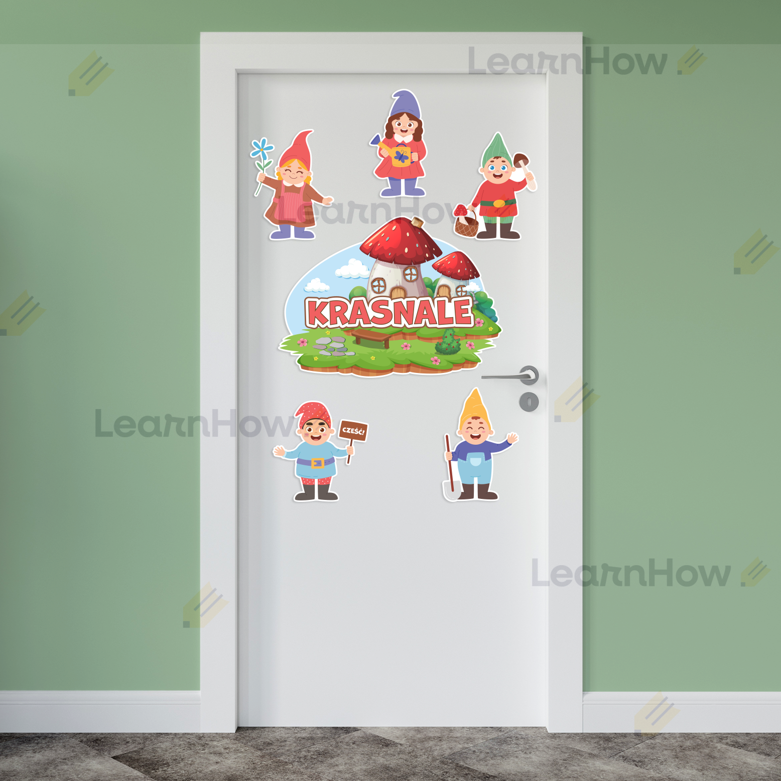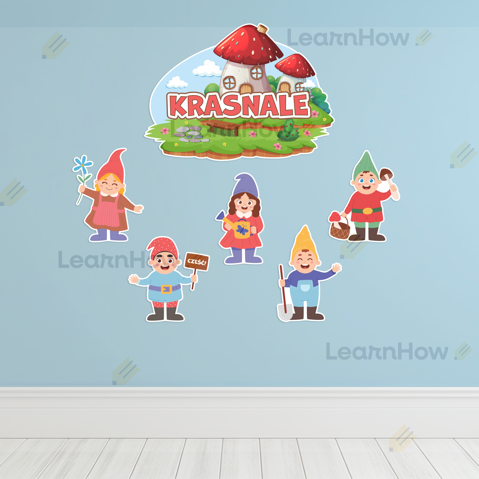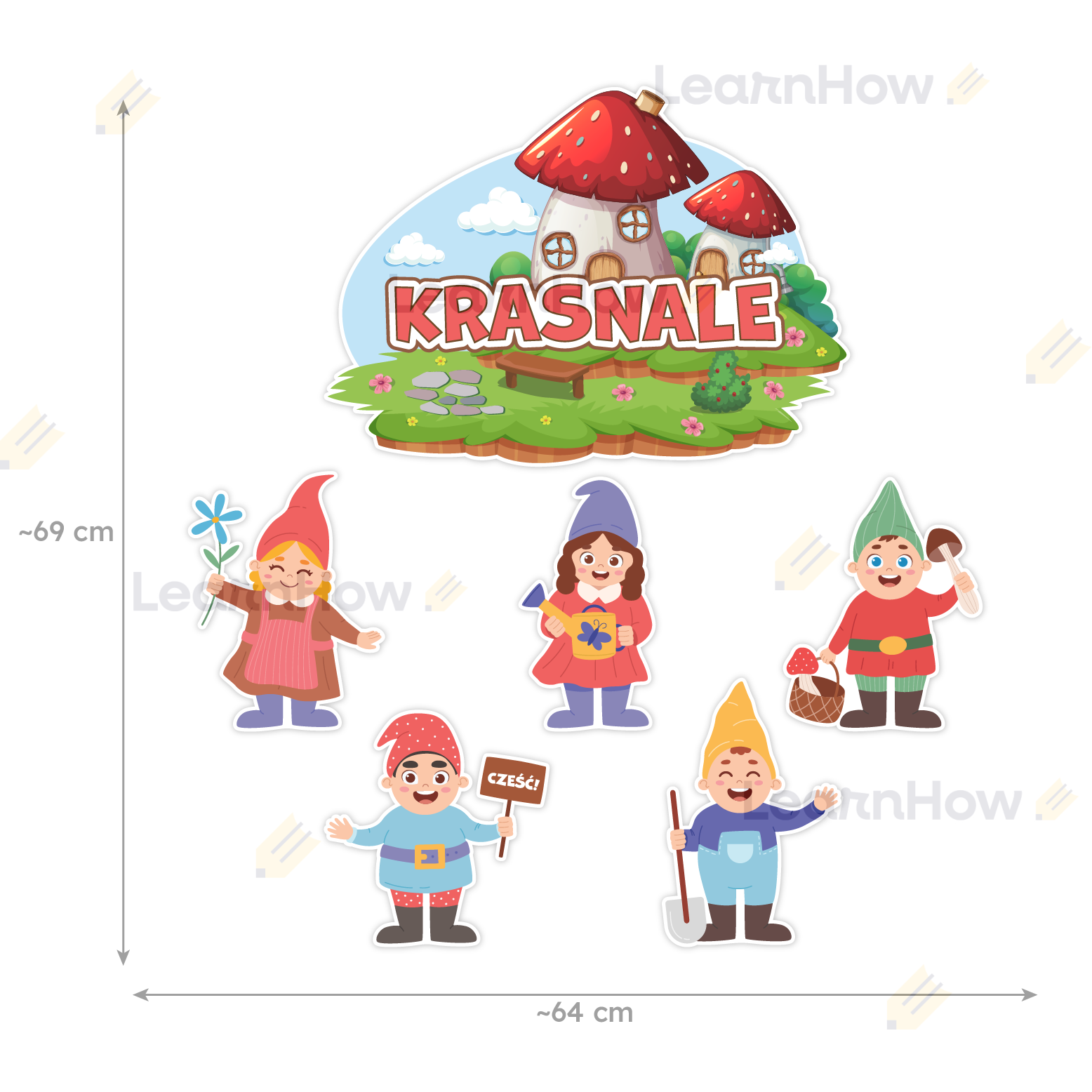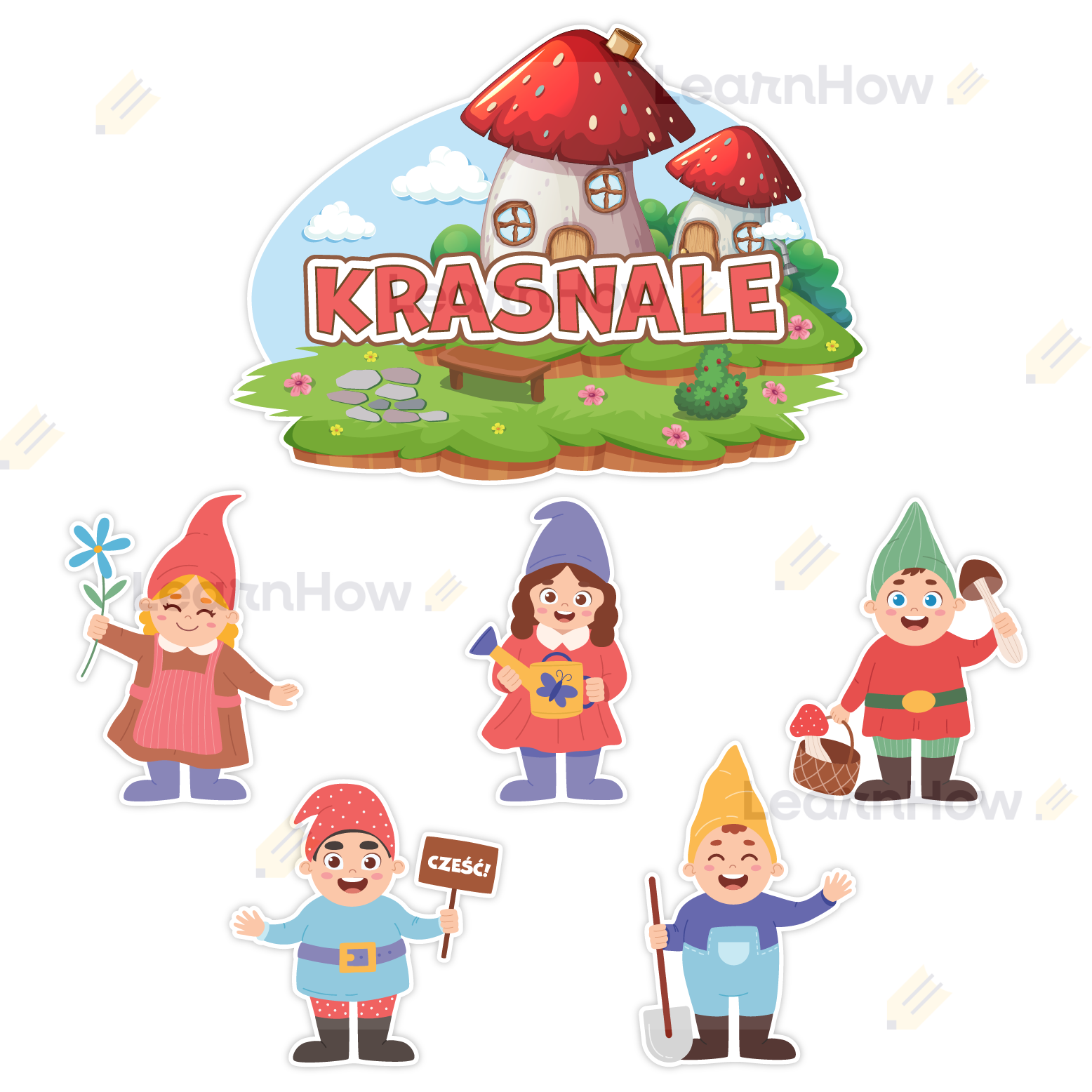Zestaw zawiera 6 kolorowych elementów - 1 duża tabliczka z napisem "KRASNALE" i 5 krasnali.