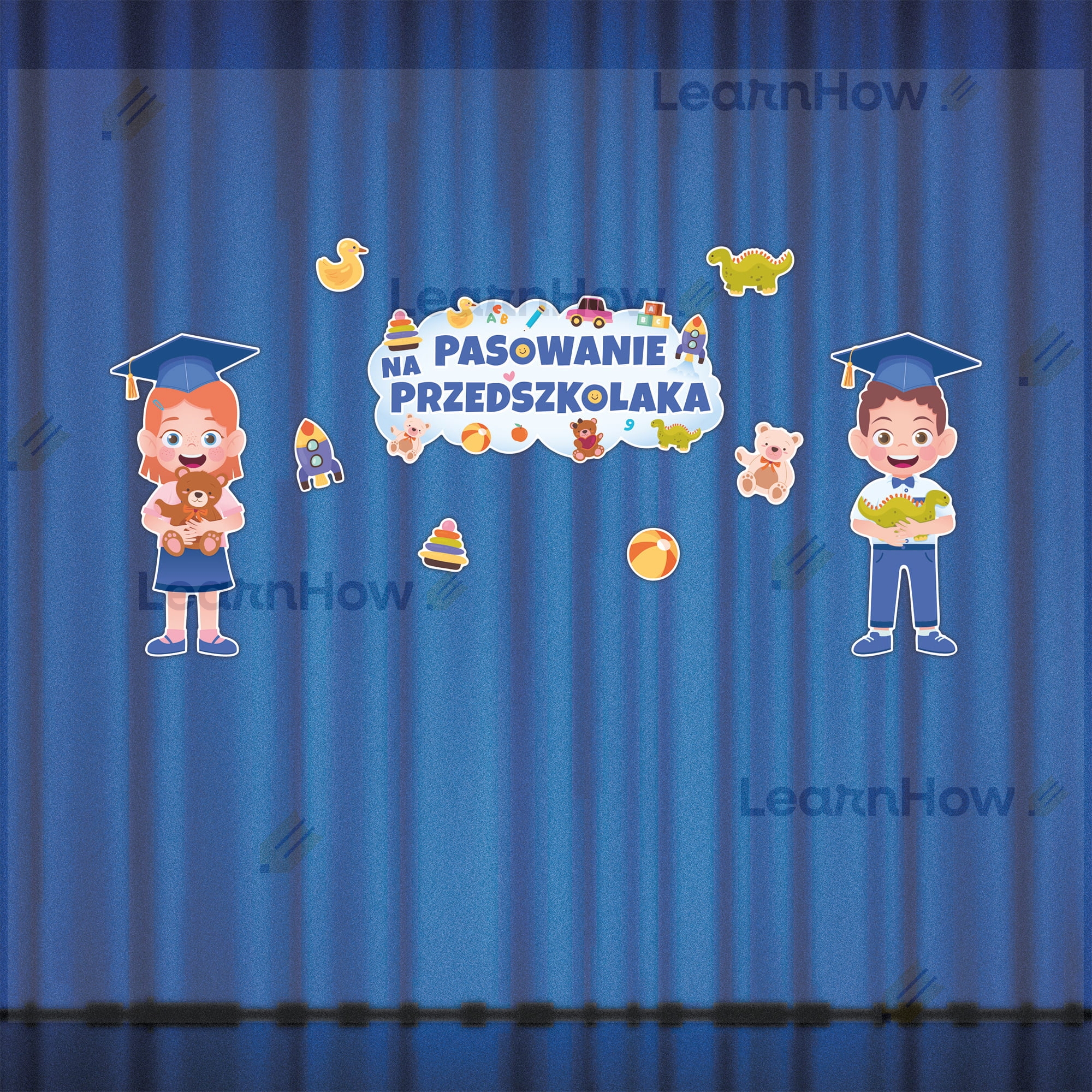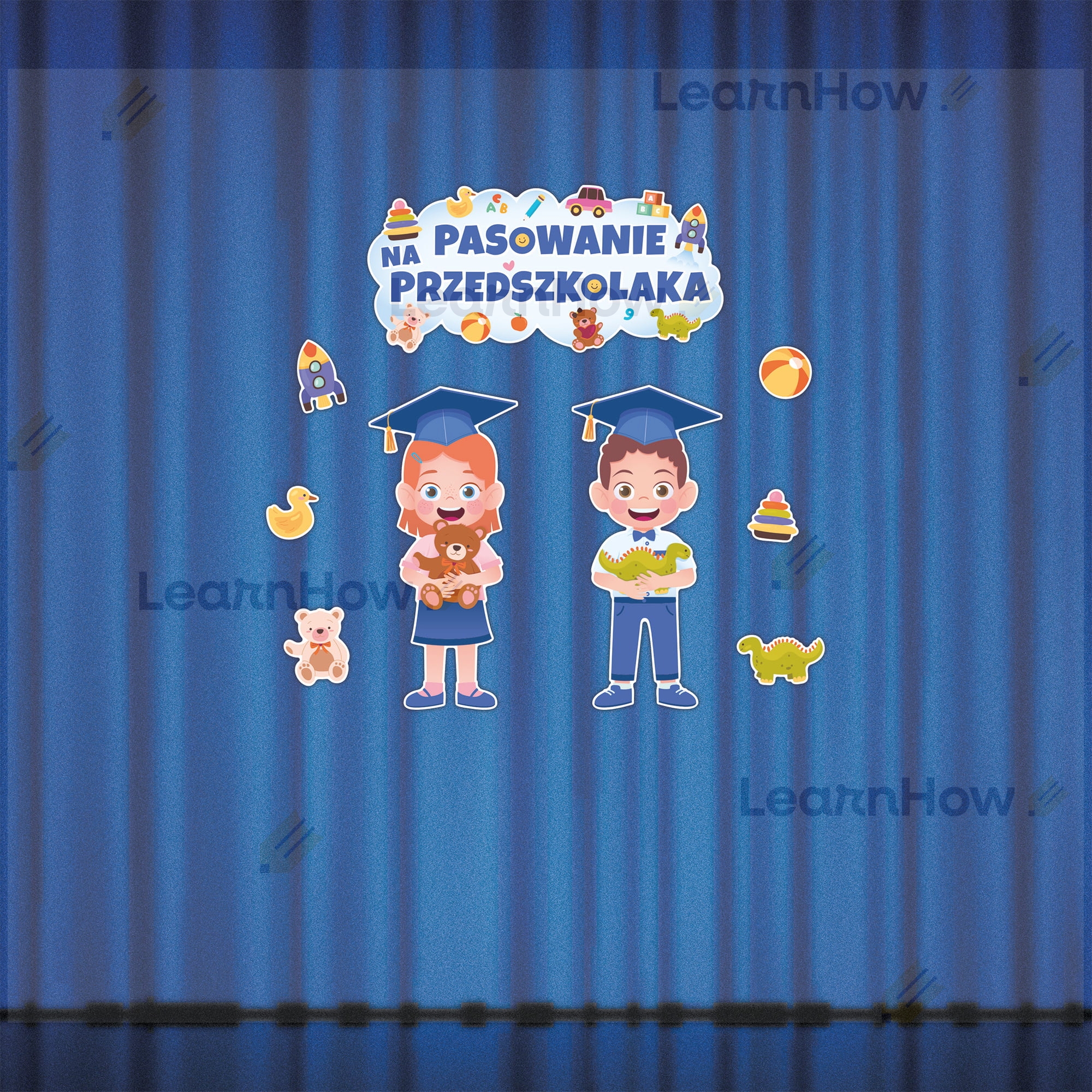 Zestaw składa się z 1 elementu napisu "PASOWANIE NA PRZEDSZKOLAKA", 2 postaci dzieci oraz 6 elementów dekoracyjnych związanych z tematyką przedszkolną.