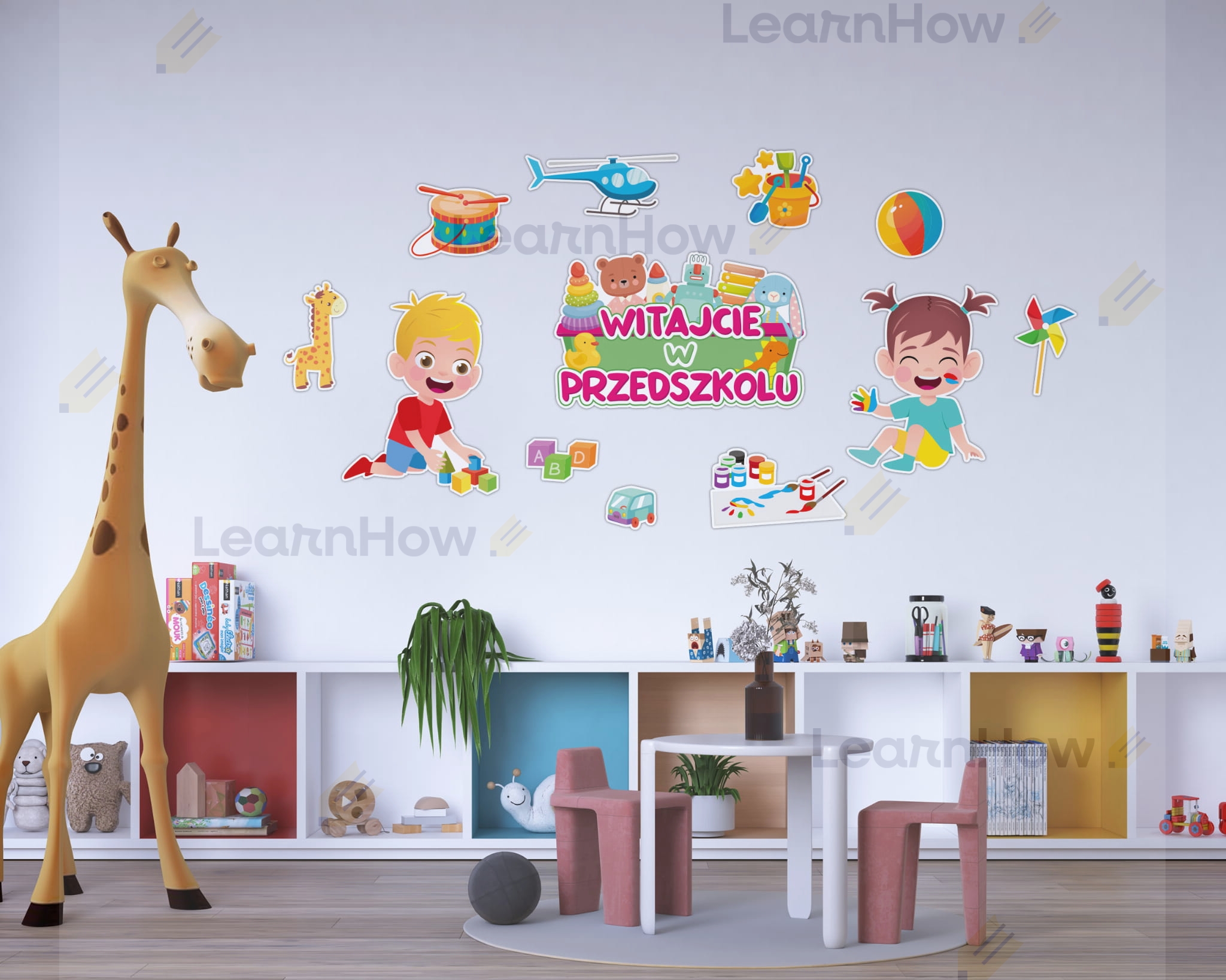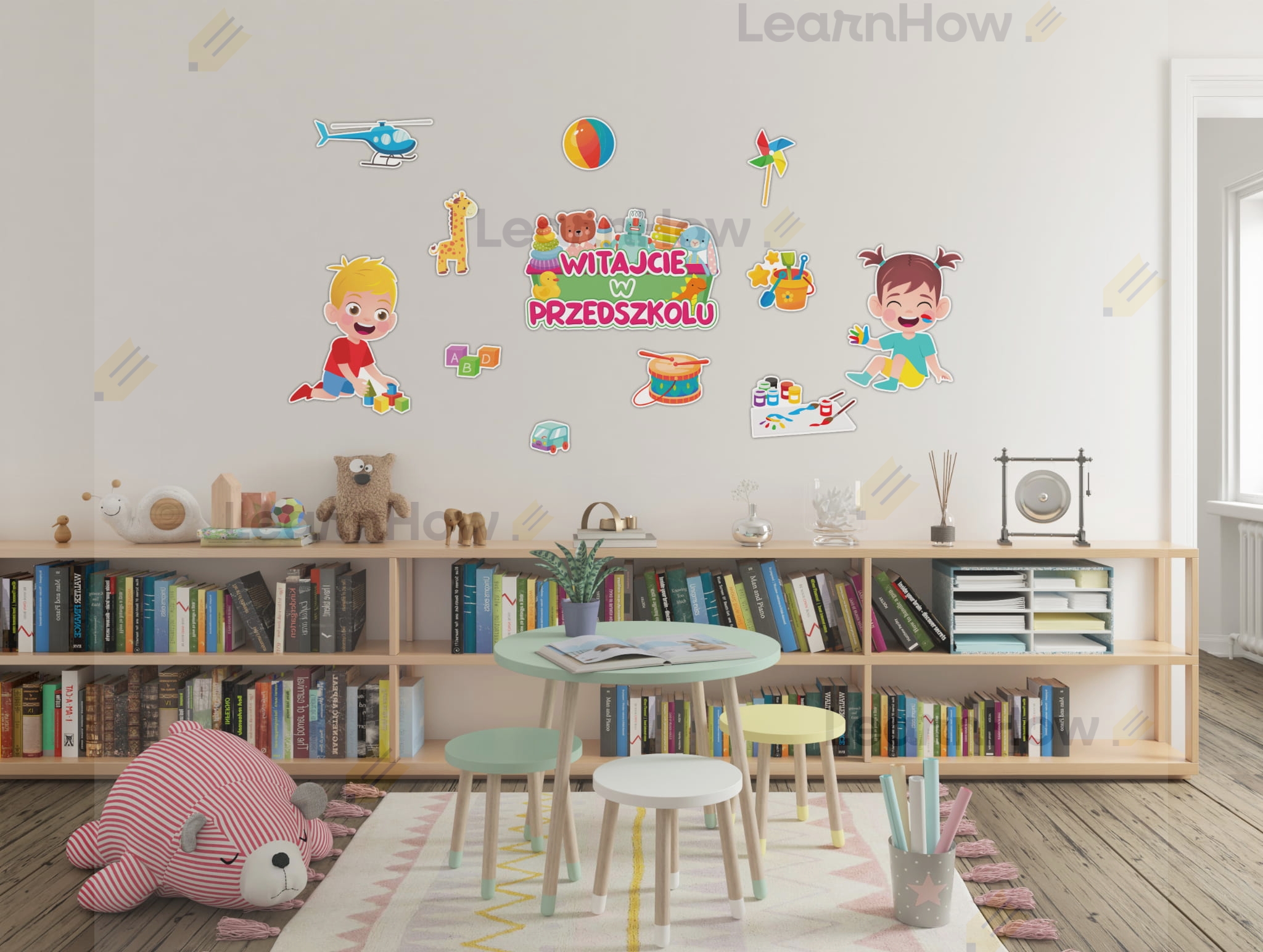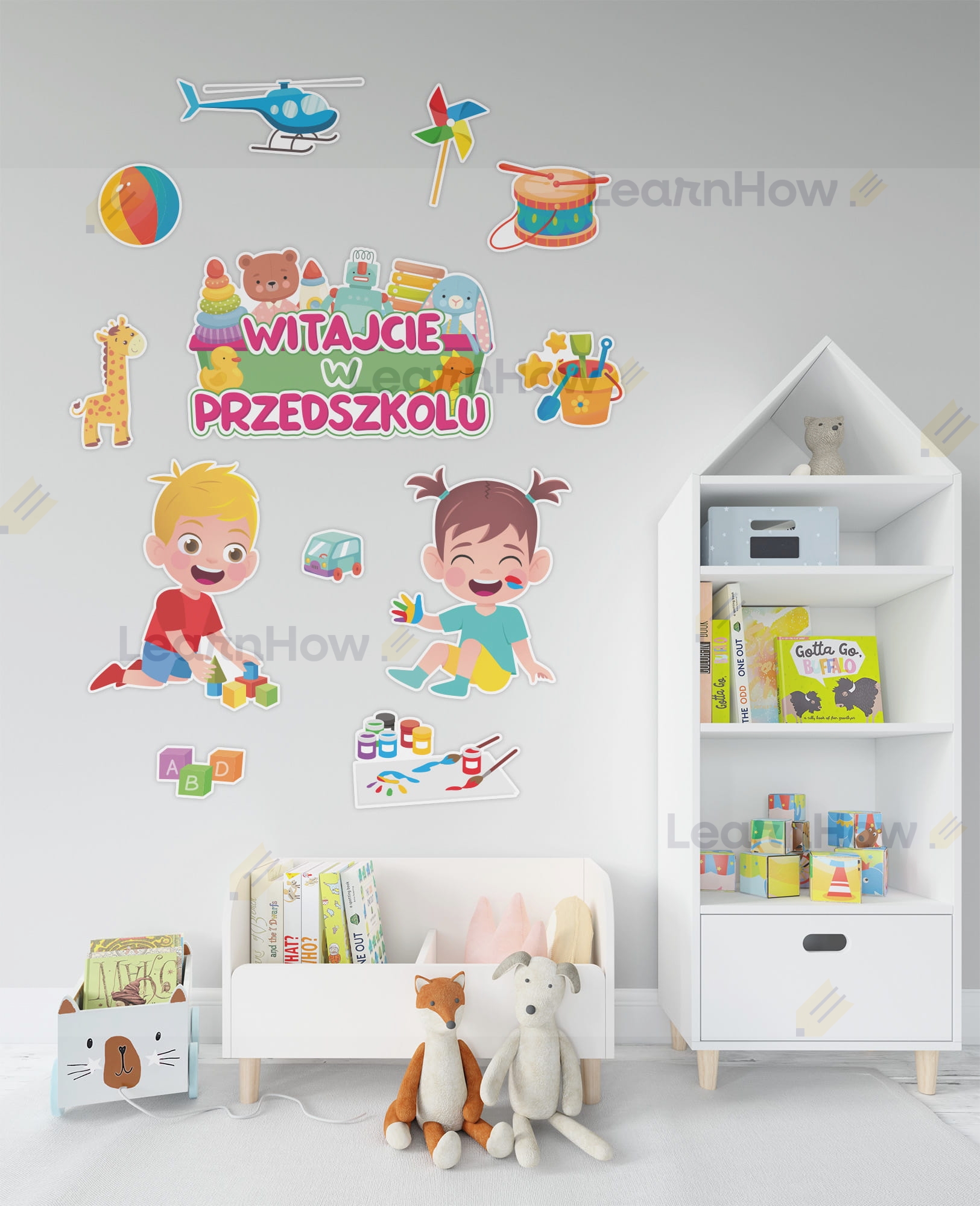 Zestaw składa się z: 2 postaci dzieci, 9 elementów dekoracyjnych związanych z tematyką przedszkolną oraz dużego napisu WITAJCIE W PRZEDSZKOLU na skrzynce z zabawkami .