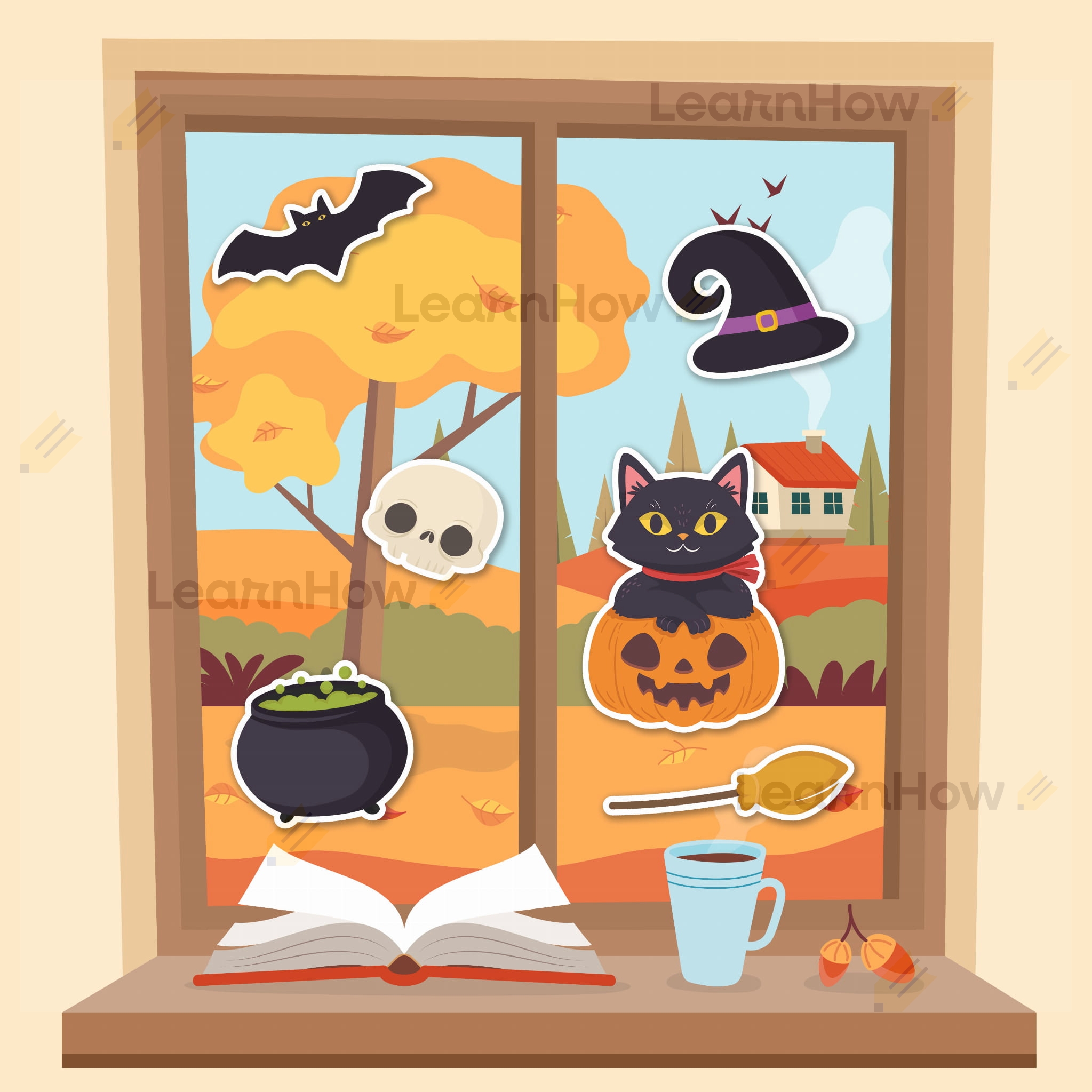 W skład zestawu wchodzą: nietoperz, czaszka, miotła, kapelusz czarownicy oraz kot siedzący w dyni.