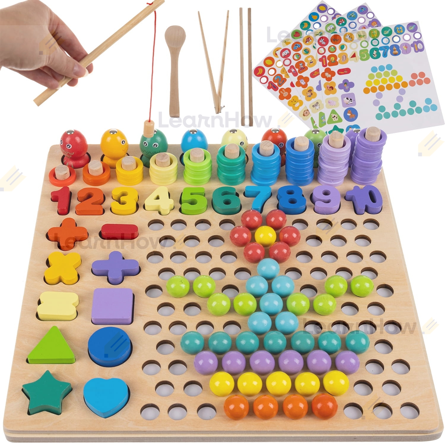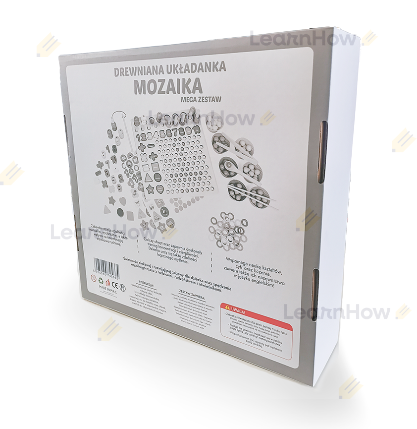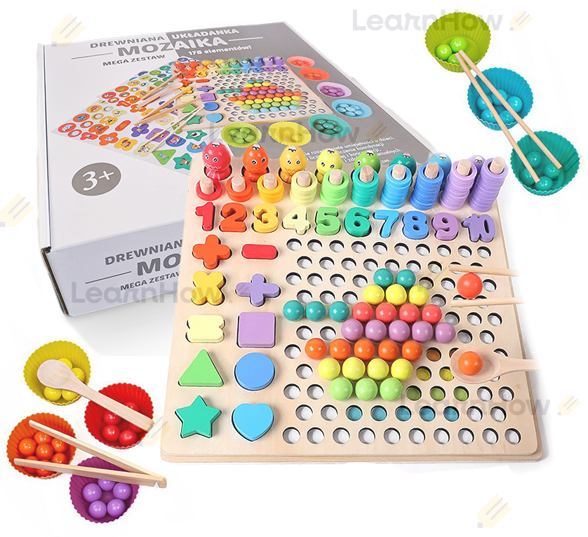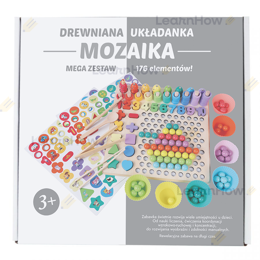 - UCZY – Zabawa z mozaiką to świetny sposób na rozwijanie zdolności manualnych, zręczności, ćwiczenie koordynacji wzrokowo-ruchowej oraz praktykowanie zdolności logicznego myślenia. Z zabawką dzieci ćwiczą również cierpliwość i koncentrację. Drewniana układanka koraliki bardzo dobrze sprawdzi się również przy nauce liczb, ponadto może okazać się pomocna przy wykonywaniu prostych działań matematycznych. Z jej pomocą dziecko szybko nauczy się rozpoznawać kolory oraz tworzyć figury geometryczne z koralików.