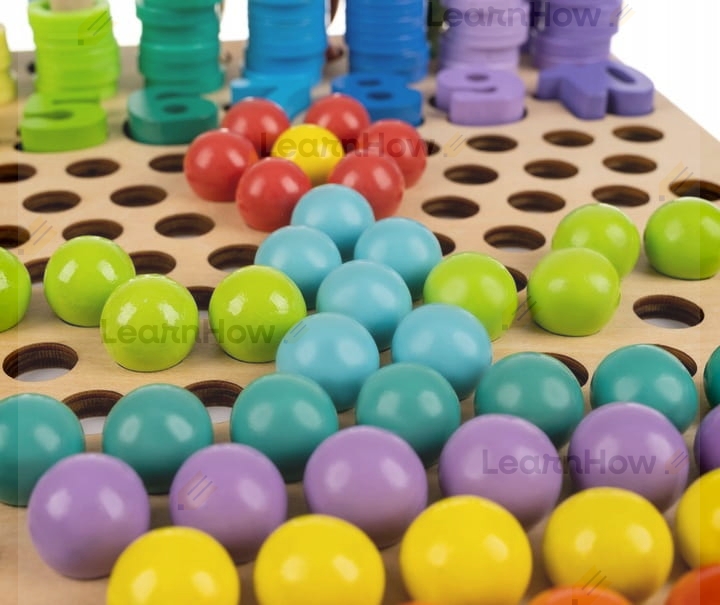 Układanie kolorowych kulek wymaga precyzji ruchów ręki - zabawka usprawni motorykę, pozwoli opanować chwyt pisarski oraz rozwinie umiejętności grafomotoryczne.