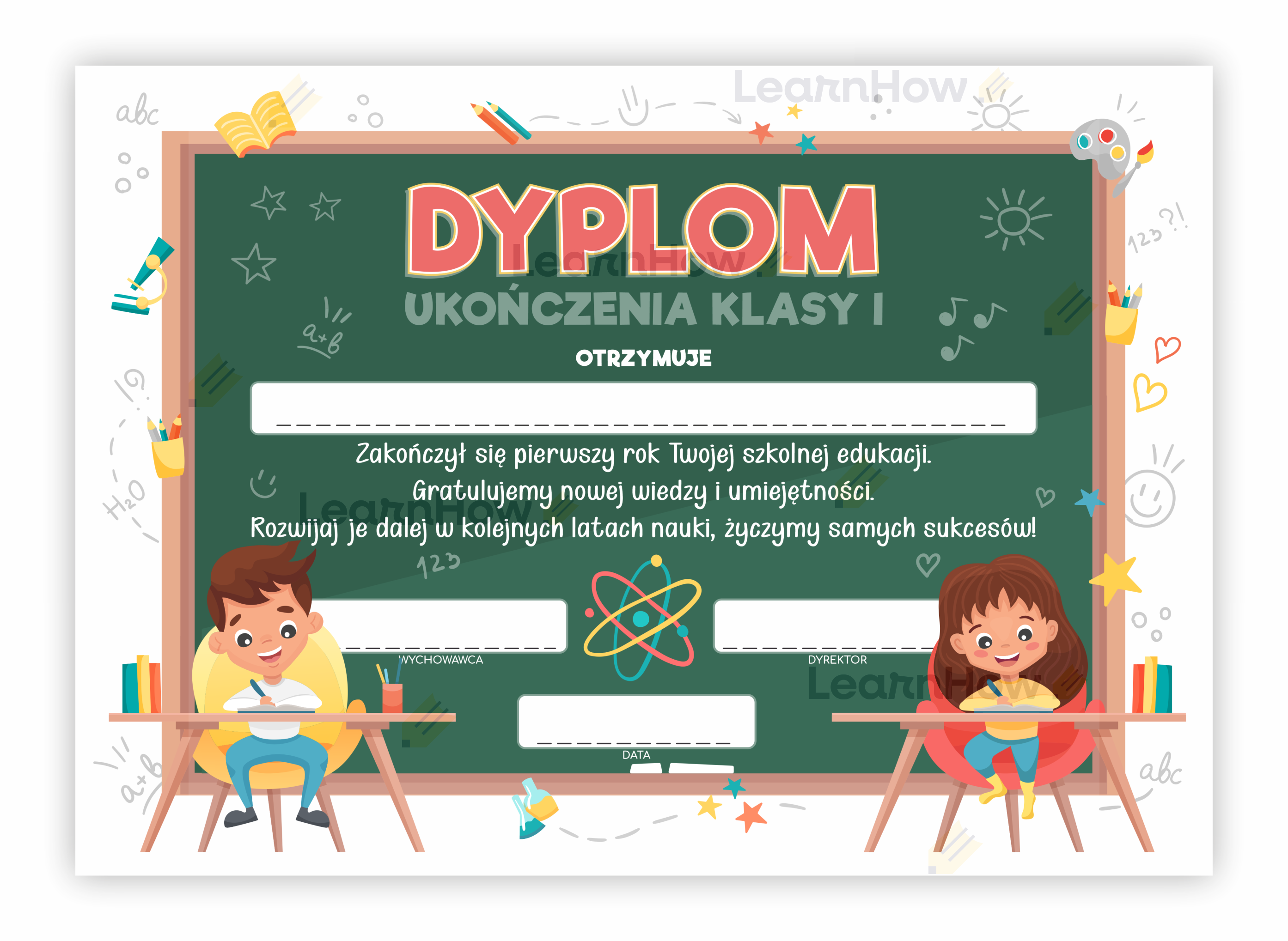 Dyplom ukończenia klasy pierwszej idealnie sprawdzi się jako pamiątka zakończenia pierwszego roku w szkole!