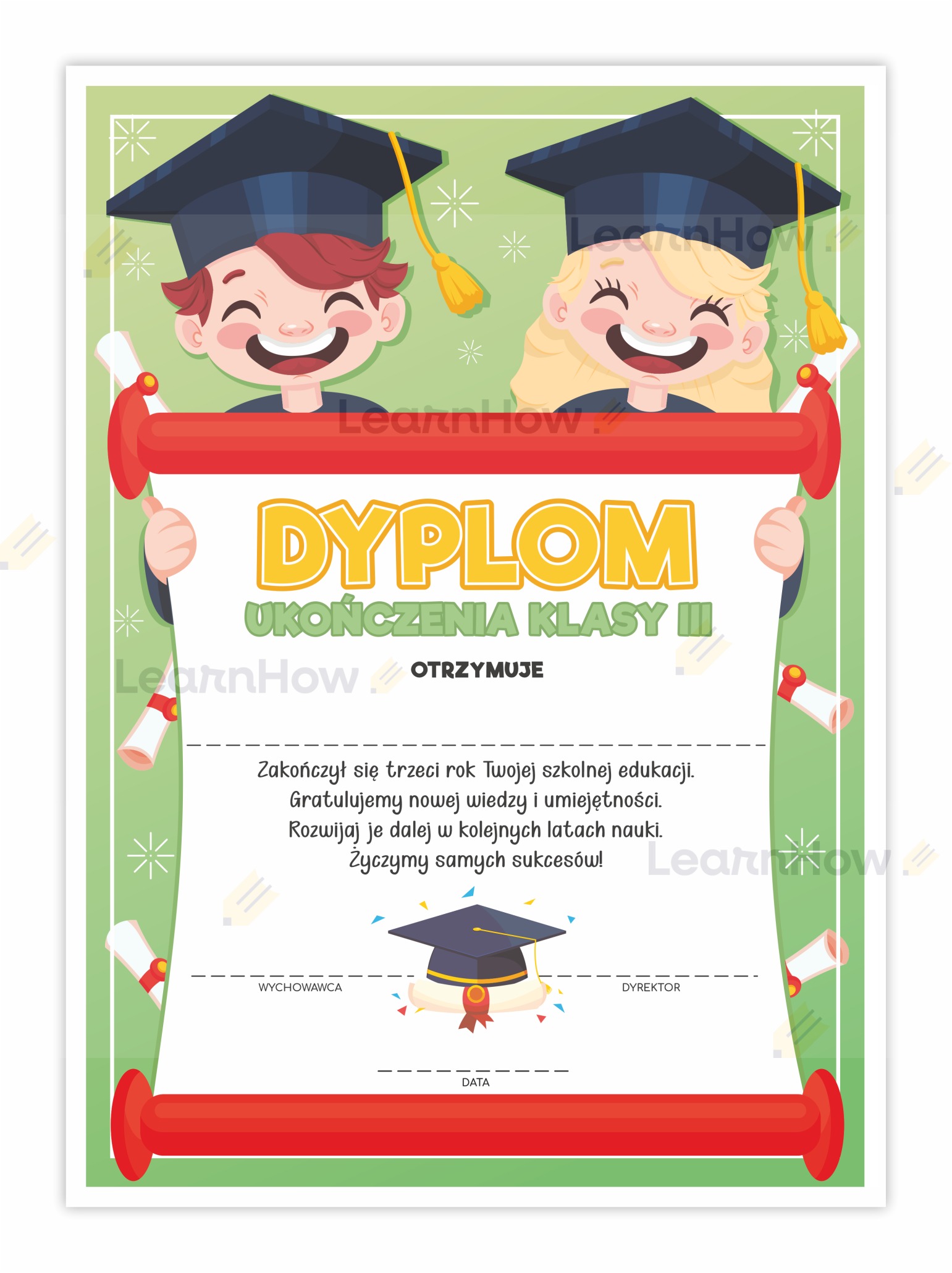 Dyplom ukończenia klasy trzeciej idealnie sprawdzi się jako pamiątka zakończenia trzeciego roku w szkole!