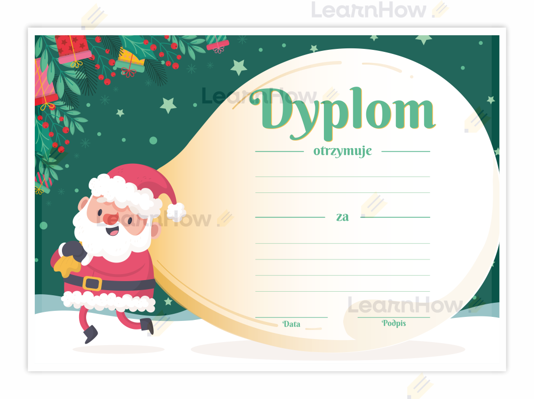 Kolorowe obrazki oraz świąteczny motyw z Mikołajem na dyplomie dodają mu uroku, a także urozmaicą każdemu dziecku szkolne konkursy.