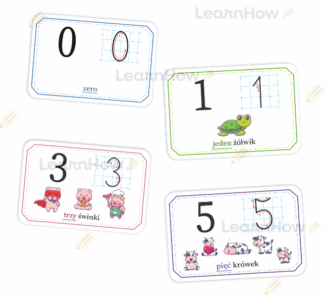 Cyferki na fiszkach są zapisane stylem drukowanym oraz pisanym.