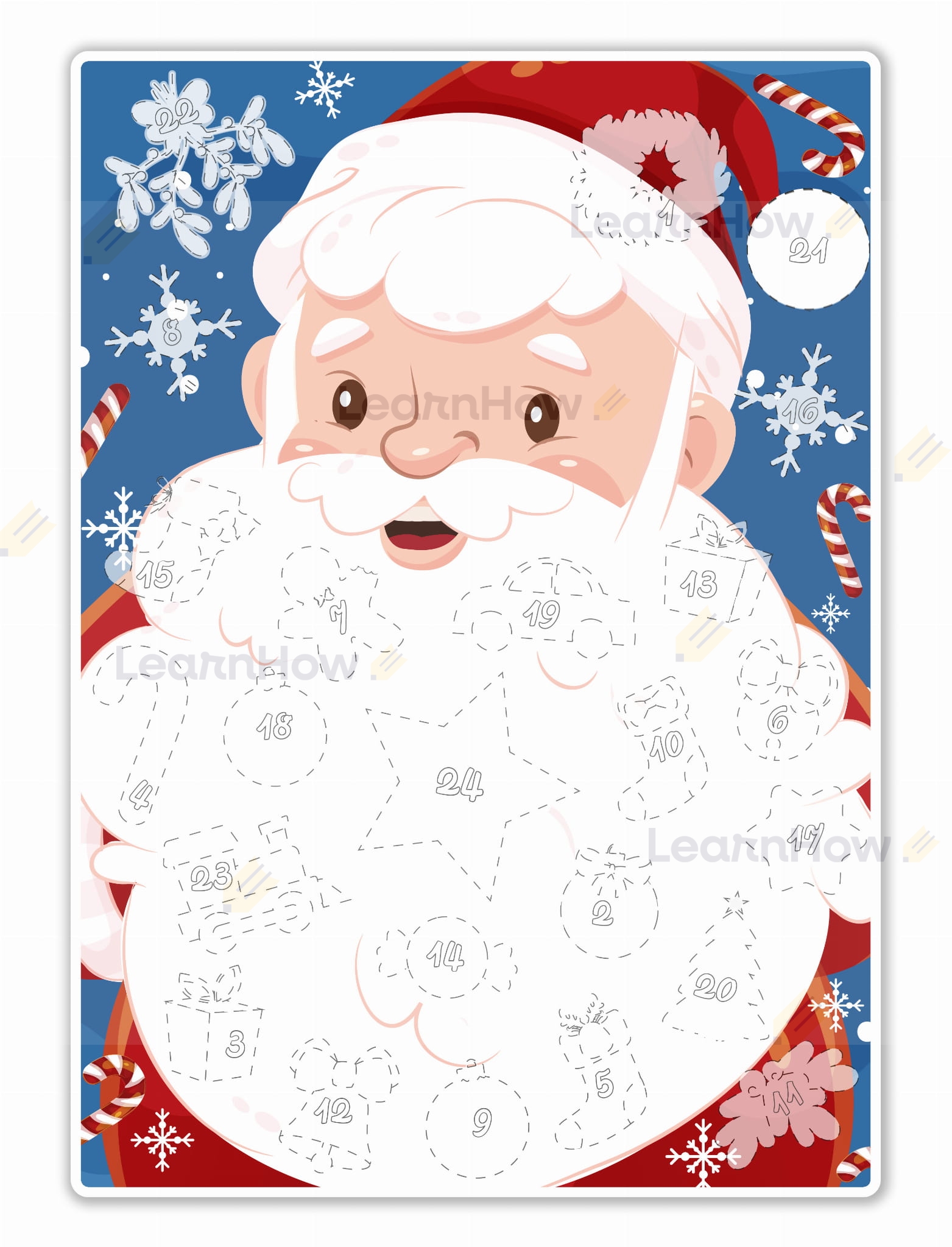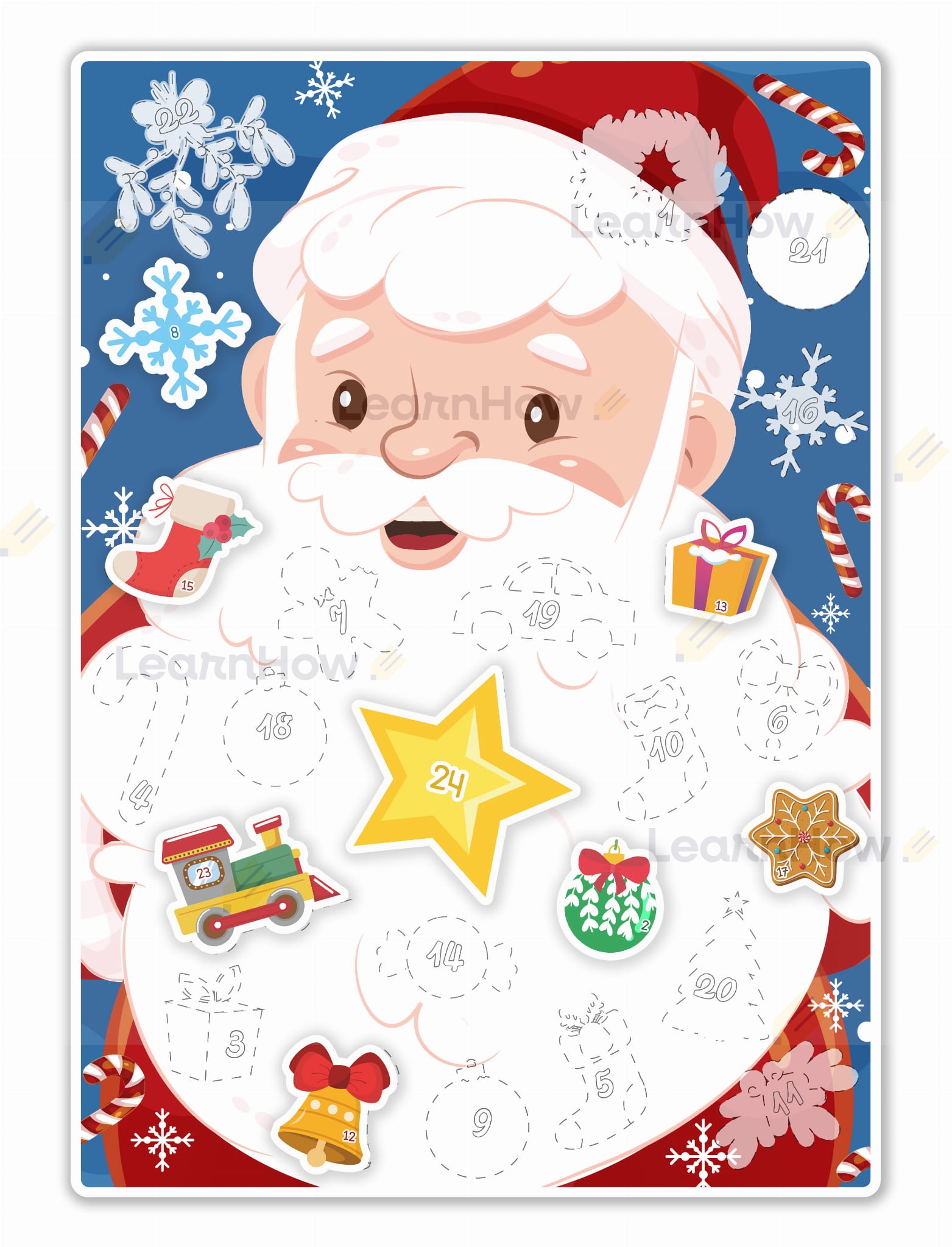 Gdy danego dnia wykonamy już zdanie to za pomocą dwustronnej kropki klejowej(są w zestawie) przyklejamy ozdobę z numerem dnia na brodzie mikołaja. Dzięki czemu 24 dnia grudnia uzyskamy fajną pamiątkę ze wspólnie spędzonego czasu.
