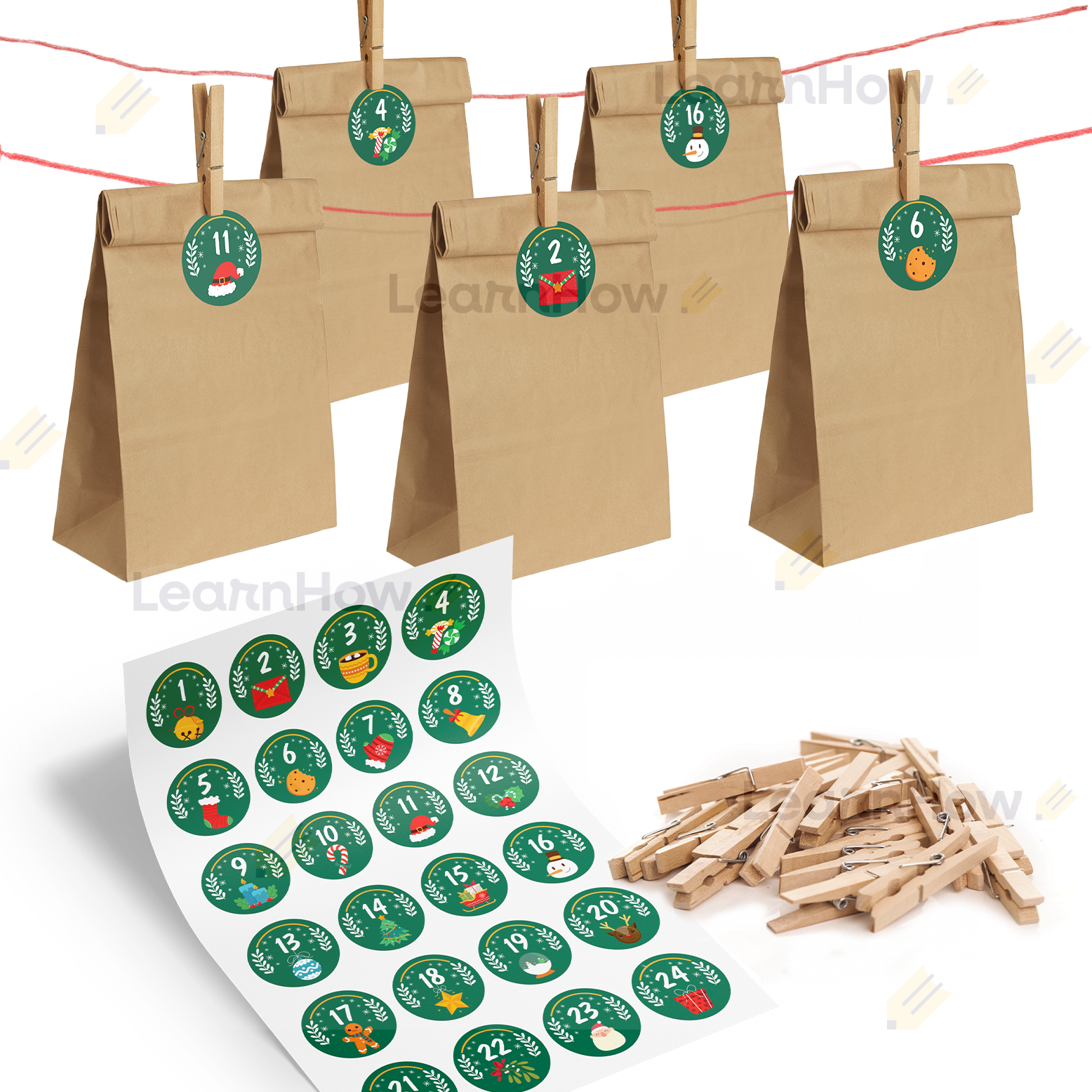 W zestawie znajdują się 24 naklejki o średnicy 4 cm z motywem świątecznym + 24 torby papierowe i dodatkowo 24 drewniane klamerki.