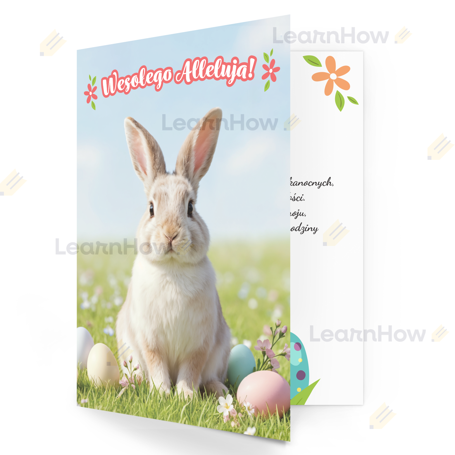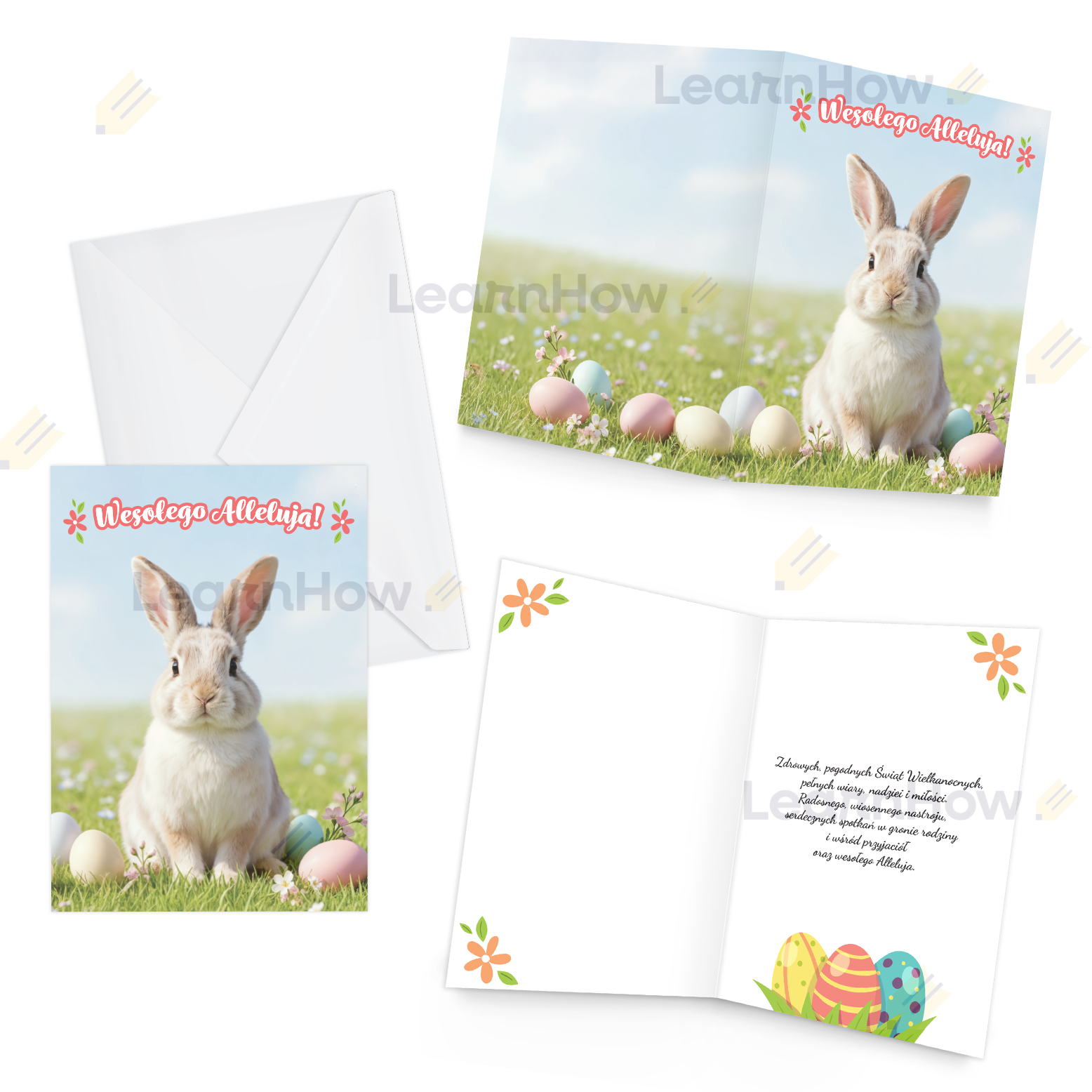 Kartka jest dwustronna, składana – na okładce znajduje się napis „Wesołego Alleluja!”, natomiast w środku umieszczono uniwersalne, ciepłe życzenia!