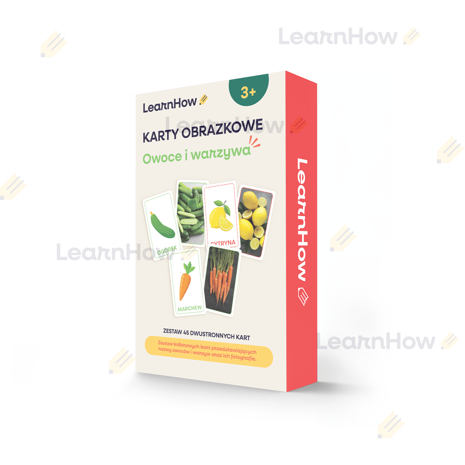 Zestaw zawiera aż 45 kolorowych, dwustronnych kart z nazwami owoców i warzyw oraz ich fotografiami!