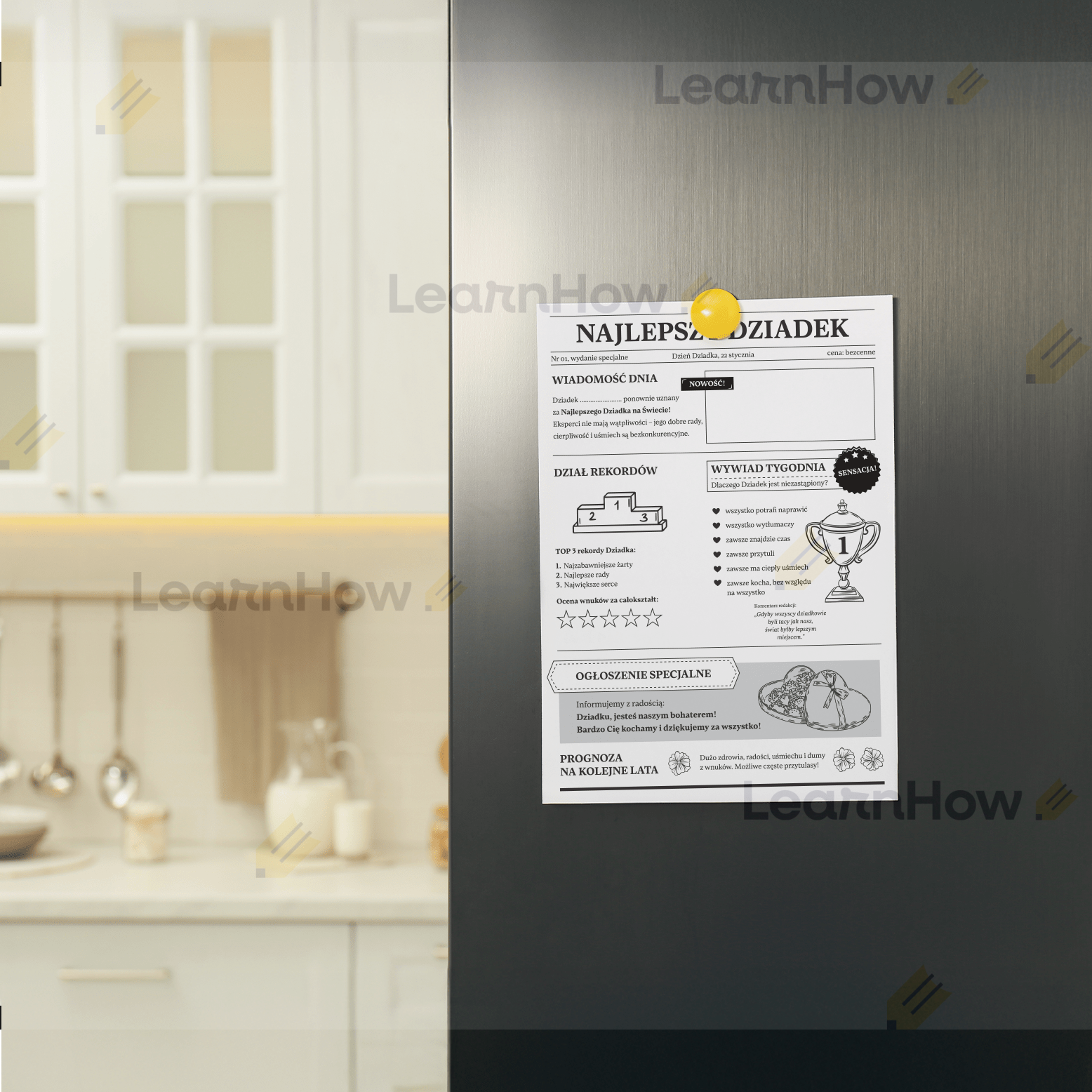 Na gazetce znajduje się miejsce na wpisanie imienia Dziadka, narysowanie jego portretu oraz pokolorowanie pozostałych elementów.