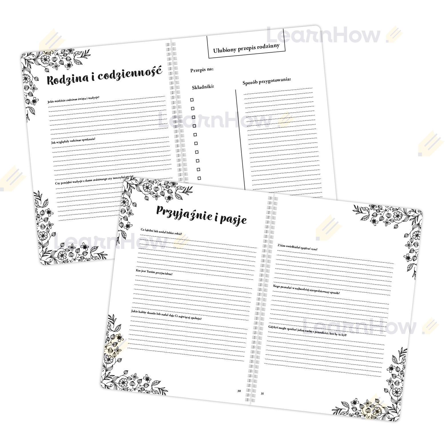 W każdym rozdziale znajdują się przemyślane pytania, a w niektórych dodatkowe miejsca na zdjęcia, rysunki czy inne notatki, co sprawia, że wypełniona książka staje się absolutnie niepowtarzalna.