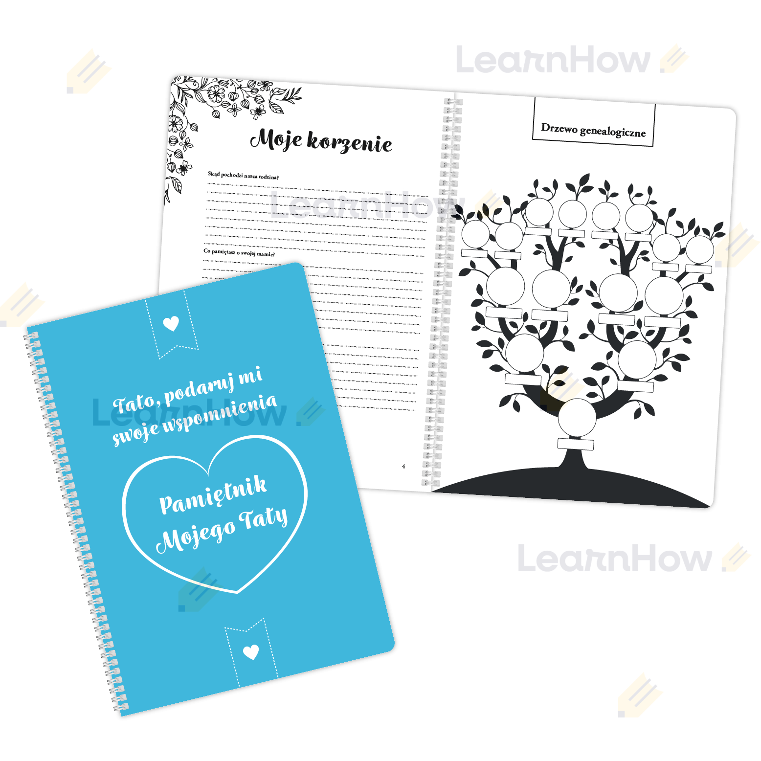 Książka składa się z 42 stron wypełnionych pytaniami, miejscami na zdjęcia i osobistymi notatkami oraz 2 zewnętrznych okładek.