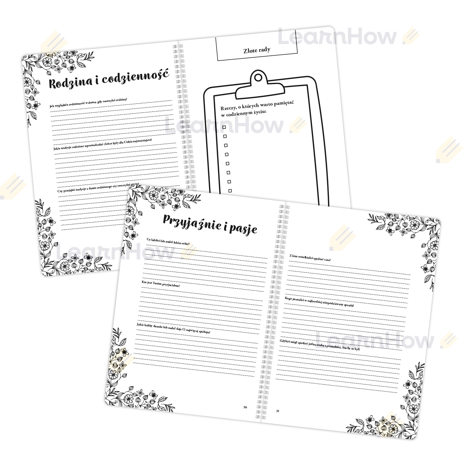W każdym rozdziale znajdują się przemyślane pytania, a w niektórych dodatkowe miejsca na zdjęcia, rysunki czy inne notatki, co sprawia, że wypełniona książka staje się absolutnie niepowtarzalna.