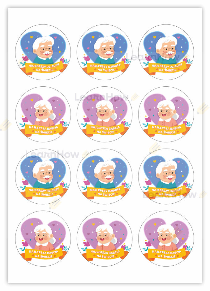 Może służyć jako naklejka na zaproszenie na przedstawienie lub odznaka dla najlepszego Dziadka oraz najlepszej Babci.