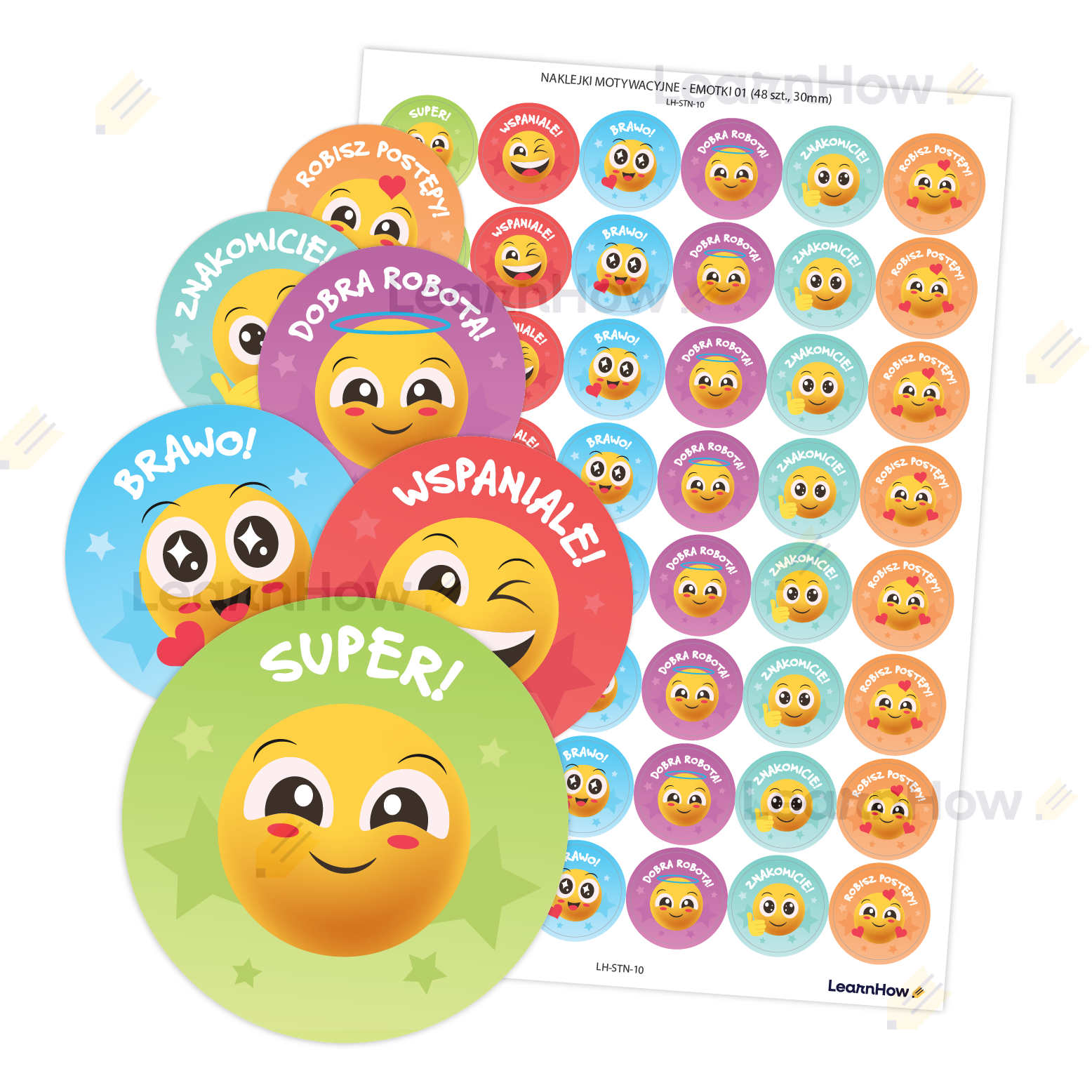 Zestaw 48 naklejek motywacyjnych z uśmiechniętymi emotkami idealne jako pochwała za wykonane zadanie, dobre zachowanie itp.