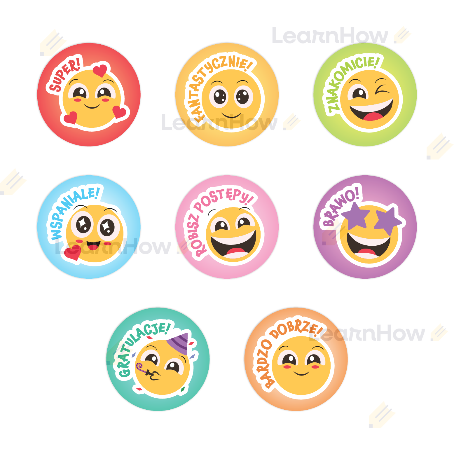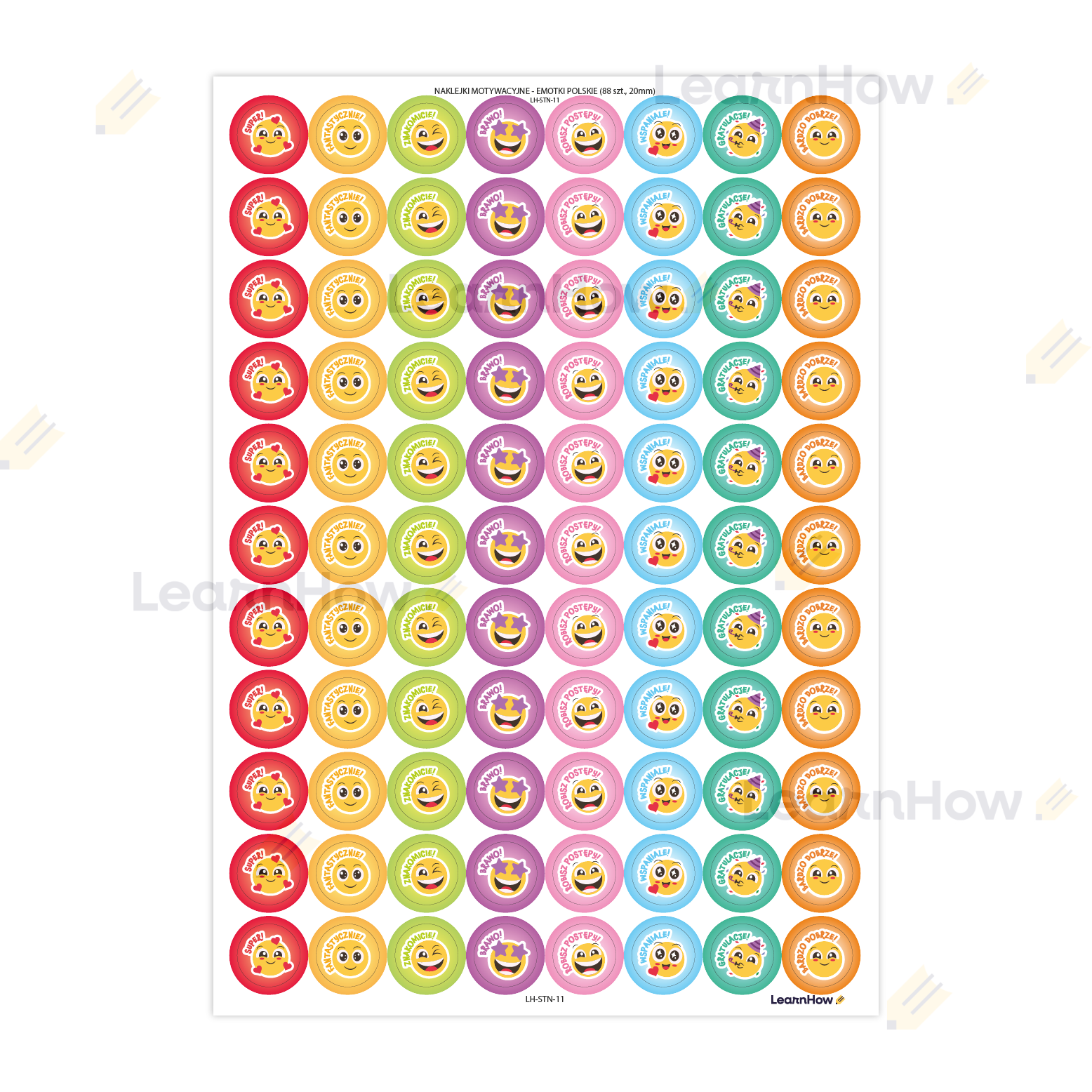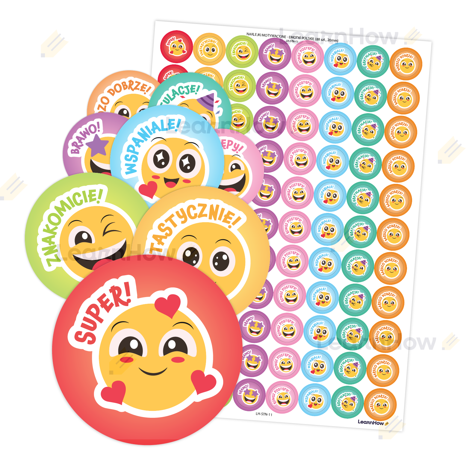 Zestaw 88 naklejek motywacyjnych z uśmiechniętymi emotkami idealne jako pochwała za wykonane zadanie, dobre zachowanie itp.