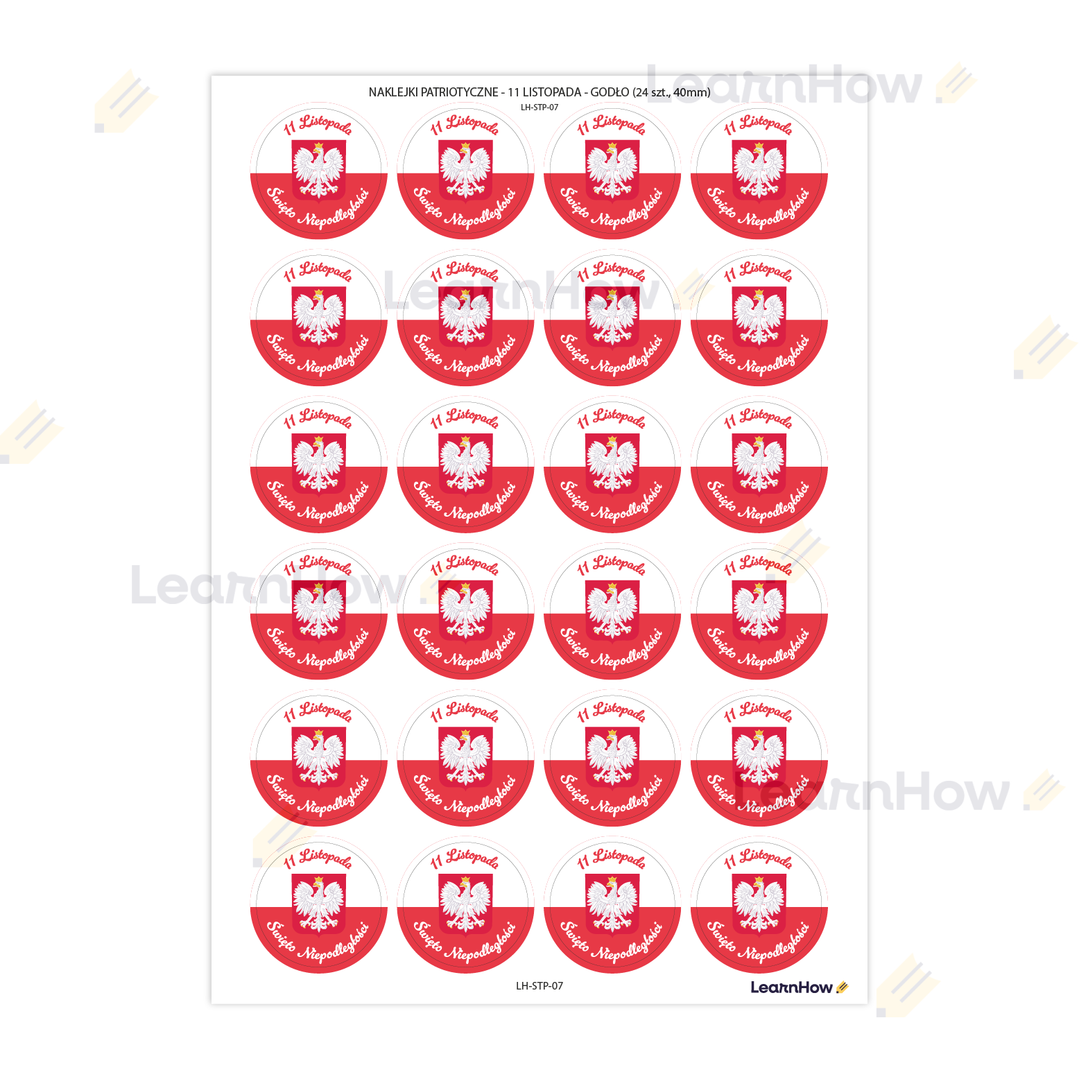 Zestaw 24 naklejek z godłem Polski i napisem "11 Listopada Święto Niepodległości - idealne jako odznaka, dekoracja podczas świętowania tej uroczystości patriotycznej!