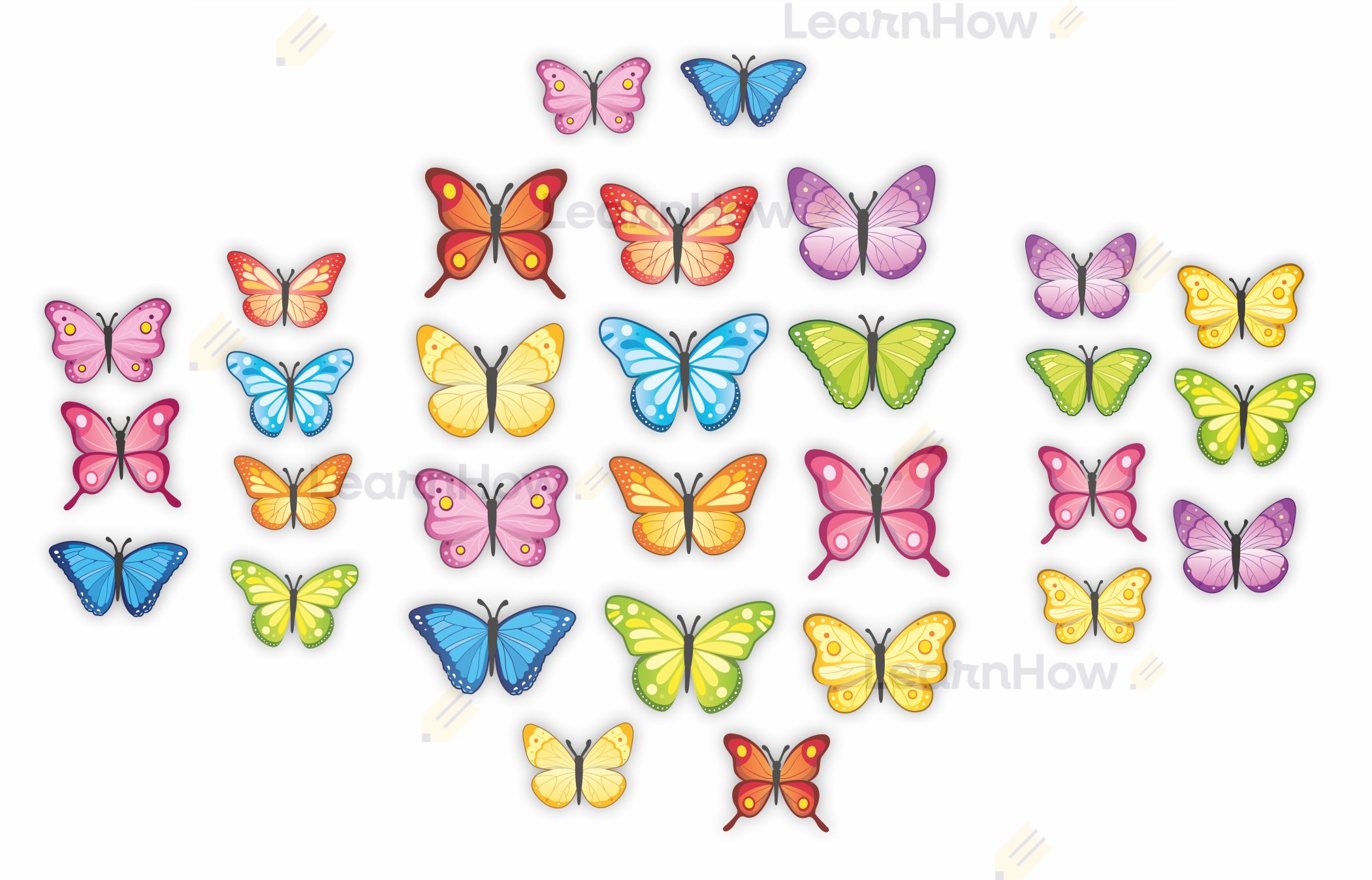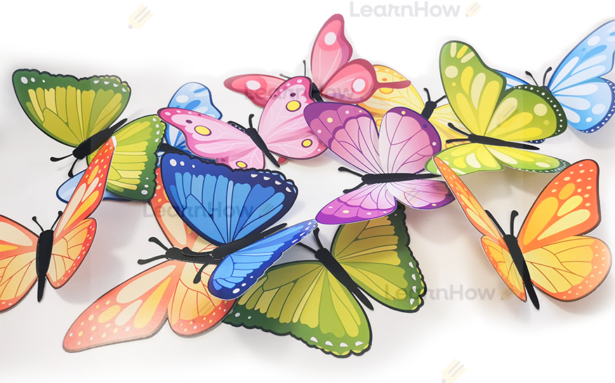 Zestaw składa się z 12 unikalny motylków - łącznie w zestawie motylków jest 30 - idealne do wiosennej dekoracji szkoły i przedszkola.