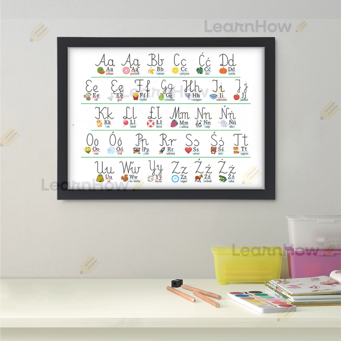 Zestaw składa się z łatwiej do montażu dużej drewnianej ramki oraz plakatu z kolorowym alfabetem.